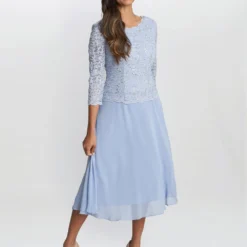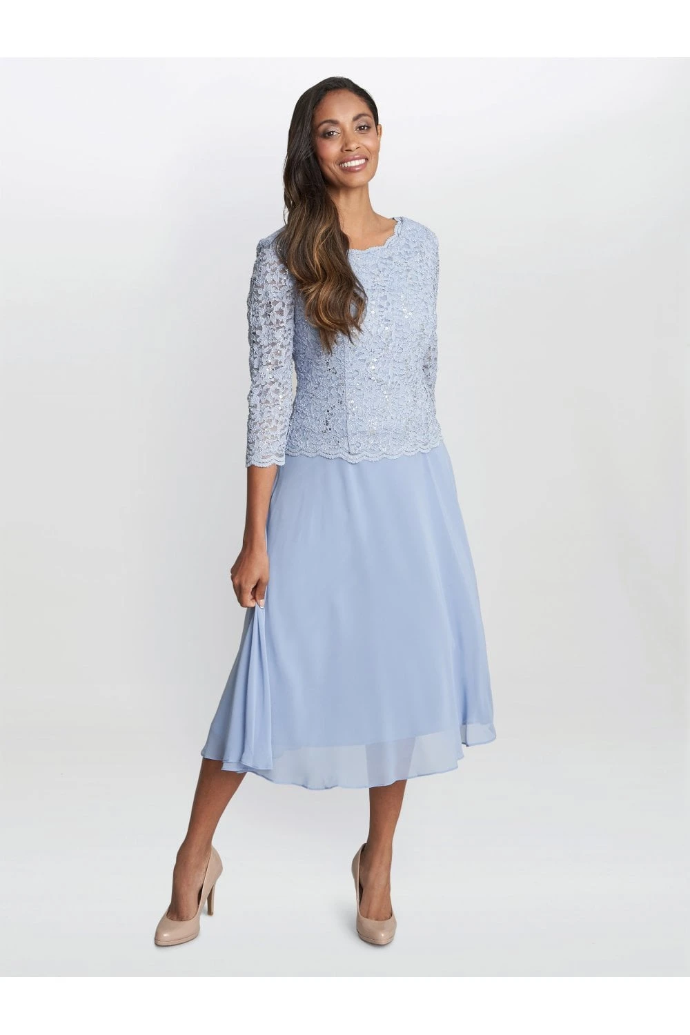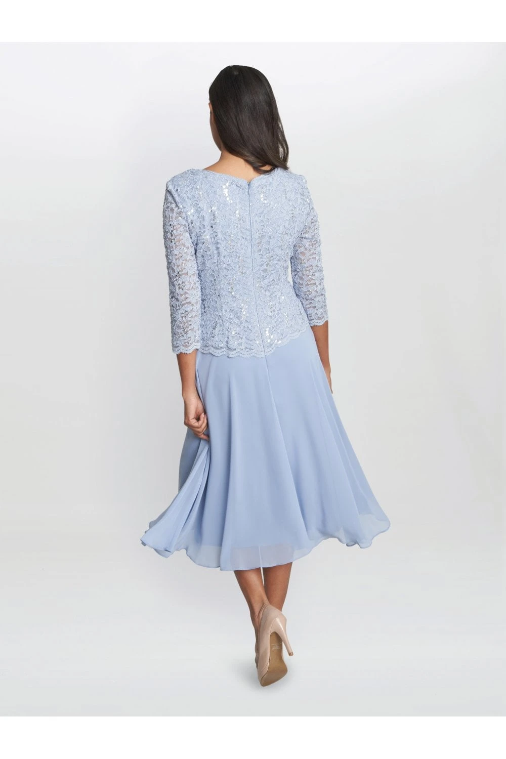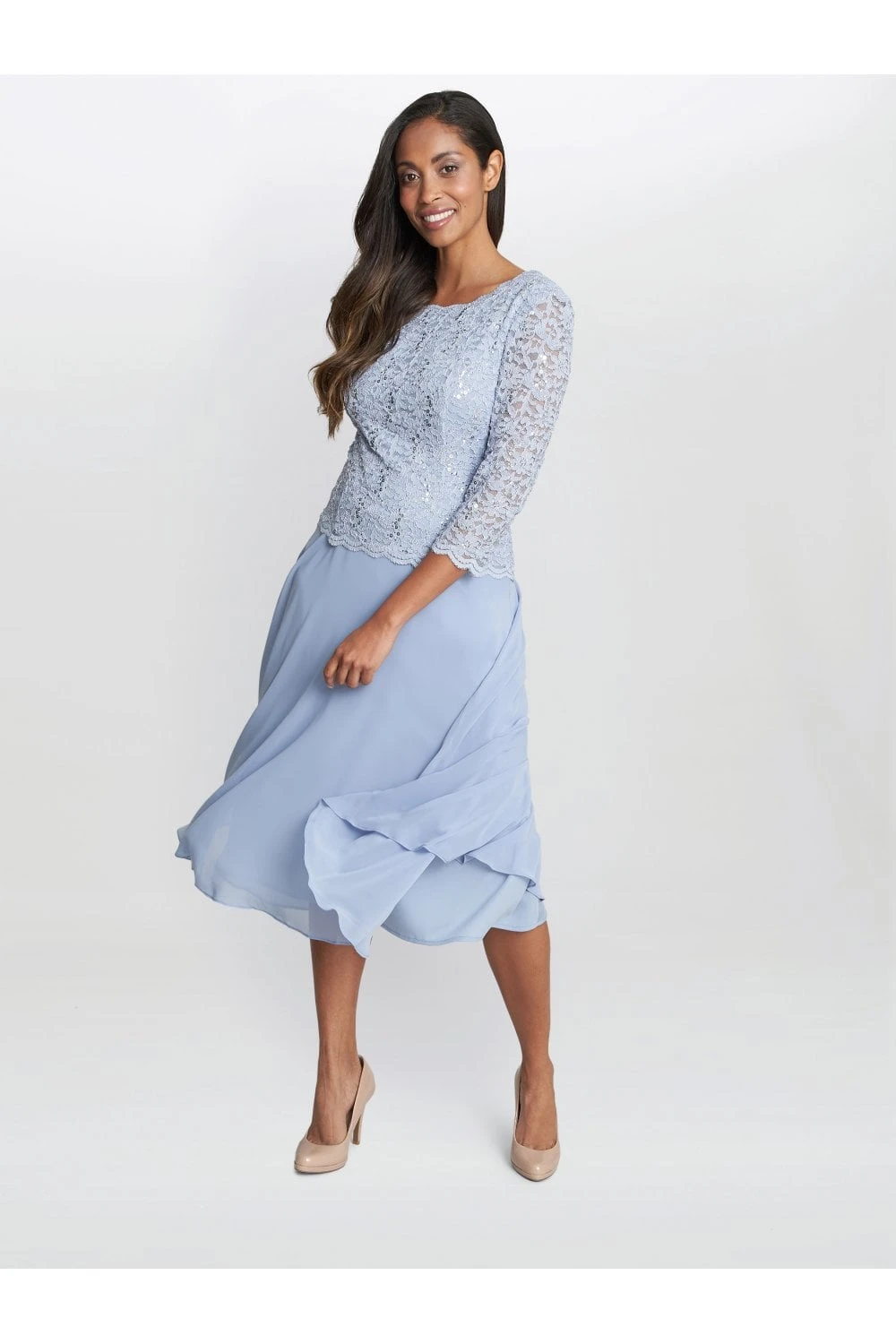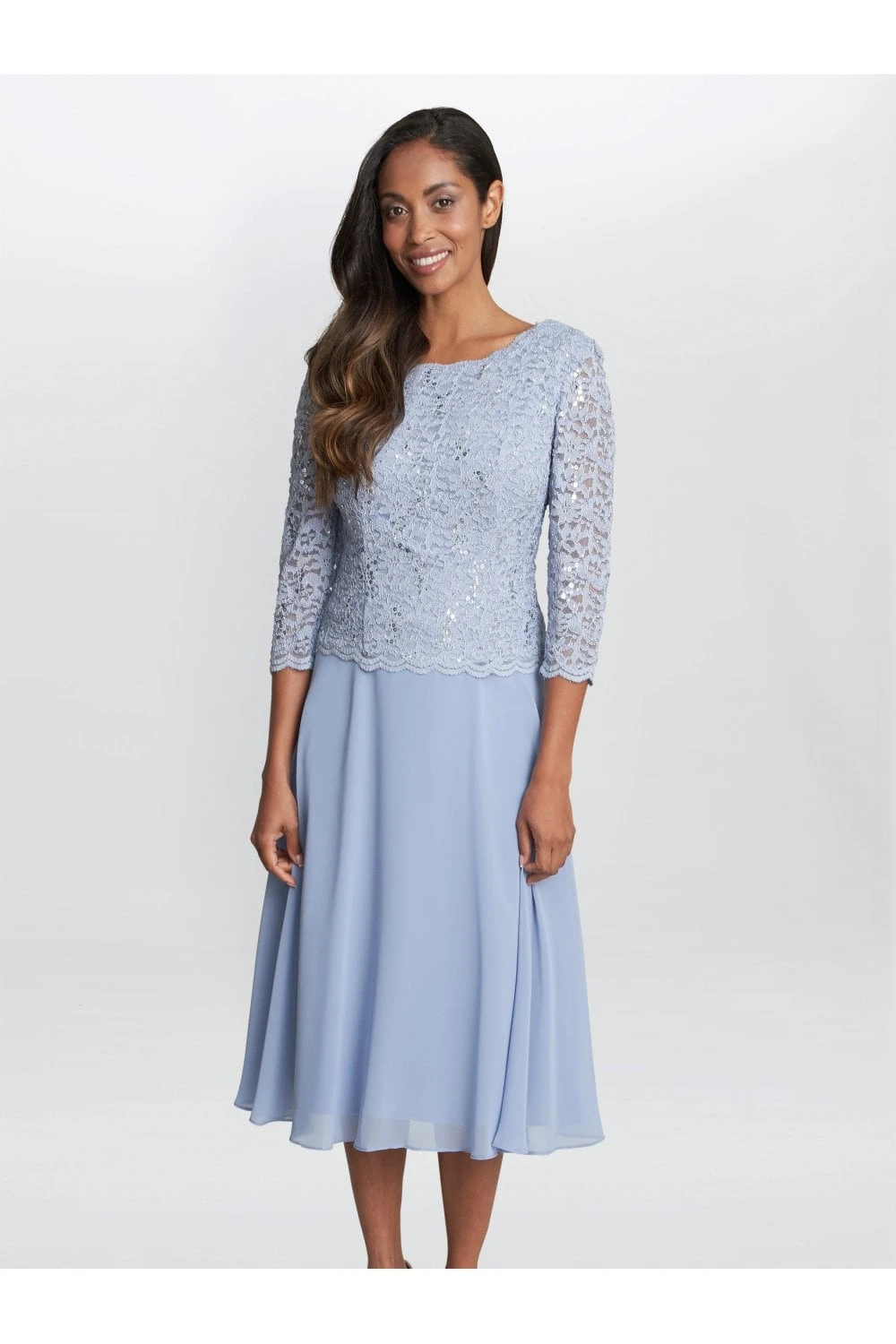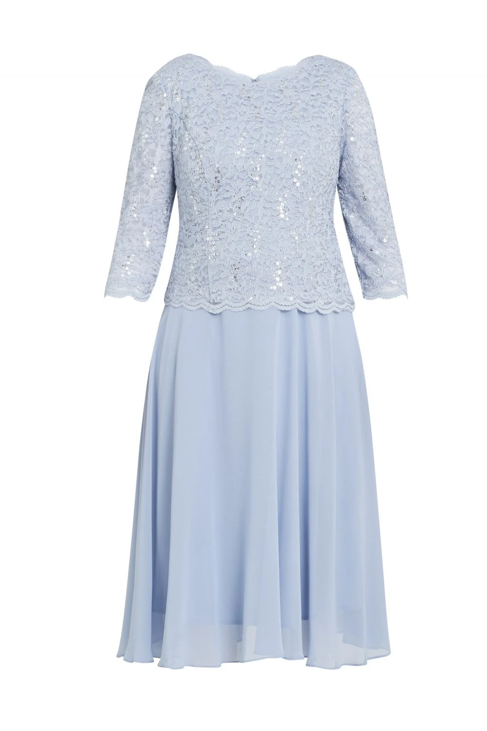 This midi-length mock 2-piece cocktail dress is the picture of elegance with sheer lace 3/4 sleeves, silky chiffon skirt & scalloped lace edges. Perfect for Mother-of-the-Brides (& Grooms)!Â