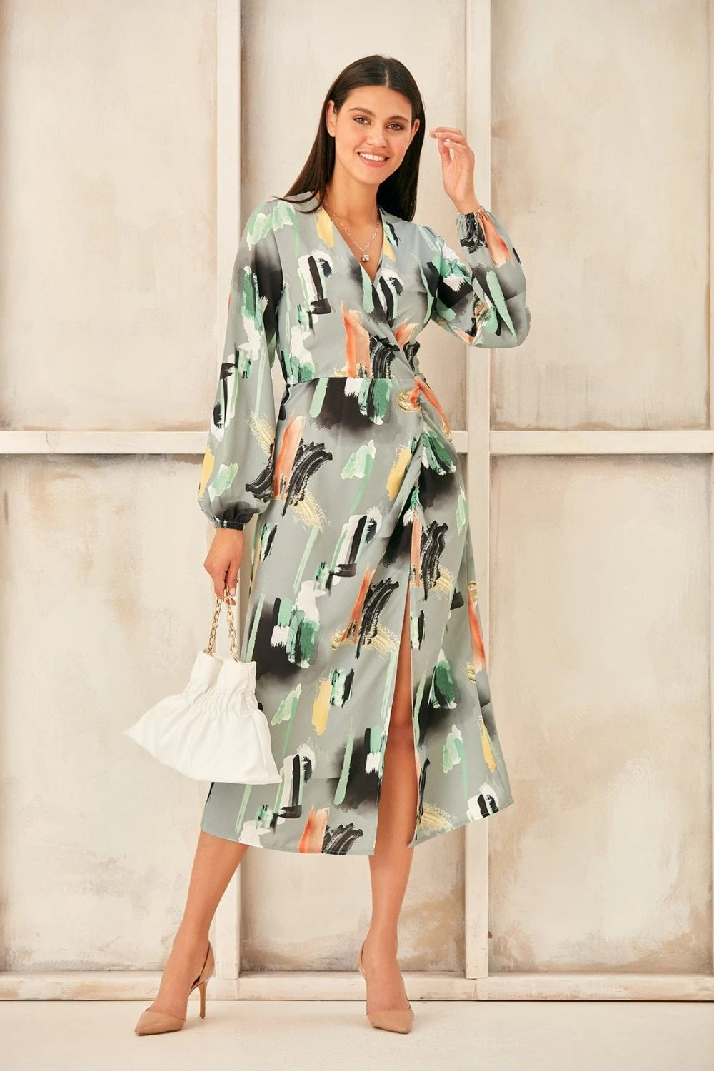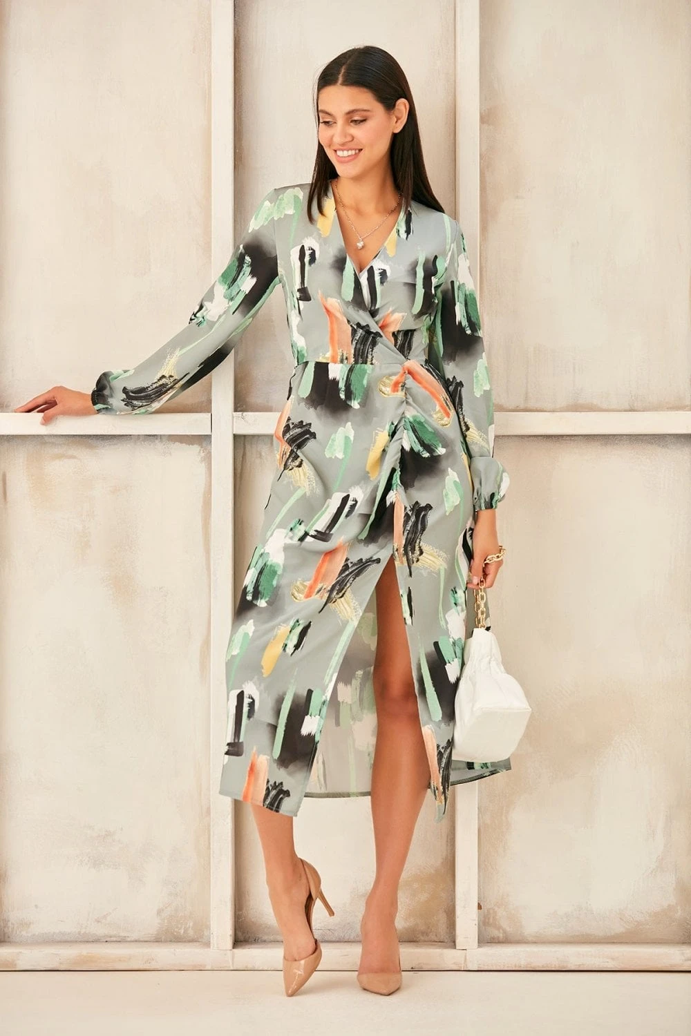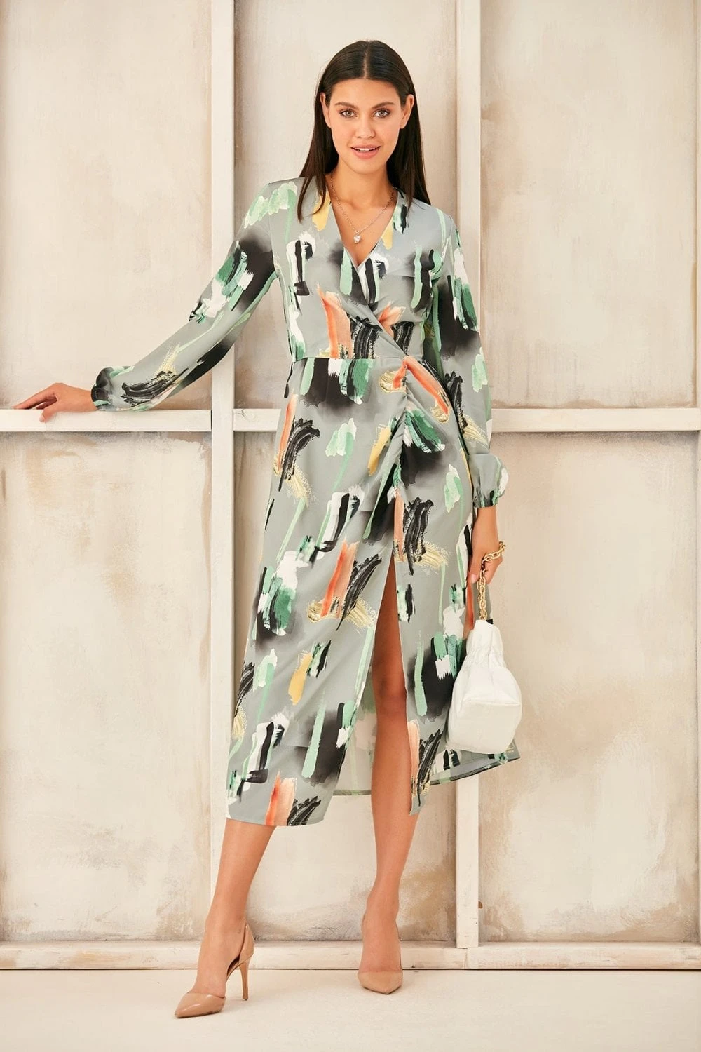 Wrap Long Sleeve Midi dress with Drape detail and side slit. Wear as party dress, evening dress, occasion dress or cocktail dress and get all compliments to yourself. Style with high heels and accessories  for chic look.