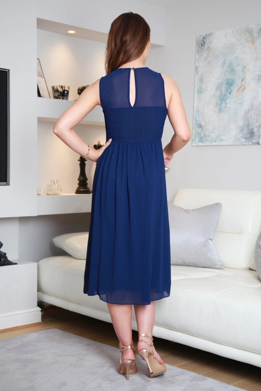 This sleeveless lace dress boasts a gathered chiffon skirt, a lace body and round neckline with sweetheart lining. It is midi length, has a shirred elastic back and is finished with an elegant keyhole opening.