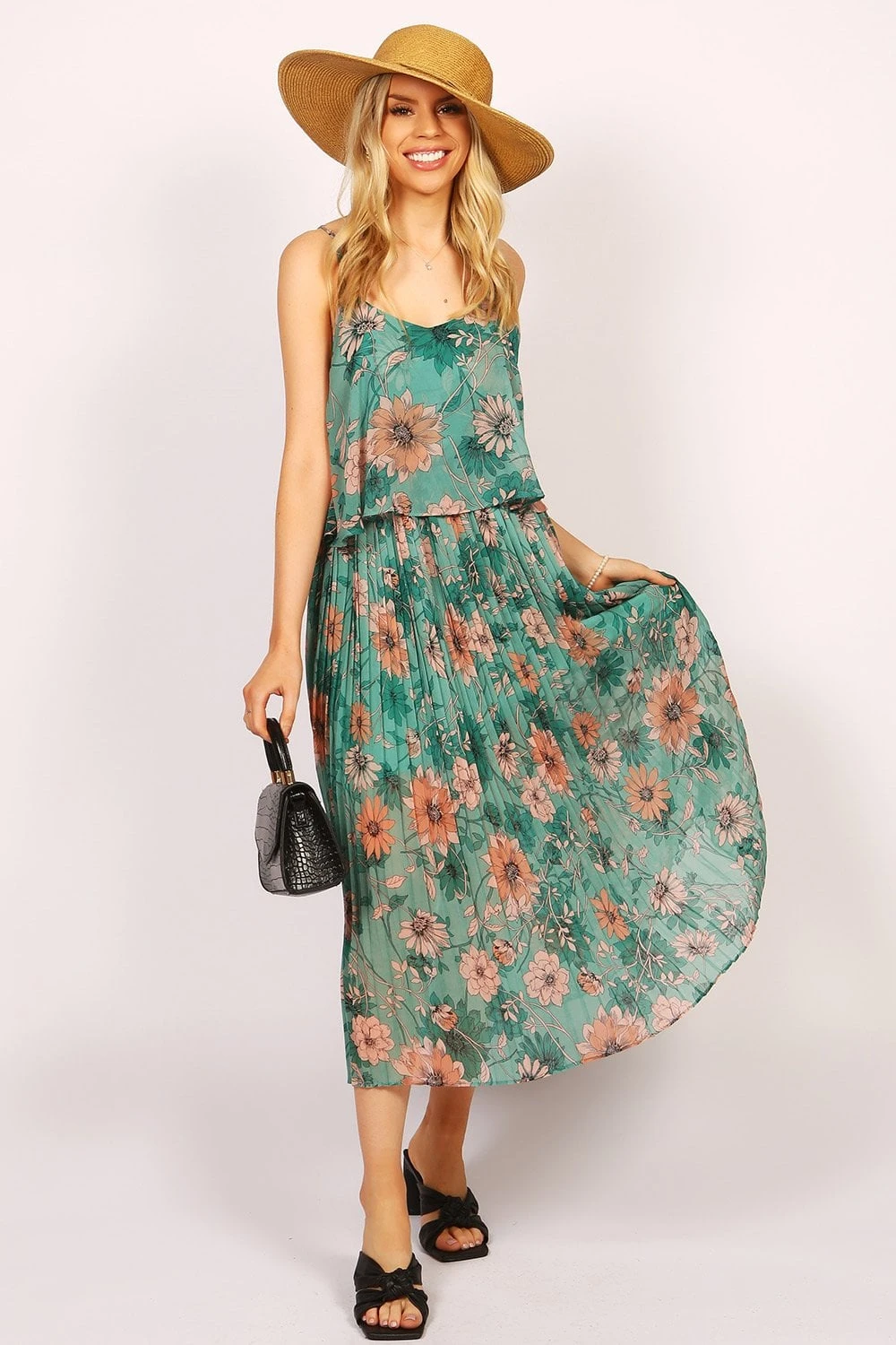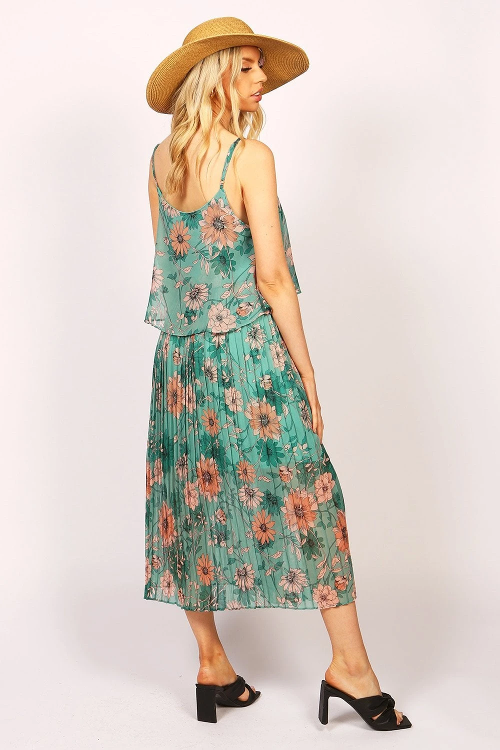 This cami midi length chiffon dress has adjustable straps and a layered top. Made from a lightweight chiffon material, this dress showcases a pleated skirt, double layered bodice and a stunning green tropical flower print all over. Pair with sandals or heels for a polished look.