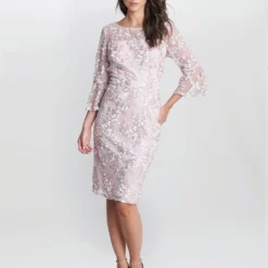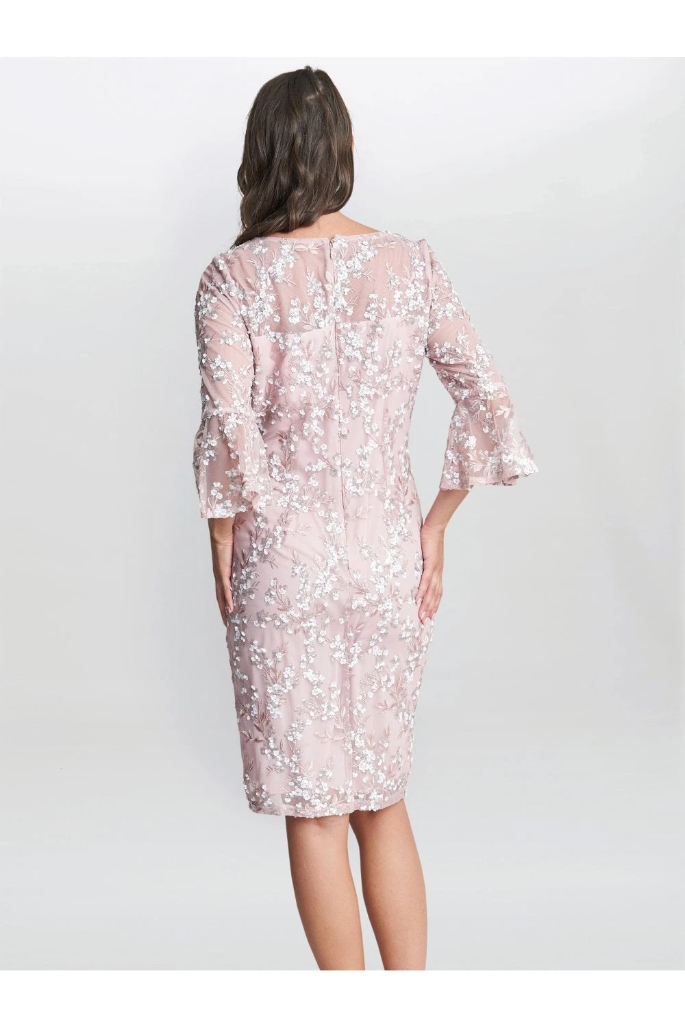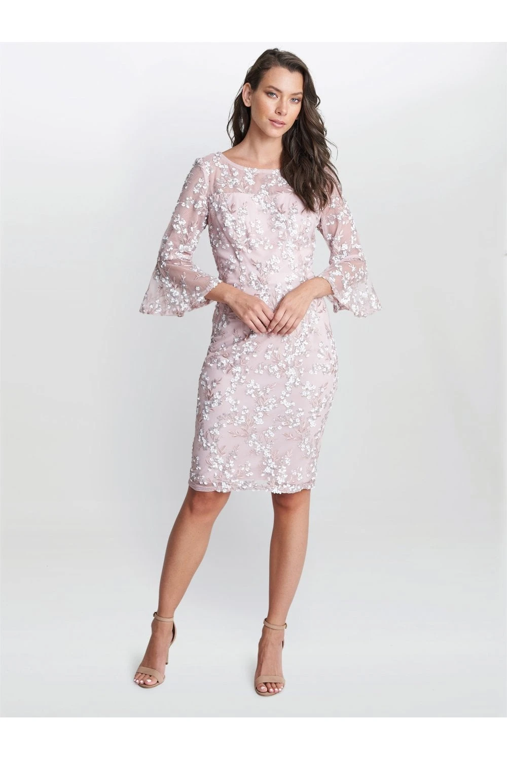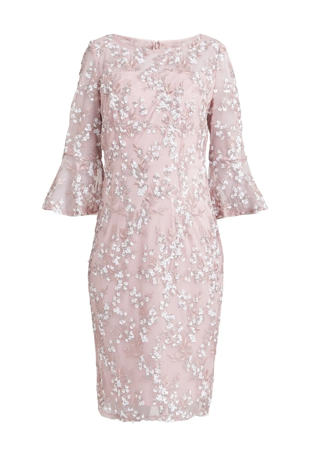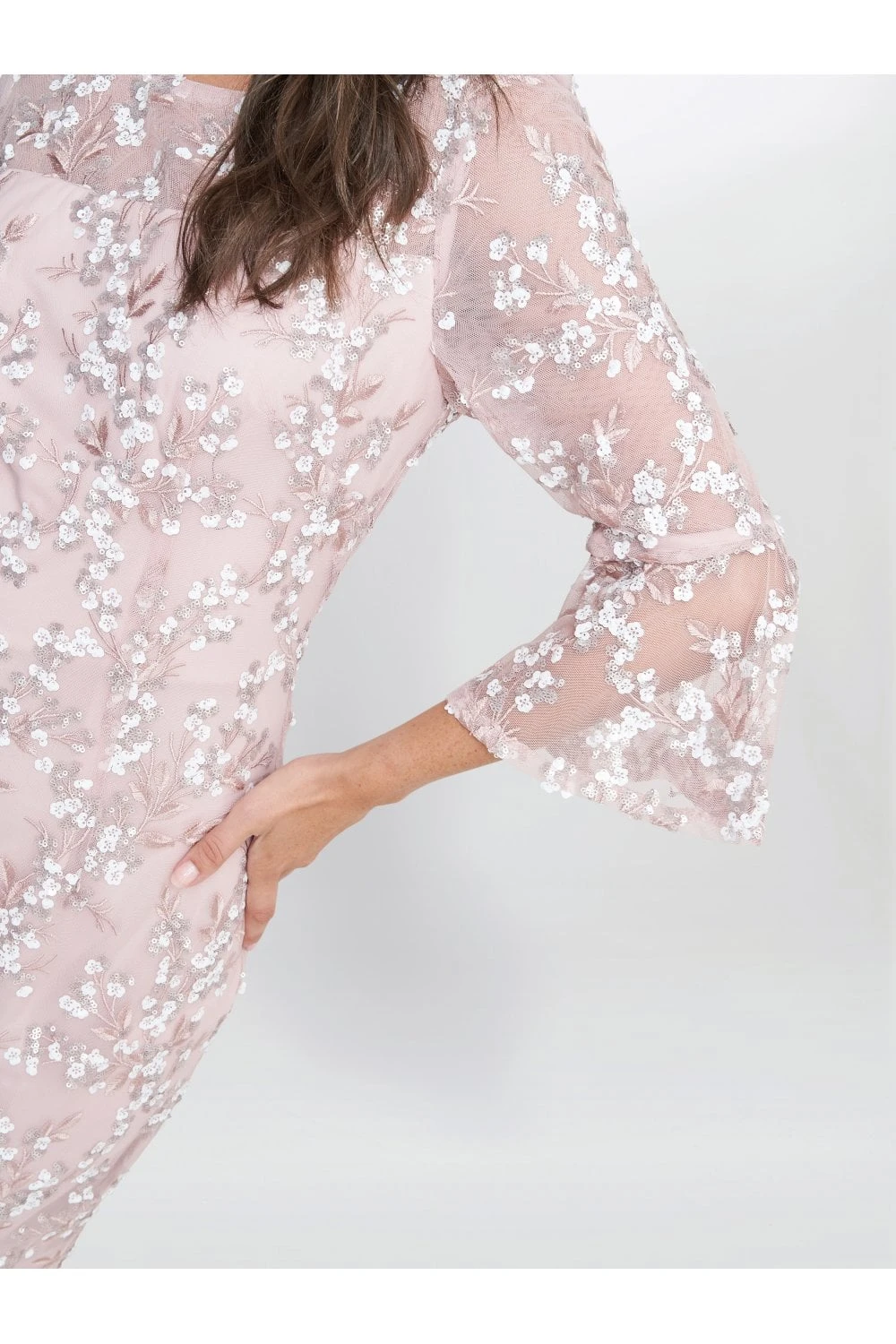 This beautiful sequin and bead embroidered shift dress has a sheer yoke and an elegant fluted 3/4 sleeve. Offering elegance, style and coverage.Â