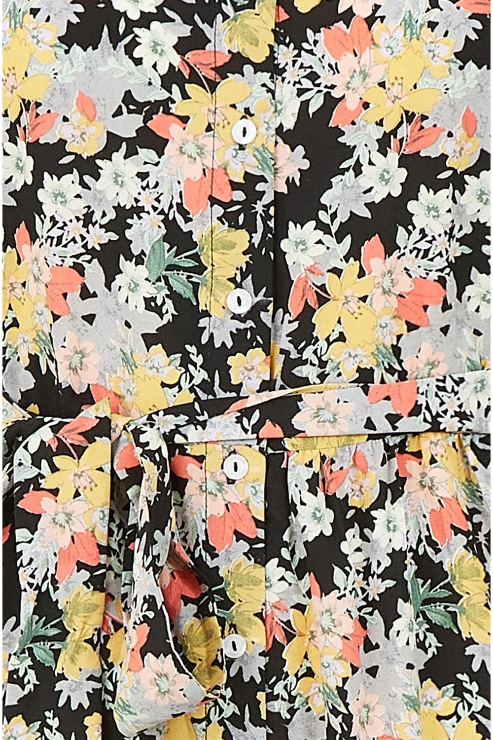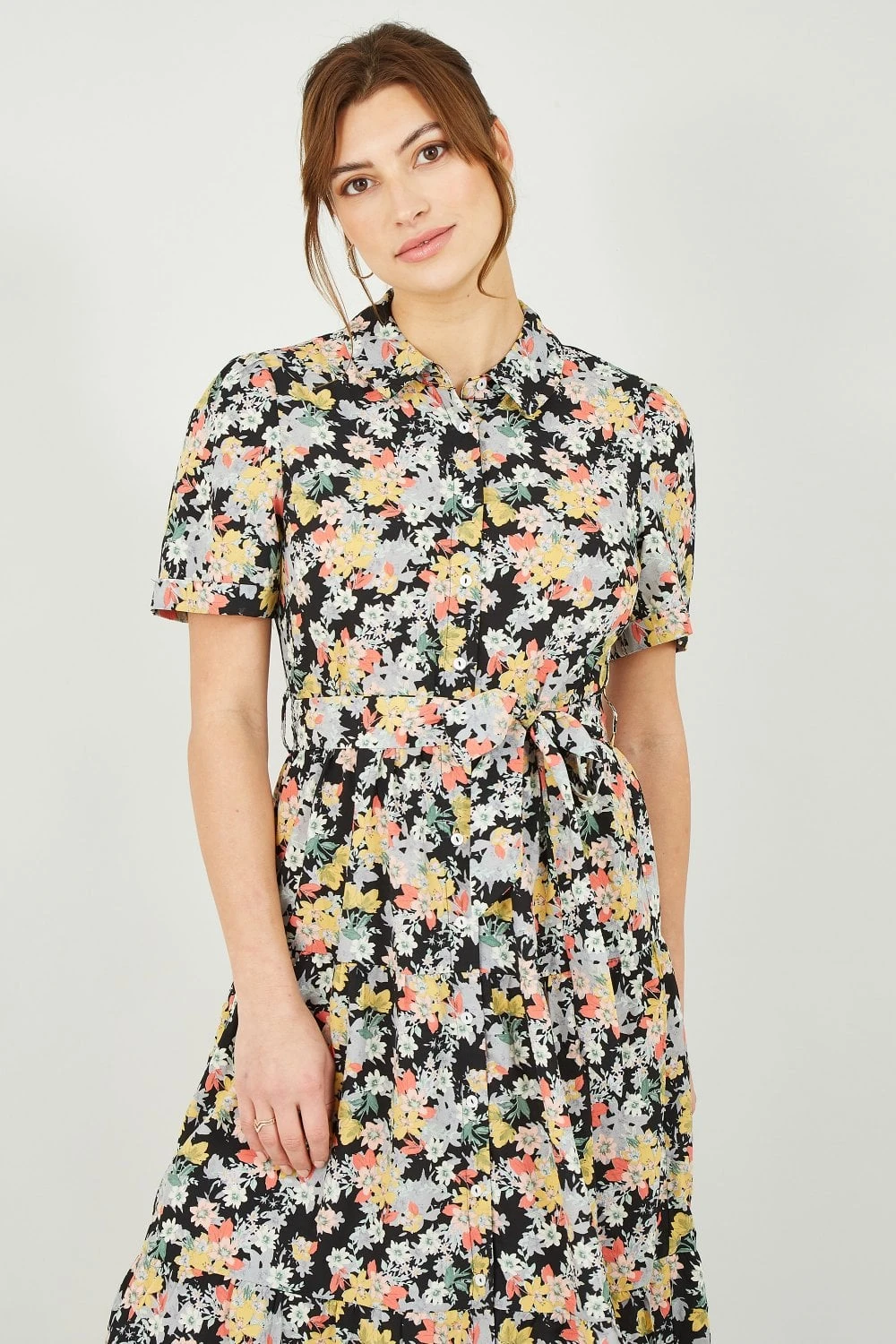 A gorgeous colourway with an all-over ditsy floral print. This Yumi Black Floral Midi Dress has it all. Featuring a stunning shirt style, button up collar, a thick waist belt and relaxed short sleeves, this ankle skimming midi dress blends hues of pinks, blues, and yellow on a black base. A flattering and timeless new season style.