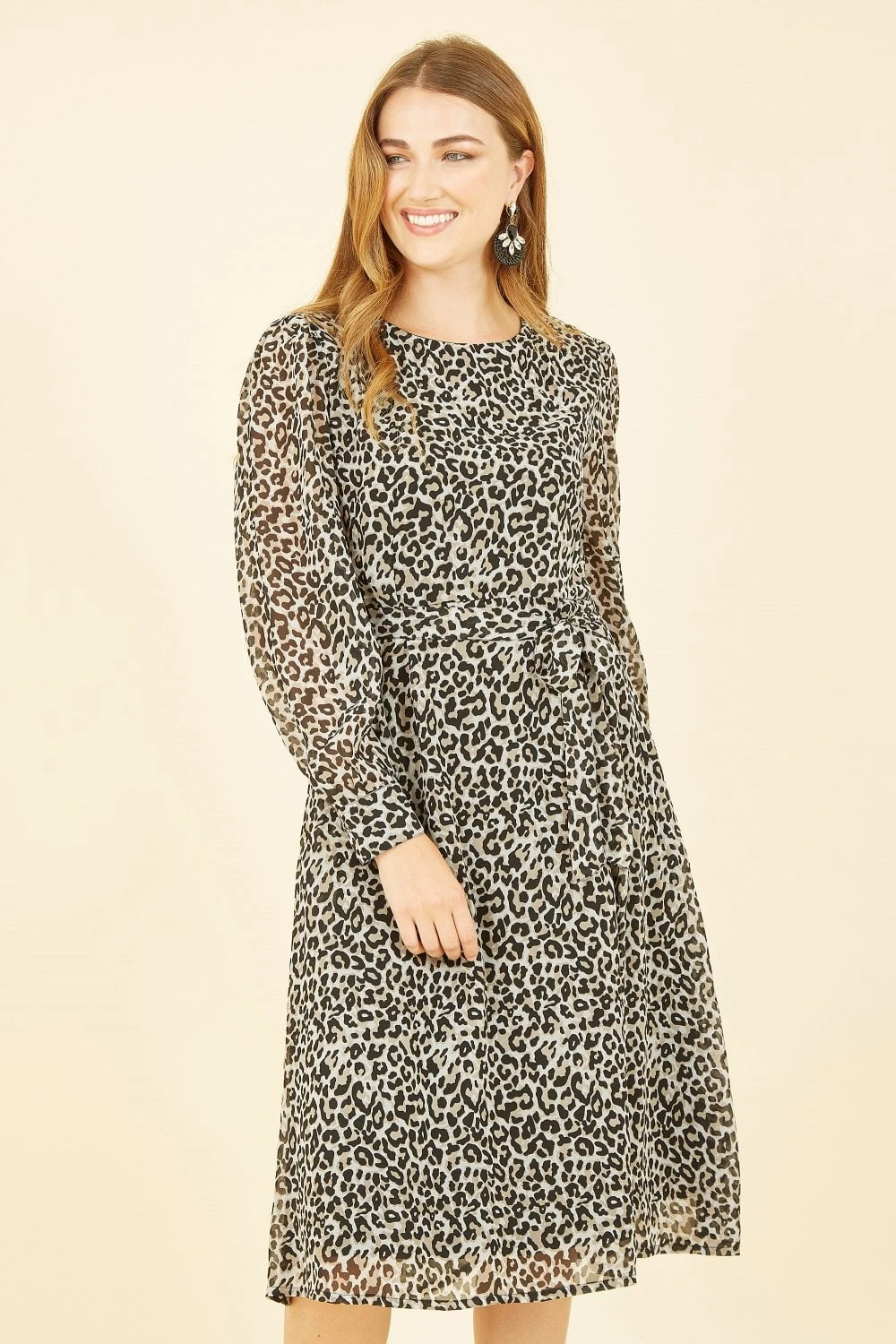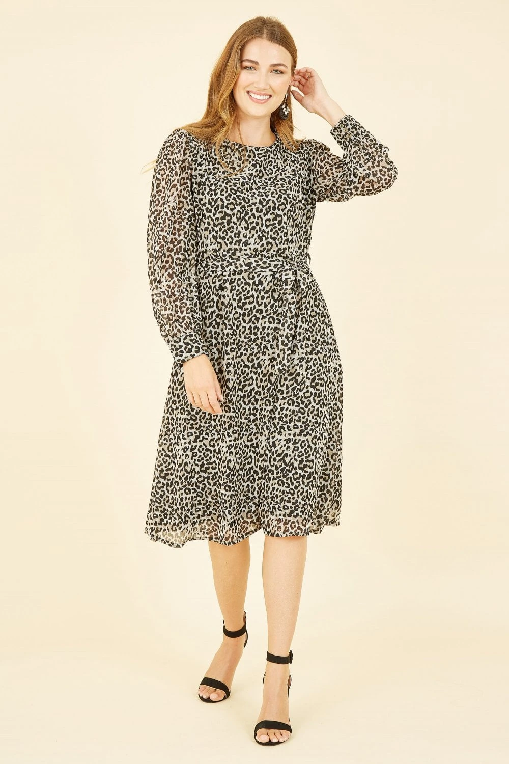 Step out in style in this season must have leopard print. This long sleeve skater dress, with self tie waist is a staple that will take you from work to weekend with ease. With a round neckline and concealed zip in the back, we love this piece paired with tights, boots and a oversized blazer.
