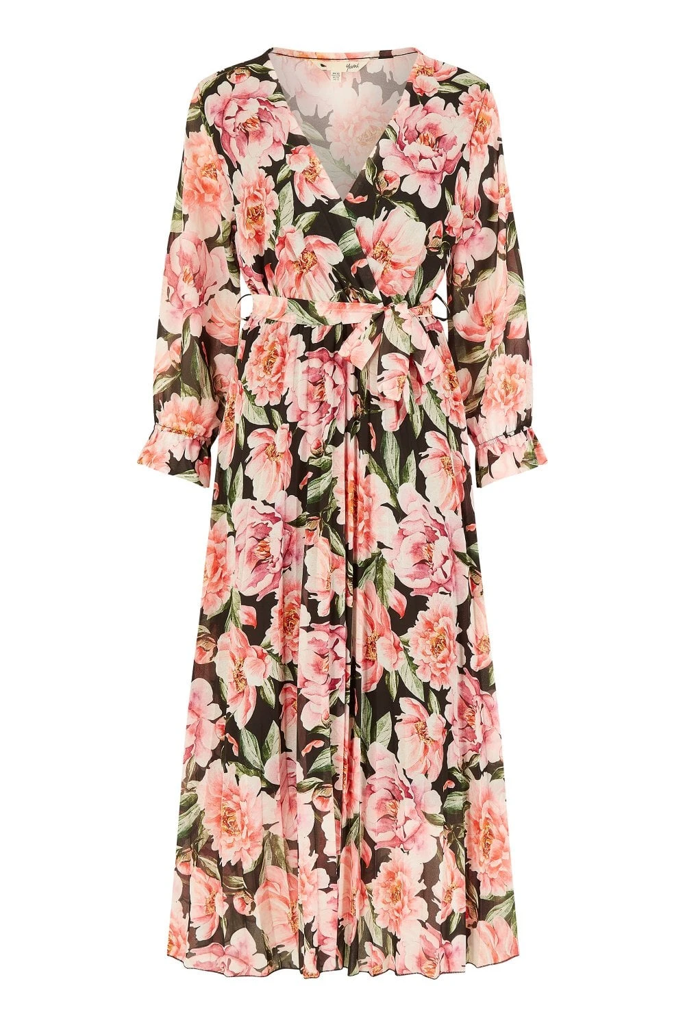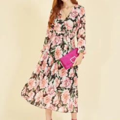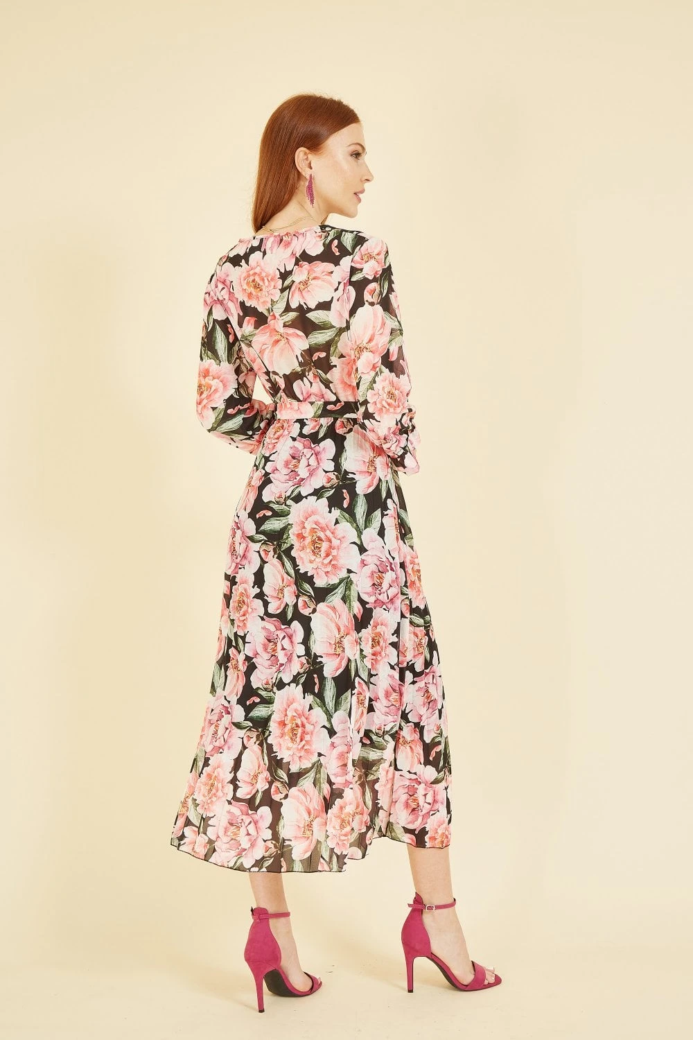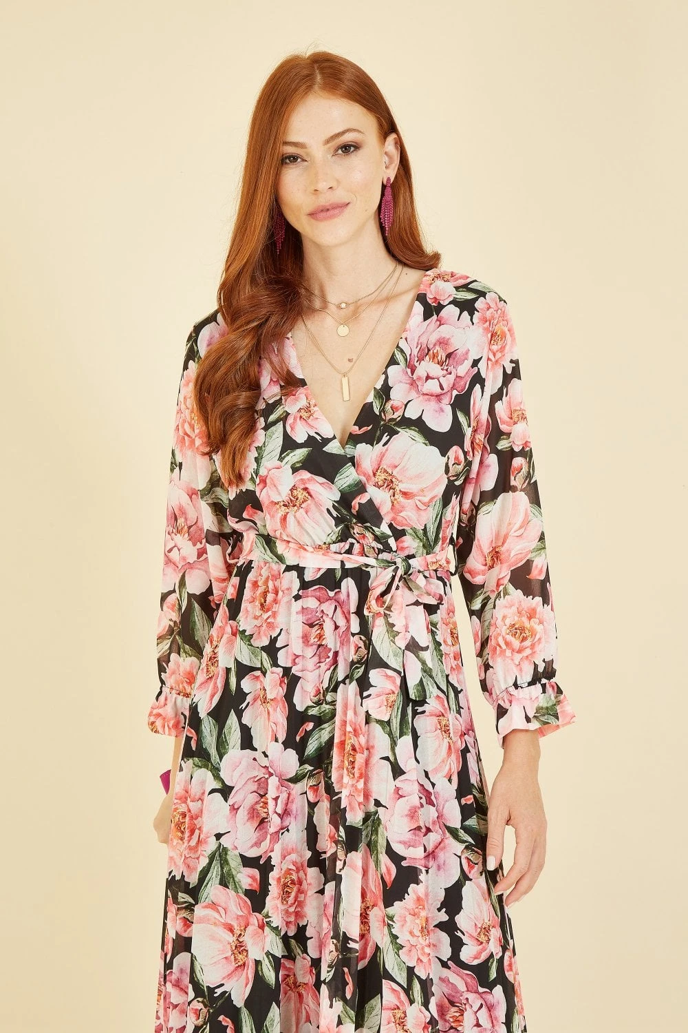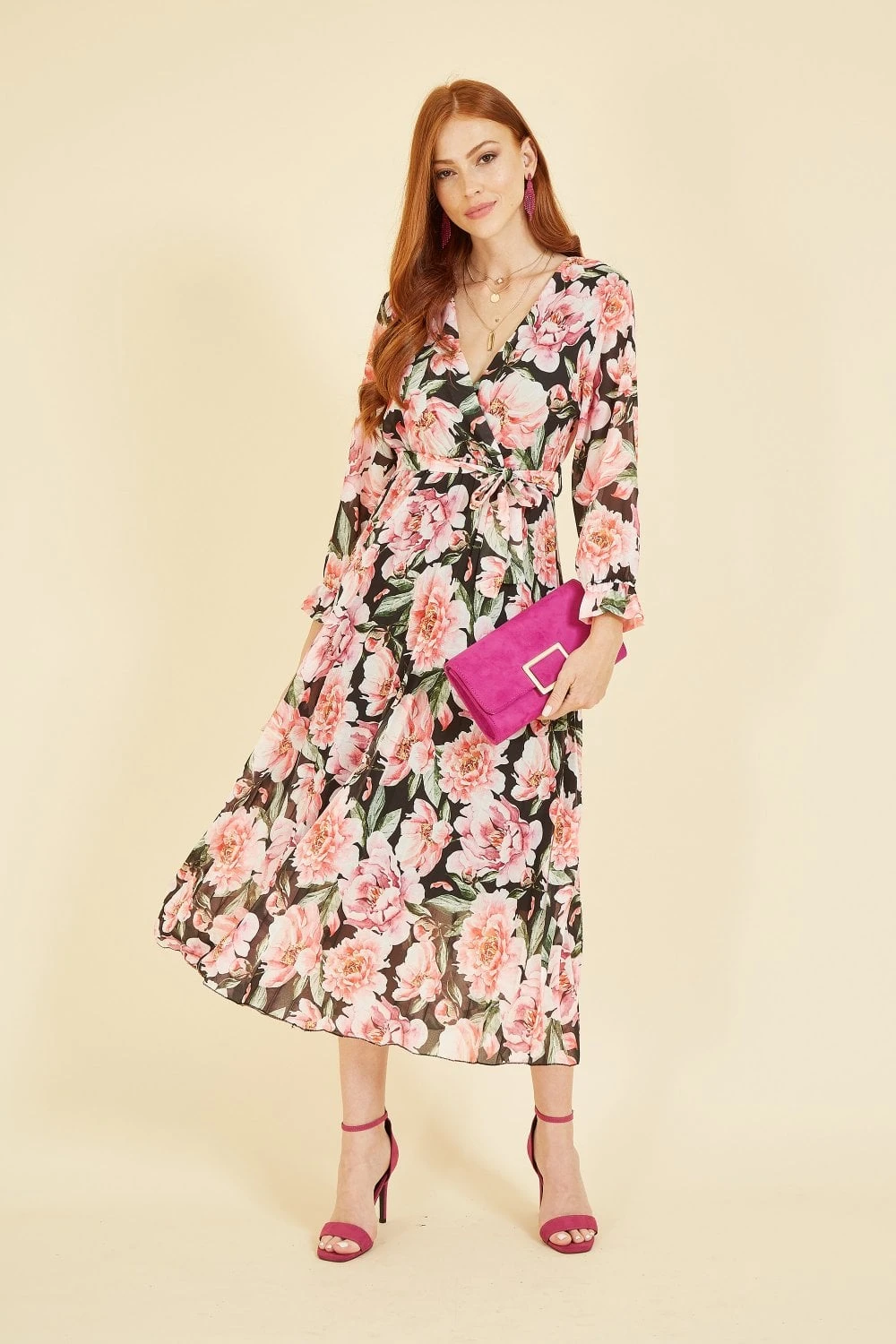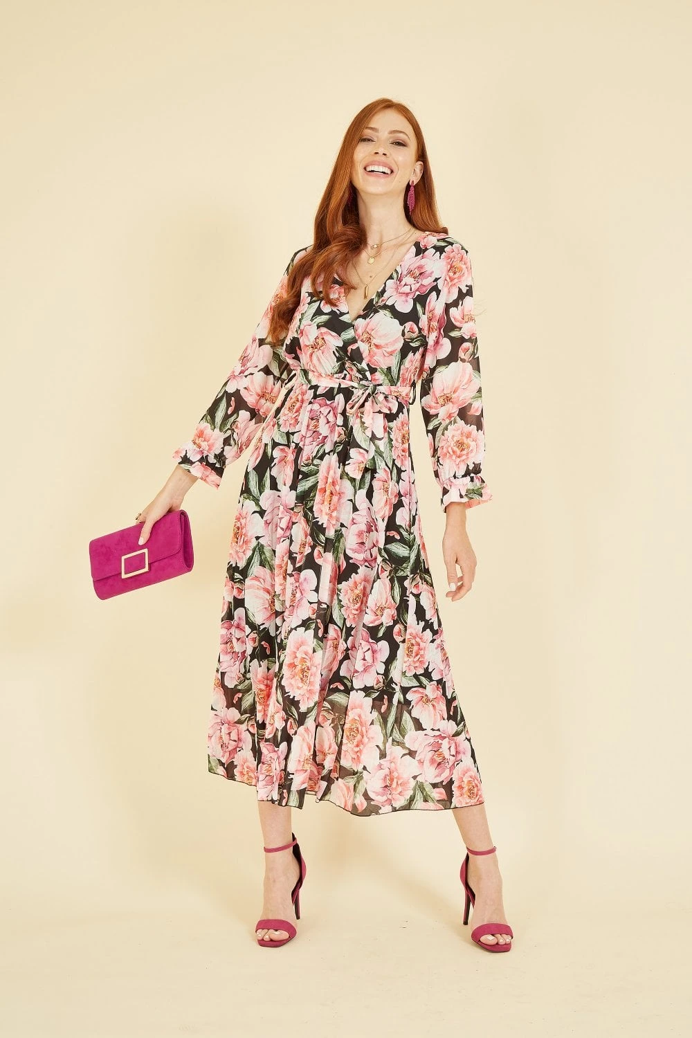 Life live through rose tinted glasses in this midi dress from Yumi. The long sleeve wrap dress shape is the perfect way to showcase the oversize rose print. The overall silhouette of this stunning piece is enhanced with a self tie waist and the flowy chiffon fabric gives it an elegant feel. Perfect for end of season weddings.