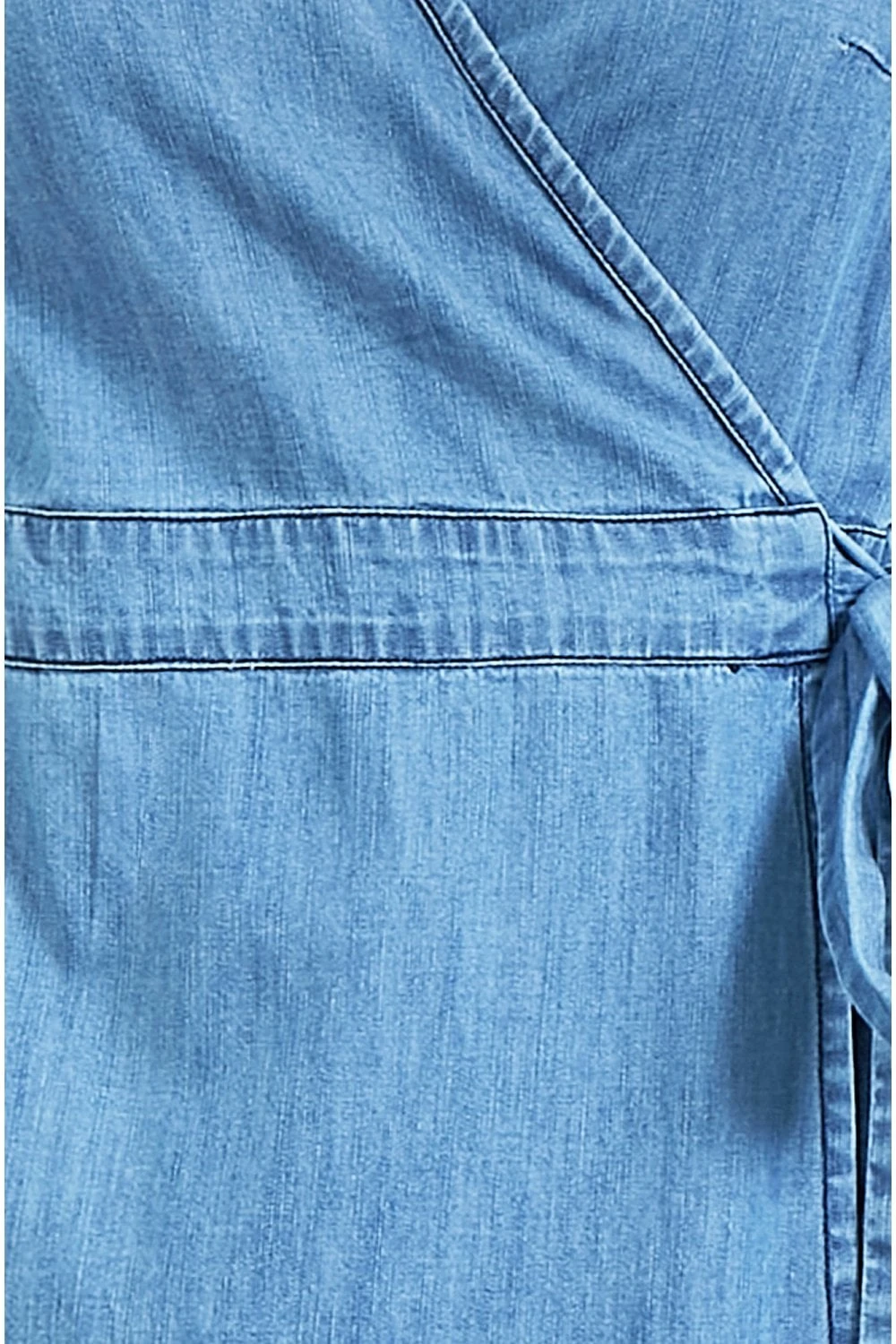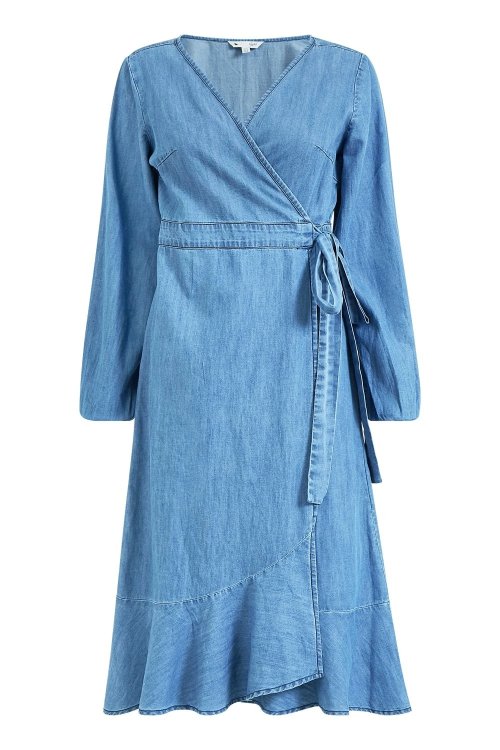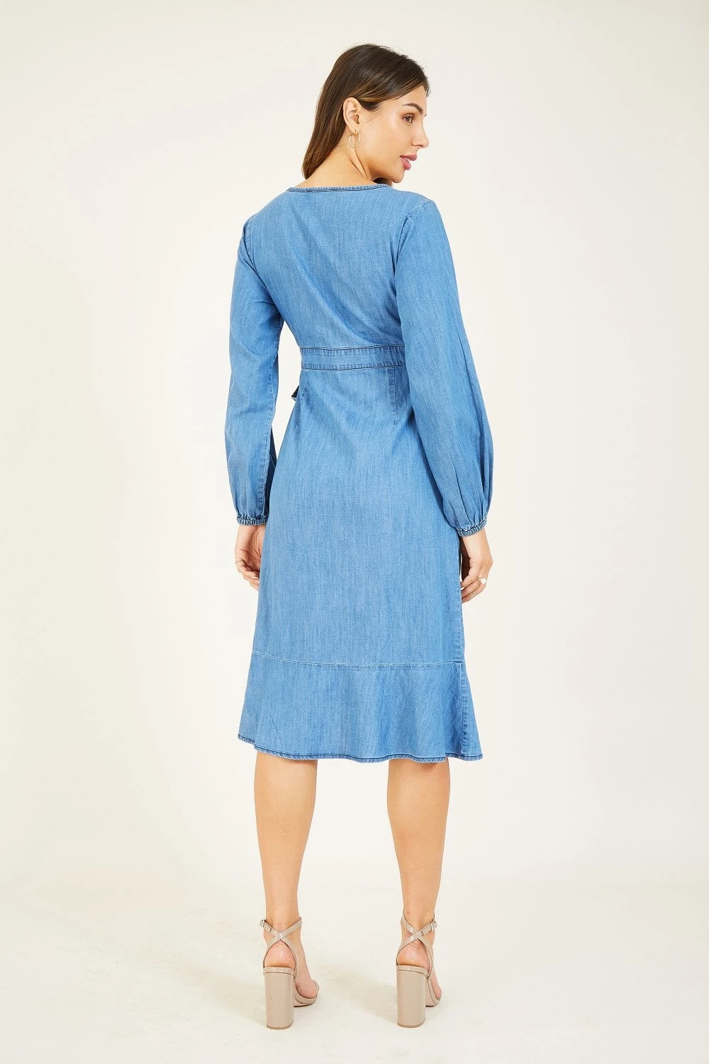 The ultimate rival for your favourite pair of jeans, our Yumi Denim Long Sleeve Wrap Dress is designed in the classic smart-casual style. Made from pure cotton, it features a tie front, a V-neckline, and a flippy hemline. Lending a versatile look to your collection, this light wash denim is perfect for the warmer climates.