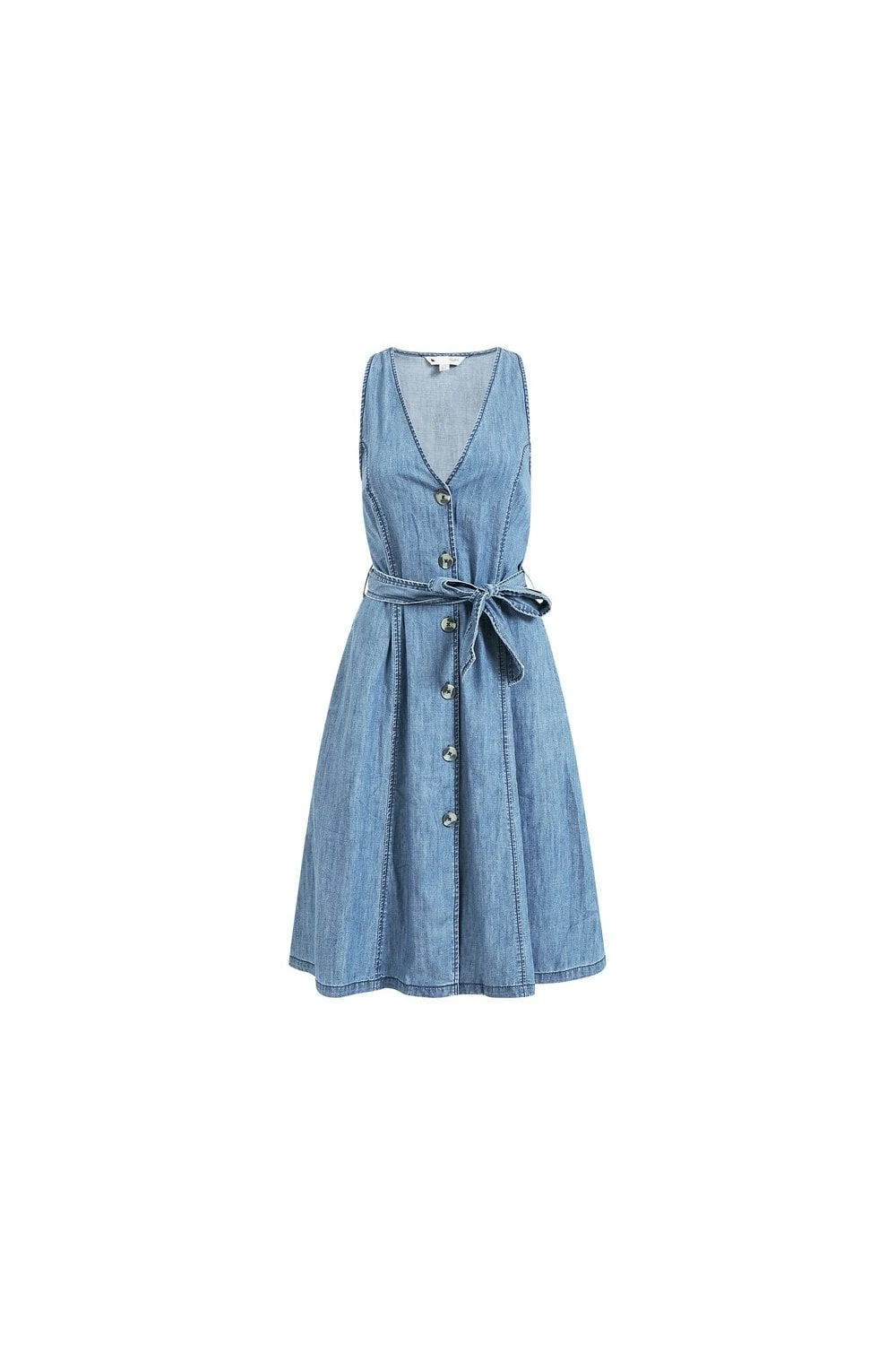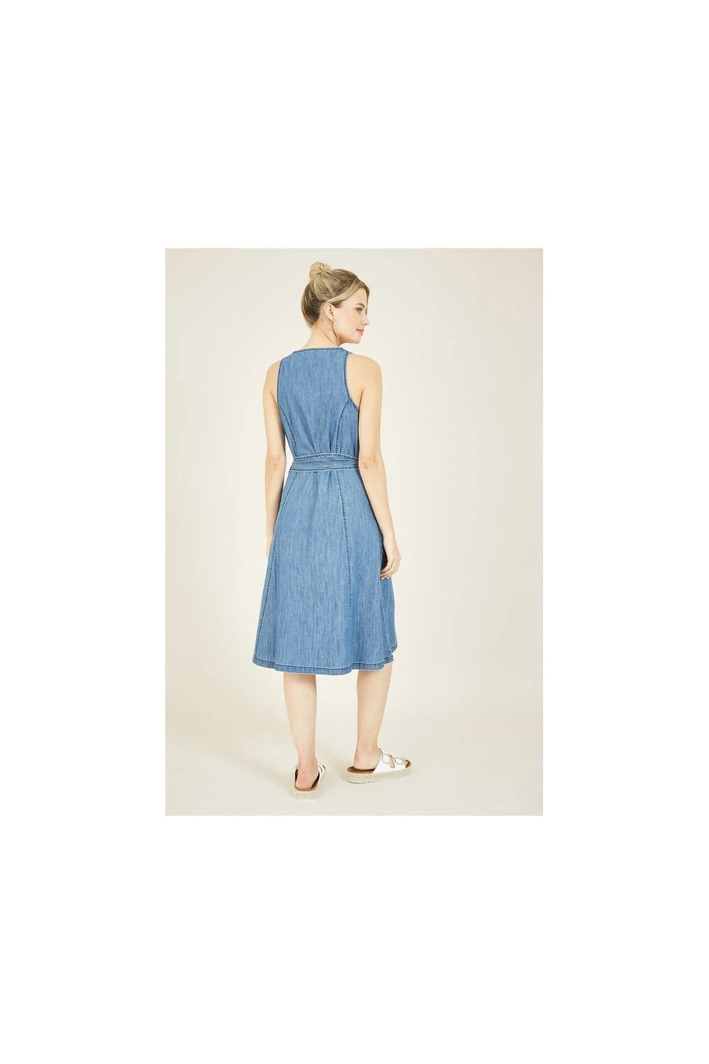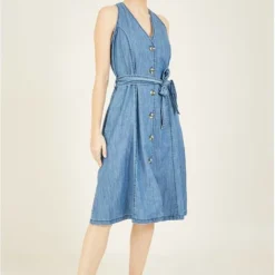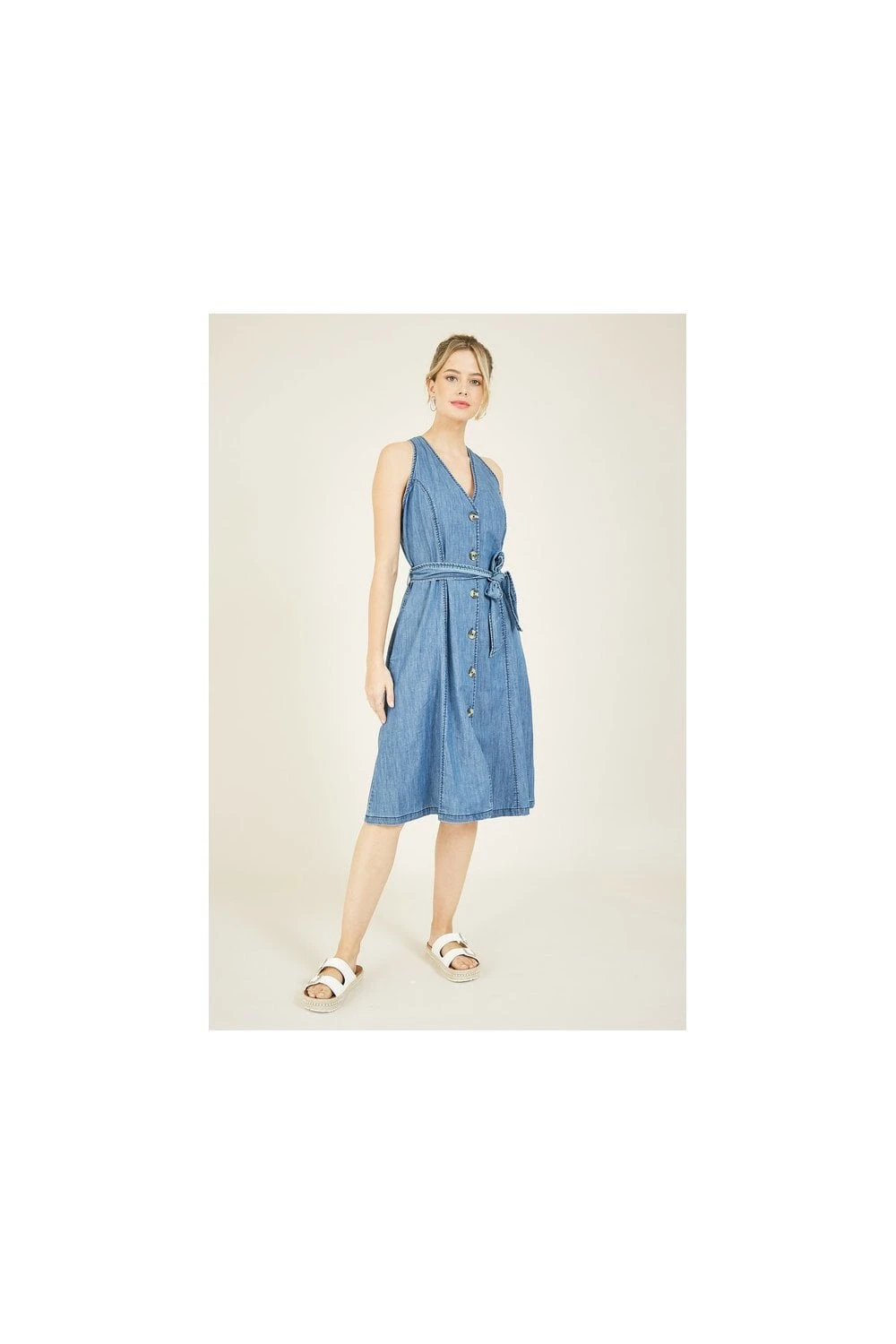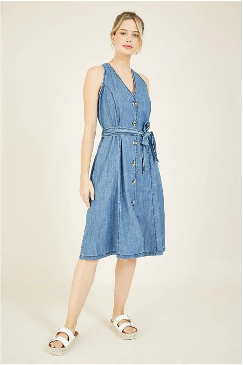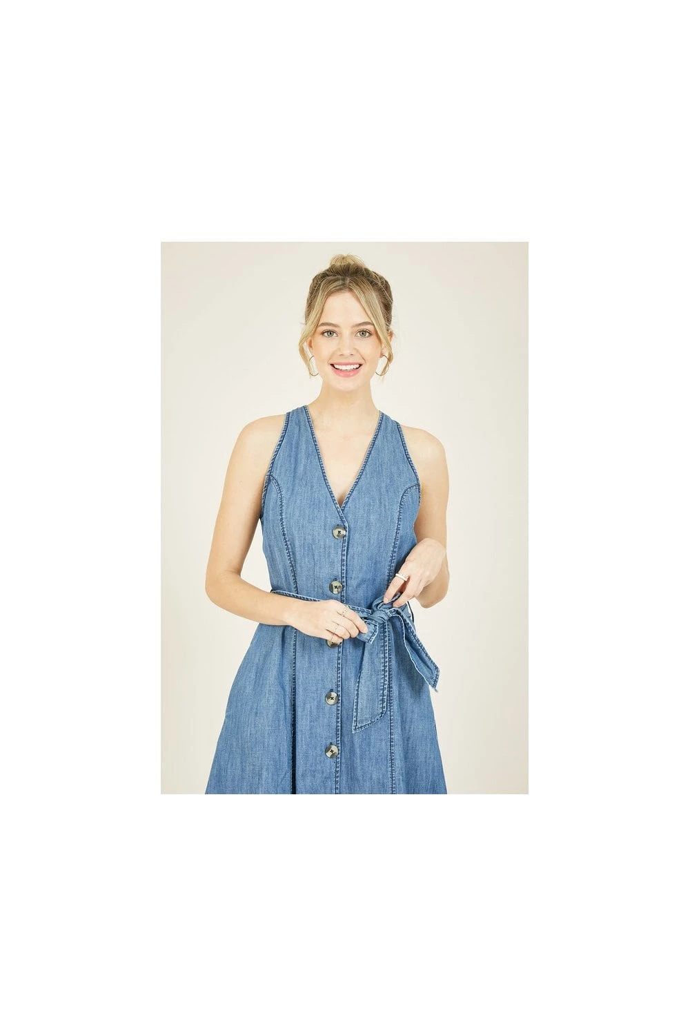 In an easy style you’ll wear over and over, this Yumi Denim Summer Dress shows off a laidback design. Featuring a sleeveless bodice framed by a V-neckline, buttons run down the front for a casual feel. Below, the self-tie waist is styled to enhance your profile, whilst the flippy skirt provides balance. This versatile piece is designed with lightweight denim chambray that’s crafted from pure cotton, so it’s not just soft and supple, it’s natural too.