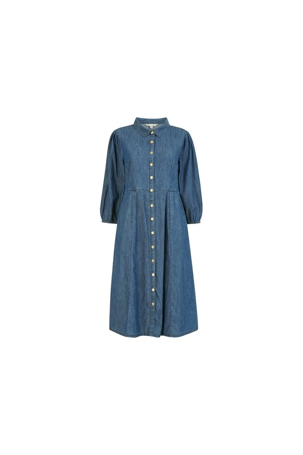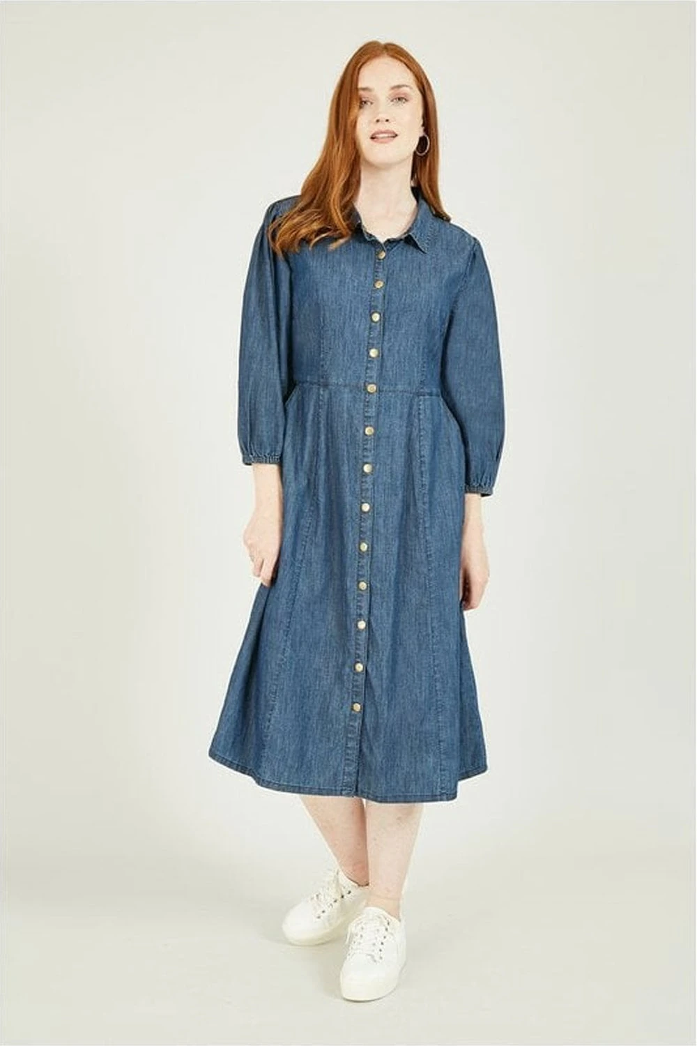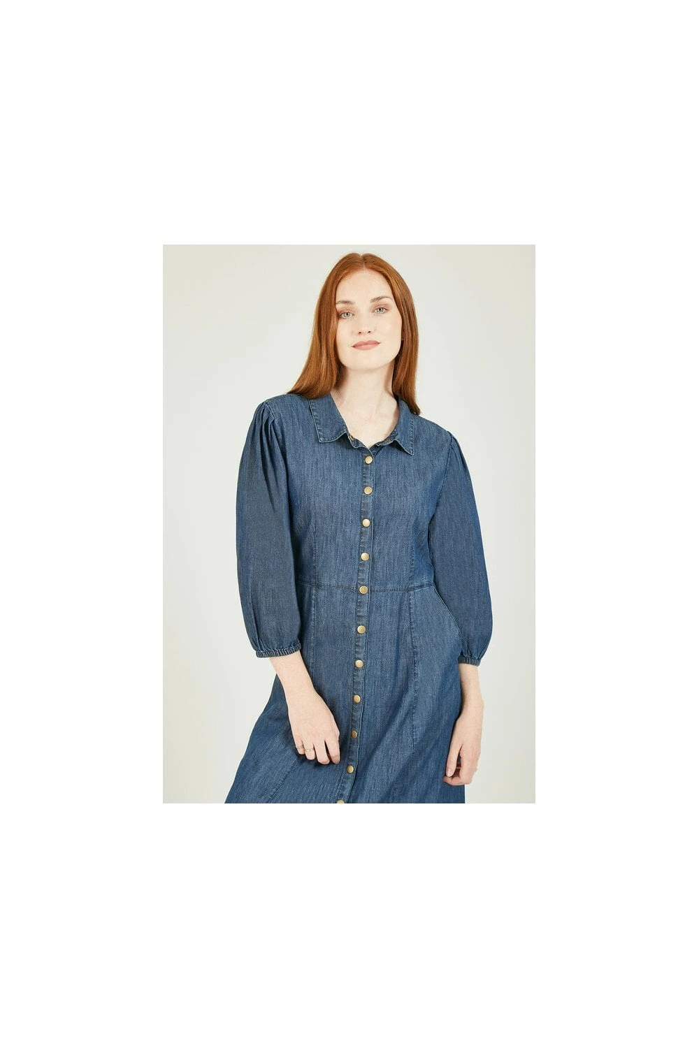 Update your day dress collection with this chic, demin-look Yumi Chambray Shirt Dress With Puff Sleeves. A unique piece with a shirt style collar, brassy popper buttons, fitted waist and 3/4 elasticated puff sleeves. Match with suede ankle boots to complete the look.