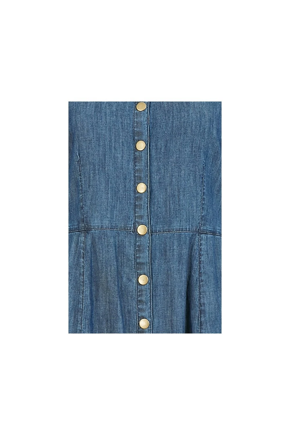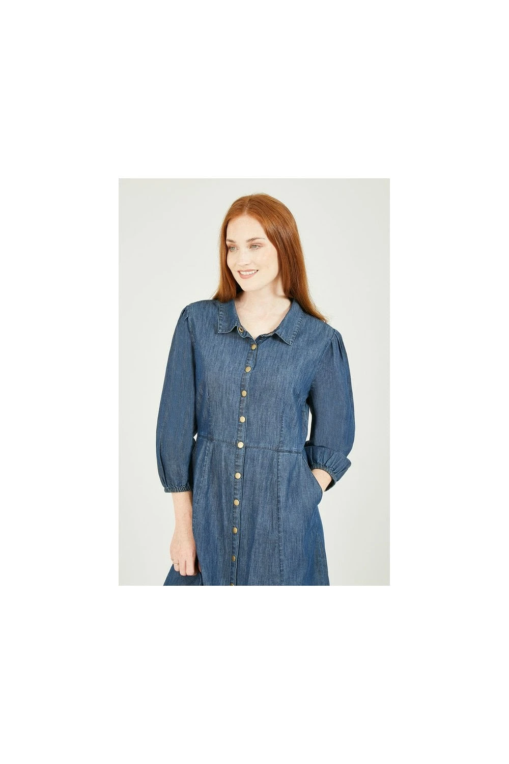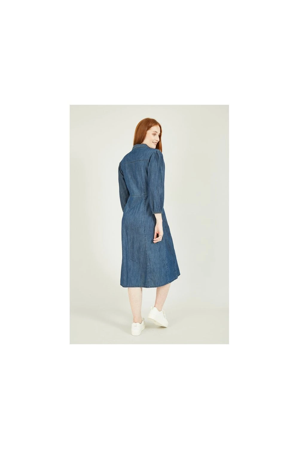 Update your day dress collection with this chic, demin-look Yumi Chambray Shirt Dress With Puff Sleeves. A unique piece with a shirt style collar, brassy popper buttons, fitted waist and 3/4 elasticated puff sleeves. Match with suede ankle boots to complete the look.