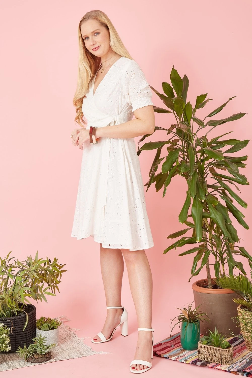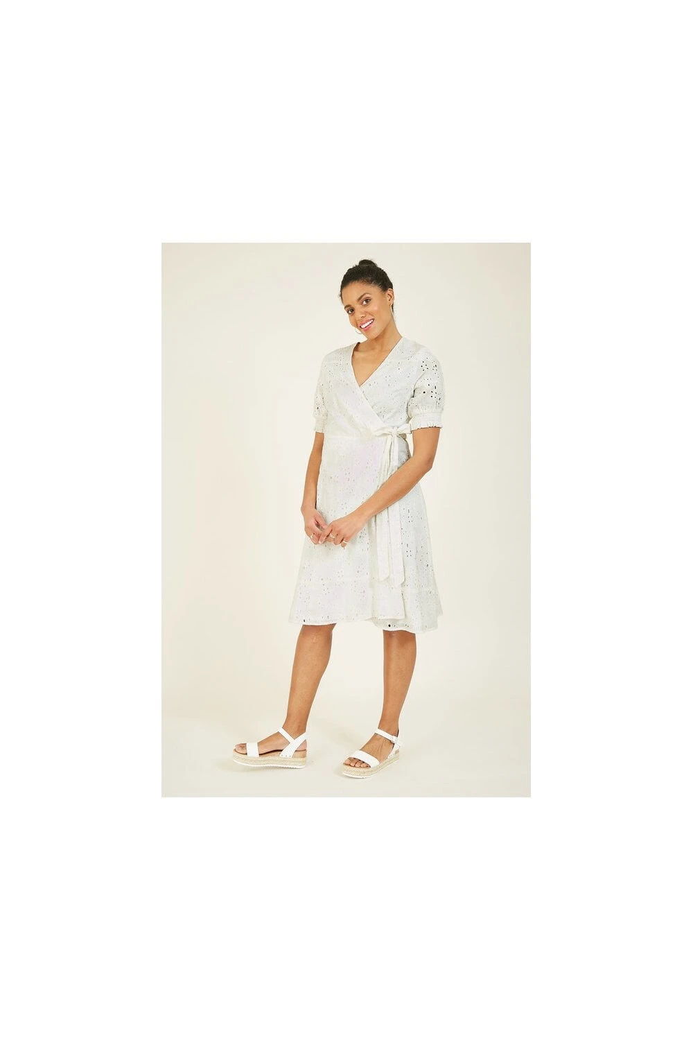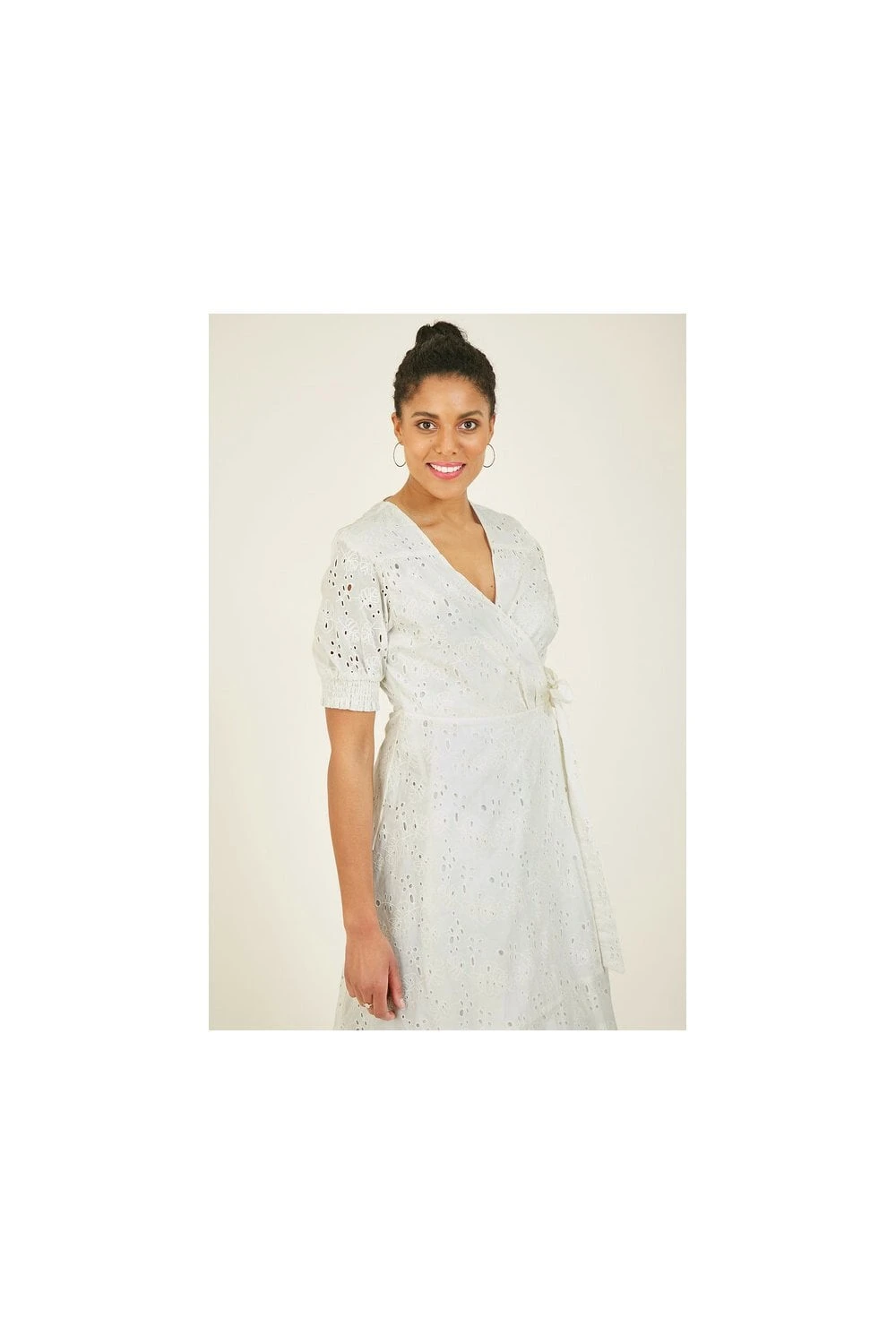 Full of those all-important extra touches, this Yumi Cream Broderie Wrap Dress is flattering and fancy in equal measure. The waist tie cleverly pulls the eye in, with the contrasting statement puff sleeves working to further compliment your figure. As ever, the devil is in the detail with an all over cut out broderie design. Match with strappy heels and gold accessories for unforgettable evening wear.