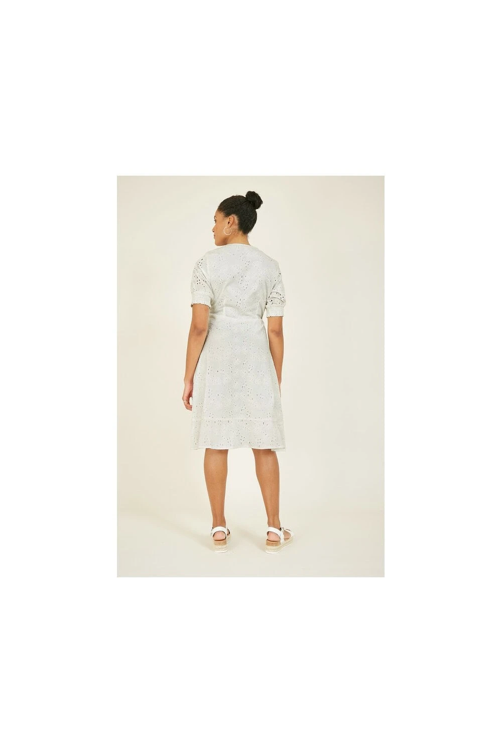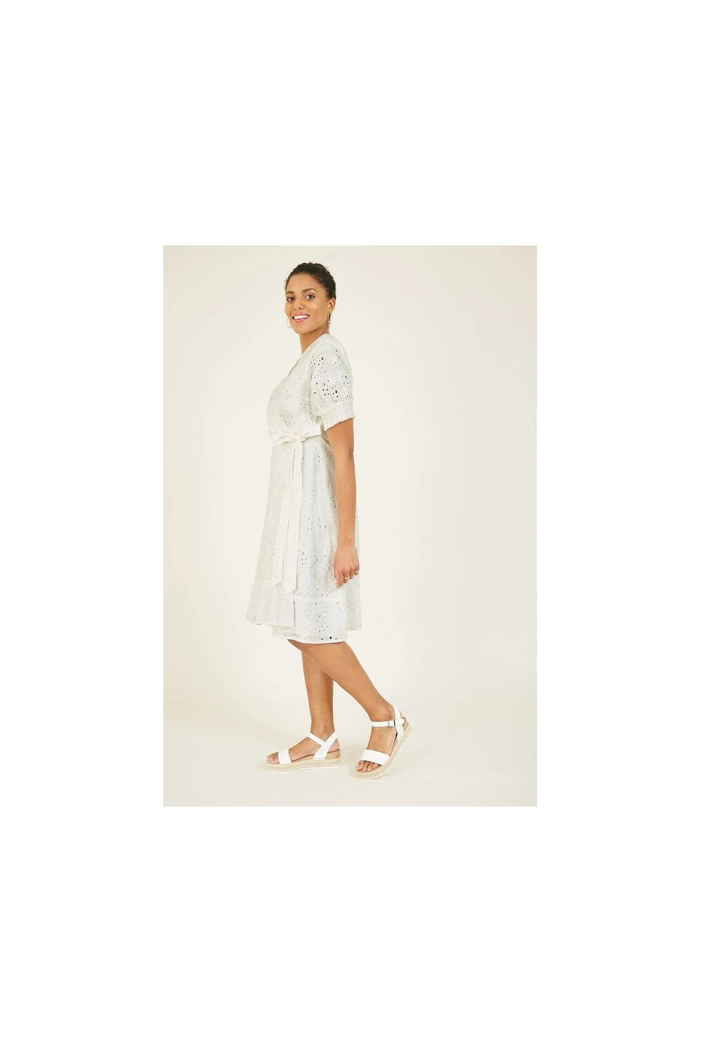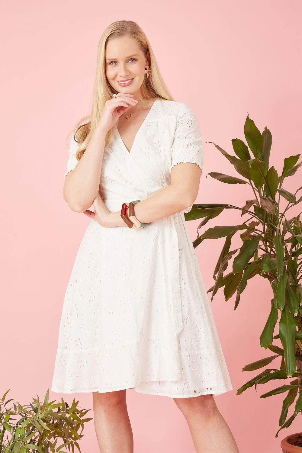 Full of those all-important extra touches, this Yumi Cream Broderie Wrap Dress is flattering and fancy in equal measure. The waist tie cleverly pulls the eye in, with the contrasting statement puff sleeves working to further compliment your figure. As ever, the devil is in the detail with an all over cut out broderie design. Match with strappy heels and gold accessories for unforgettable evening wear.