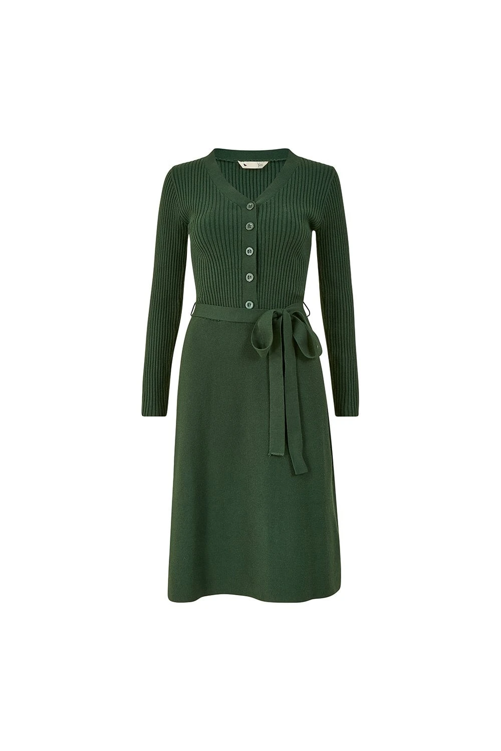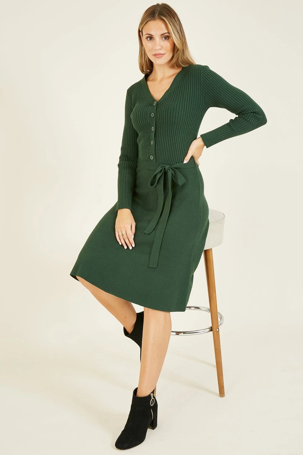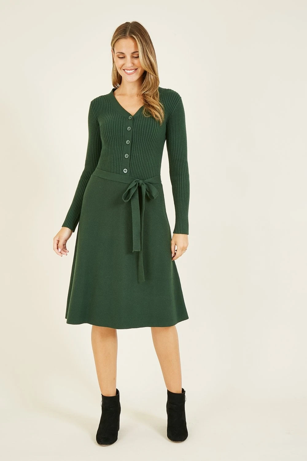 Your new casual essential. This Yumi Green Knitted Skater Dress is a flattering, versatile look. Featuring a fitted ribbed top with long sleeves and buttons, a waist tie belt and floaty skater skirt. Match with suede ankle boots and tights to complete the look.