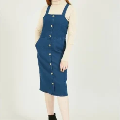 Update your denim collection with this stunning Yumi dungaree dress. A simple, timeless wardrobe staple, this piece features a button through fastening, thick straps and a flattering, fitted midi shape. Perfect for layering over long sleeve tee’s.