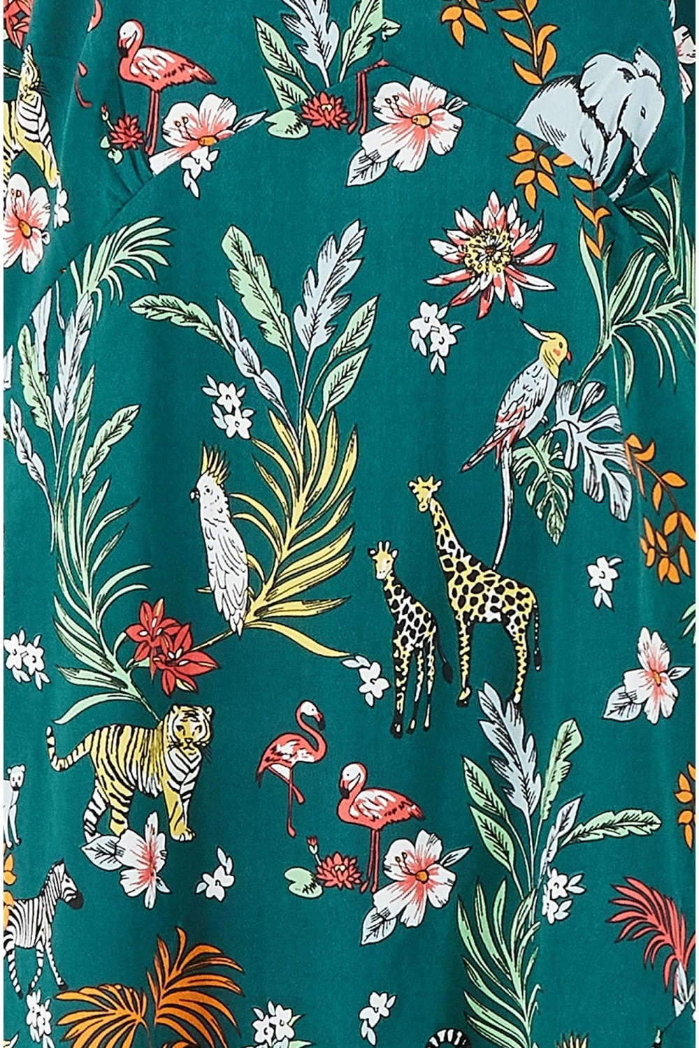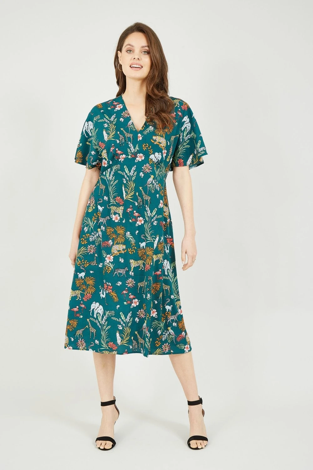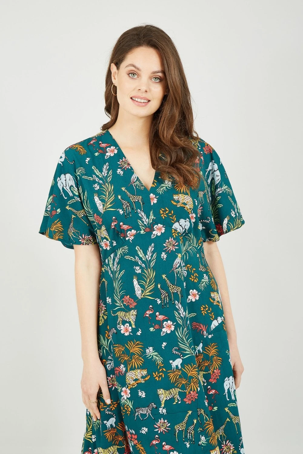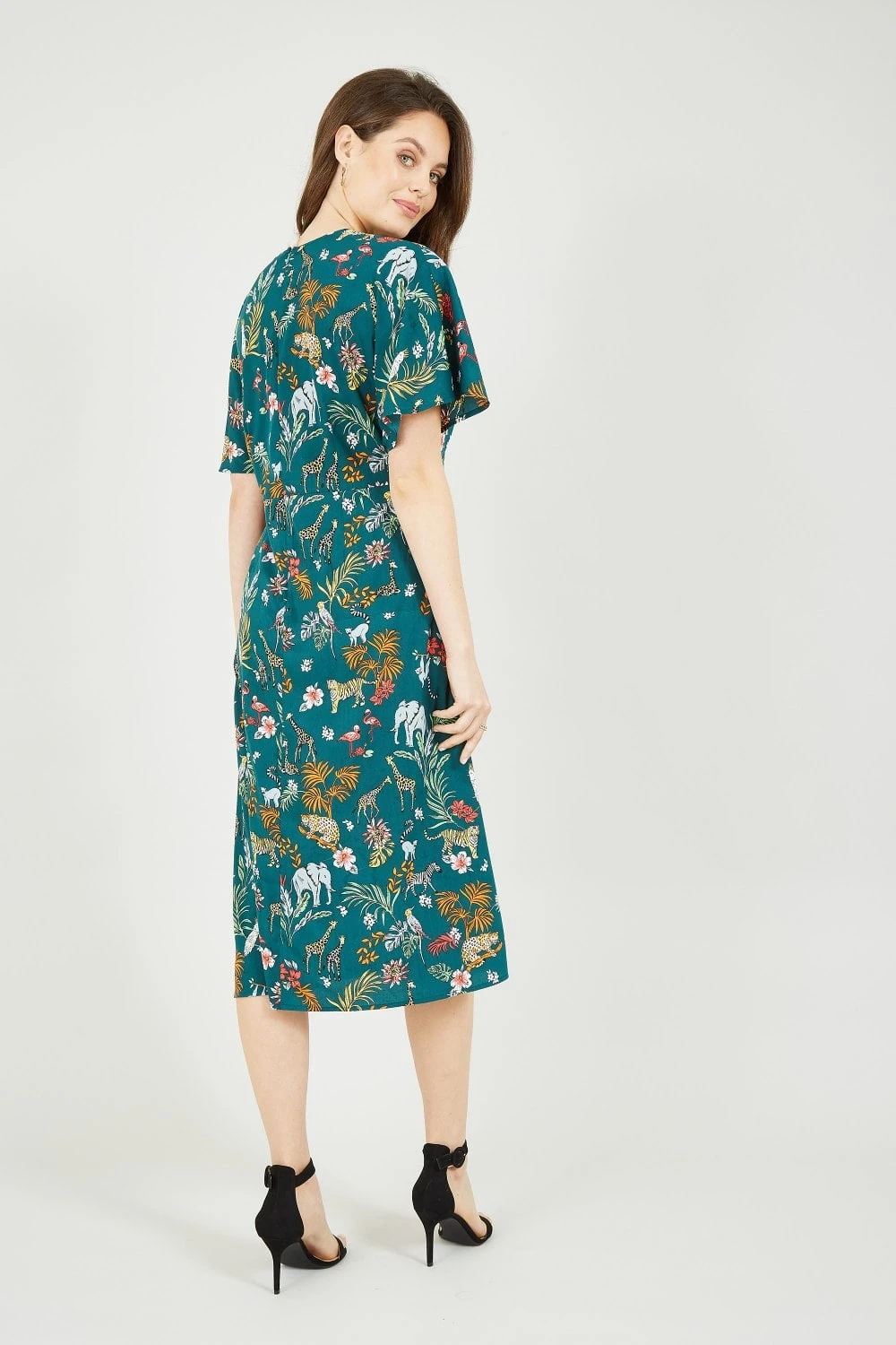 Welcome to the jungle. Step into spring/summer styles in this stunning Yumi Green Animal Kingdom Print Midi Dress, complete with statement angel sleeves. Covered in an all-over jungle print, this midi dress flatters your figure with it’s loose fit and unique design. Pair with a leather jacket to complete the look.