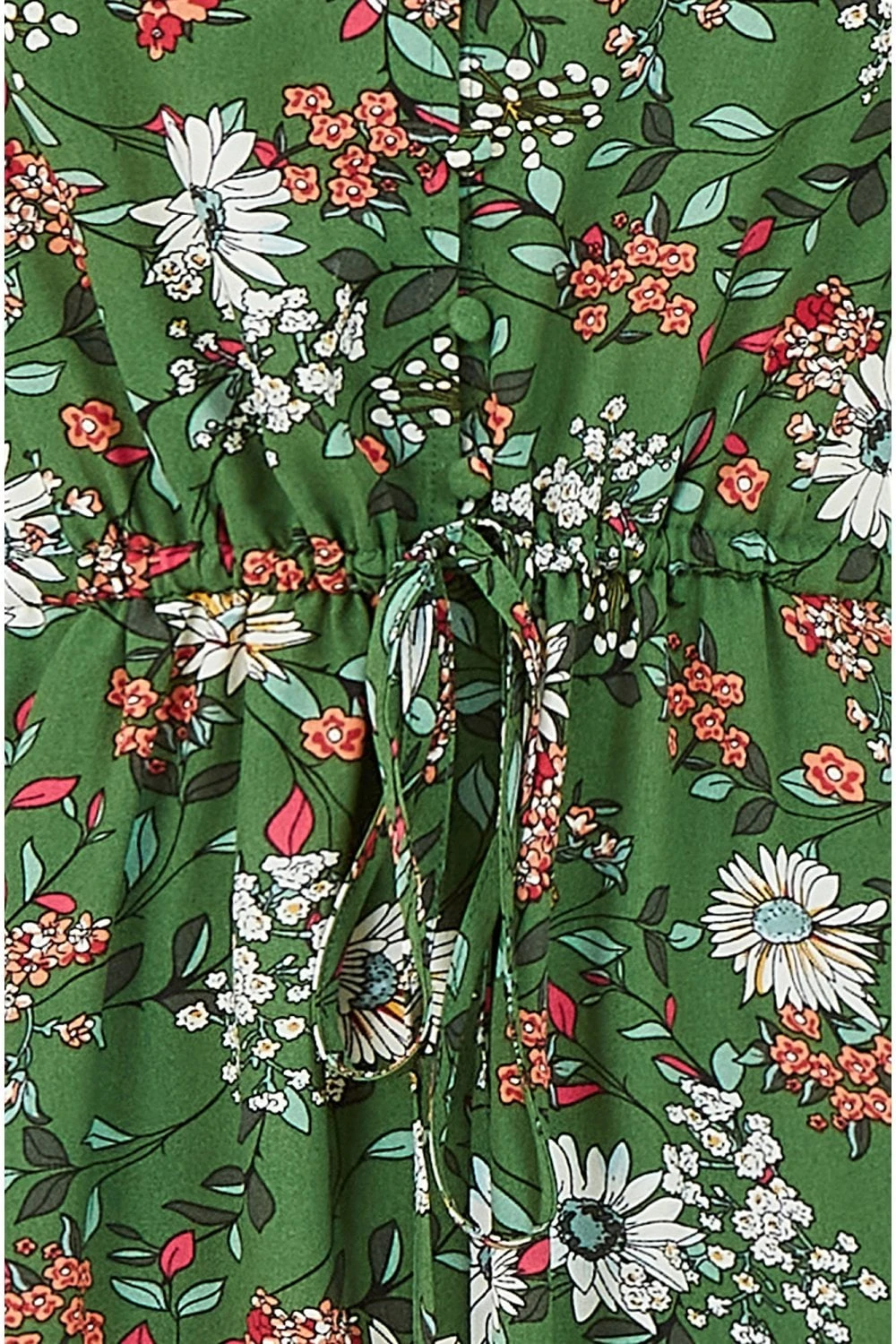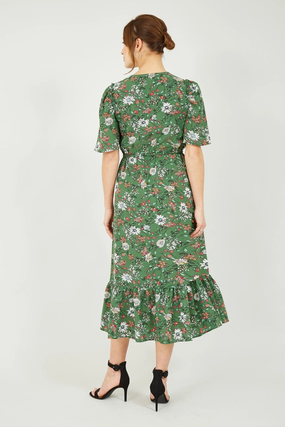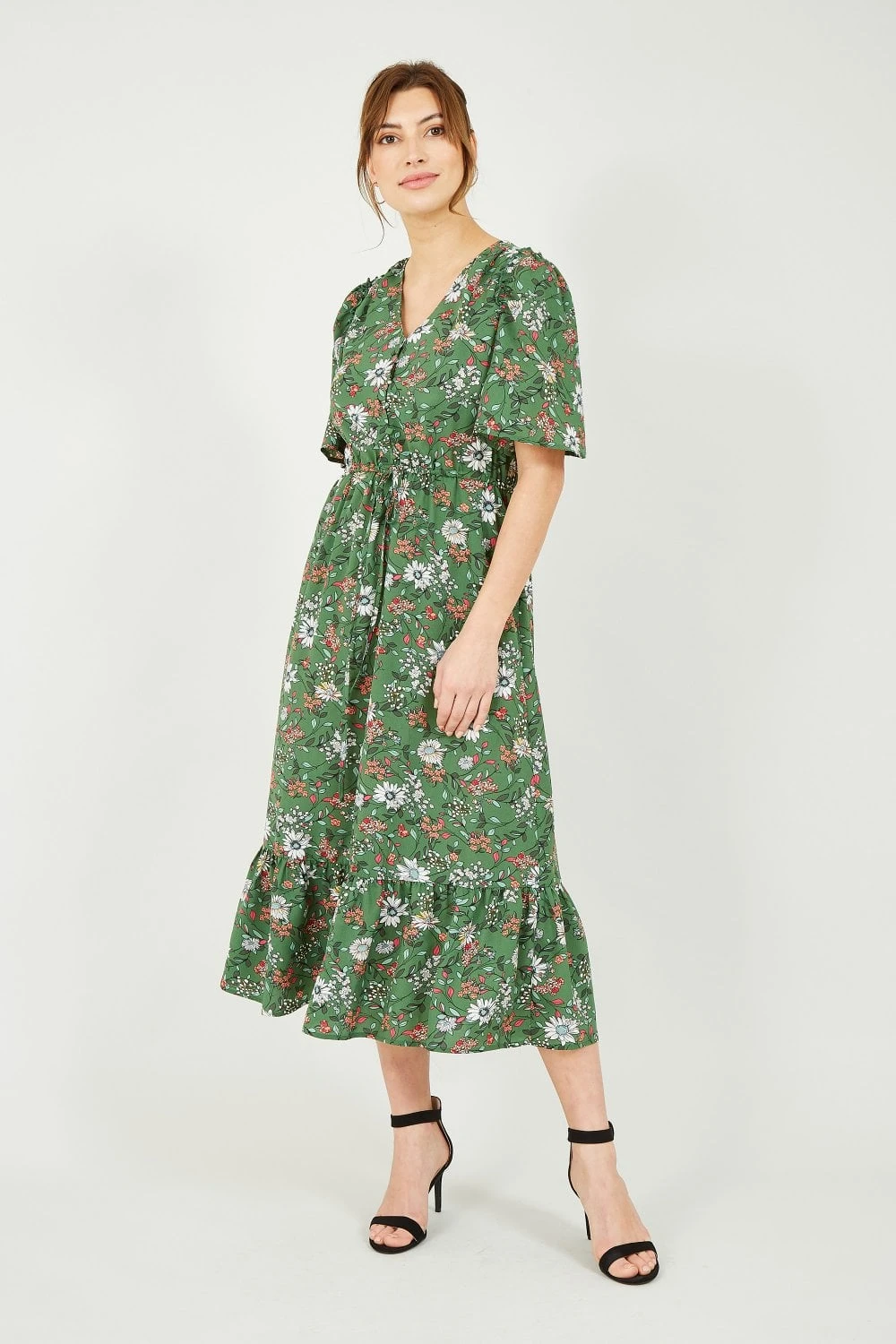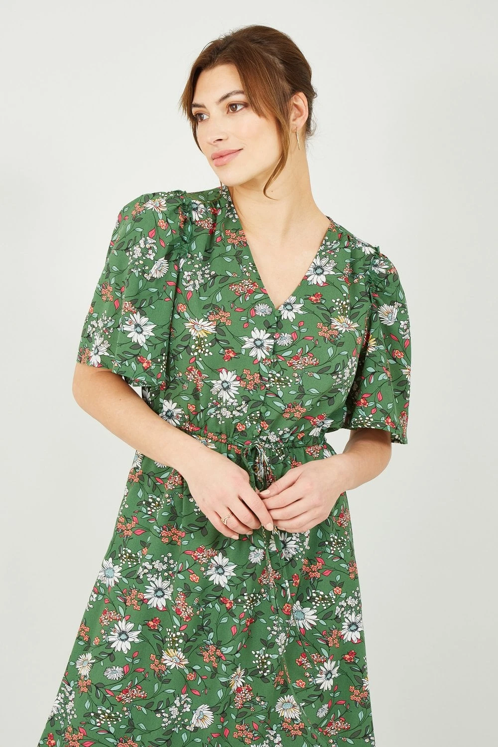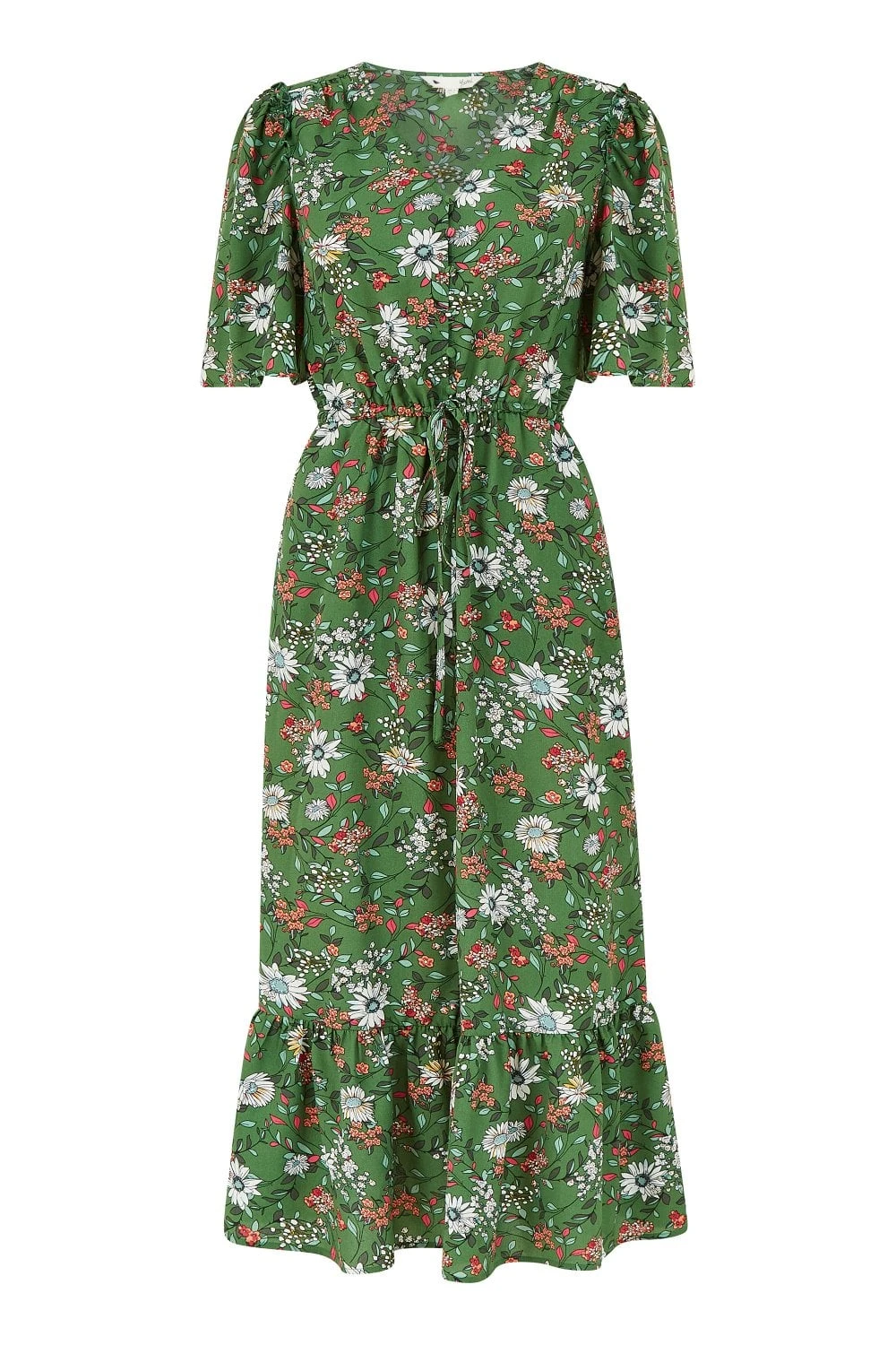 In a striking shade of green, this Yumi Green Daisy Print Midi Dress features material covered button through fastenings, a flattering waist tie belt, relaxed short sleeves and frilled hem detailing. A stunning floral daisy fit in new season colours, layer this dress with a leather jacket and match with ankle boots.
