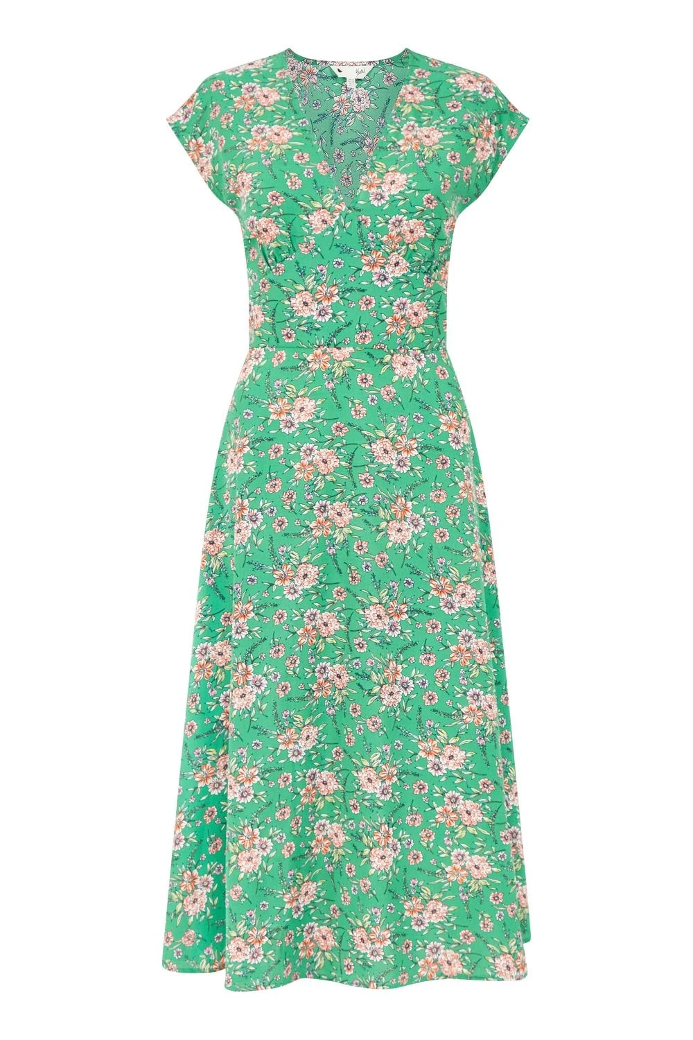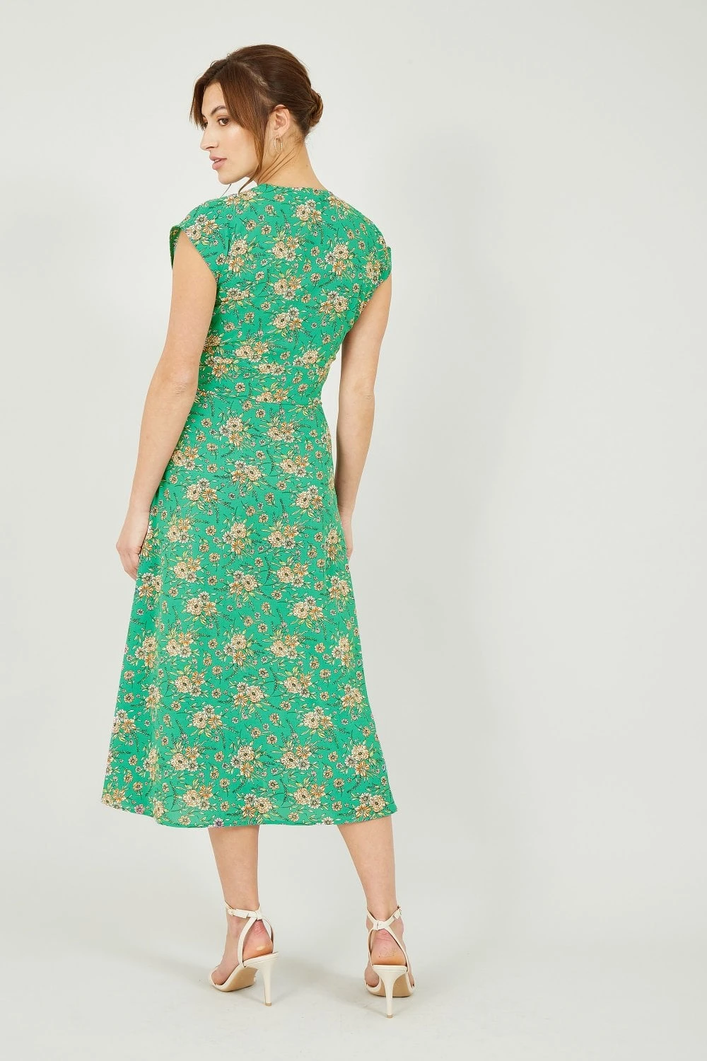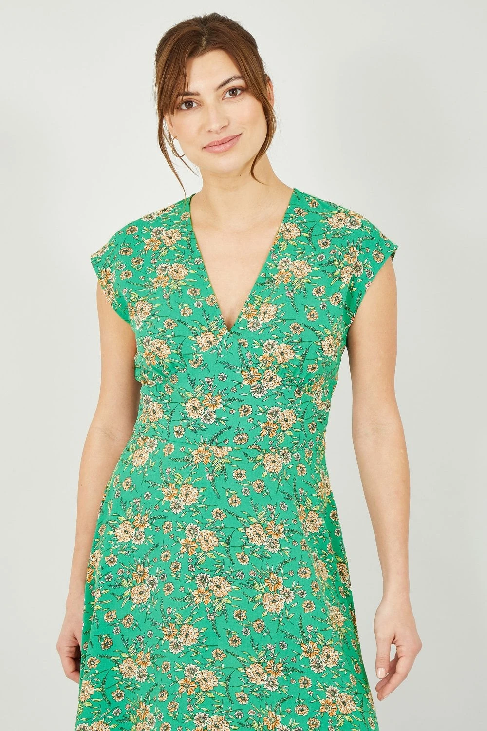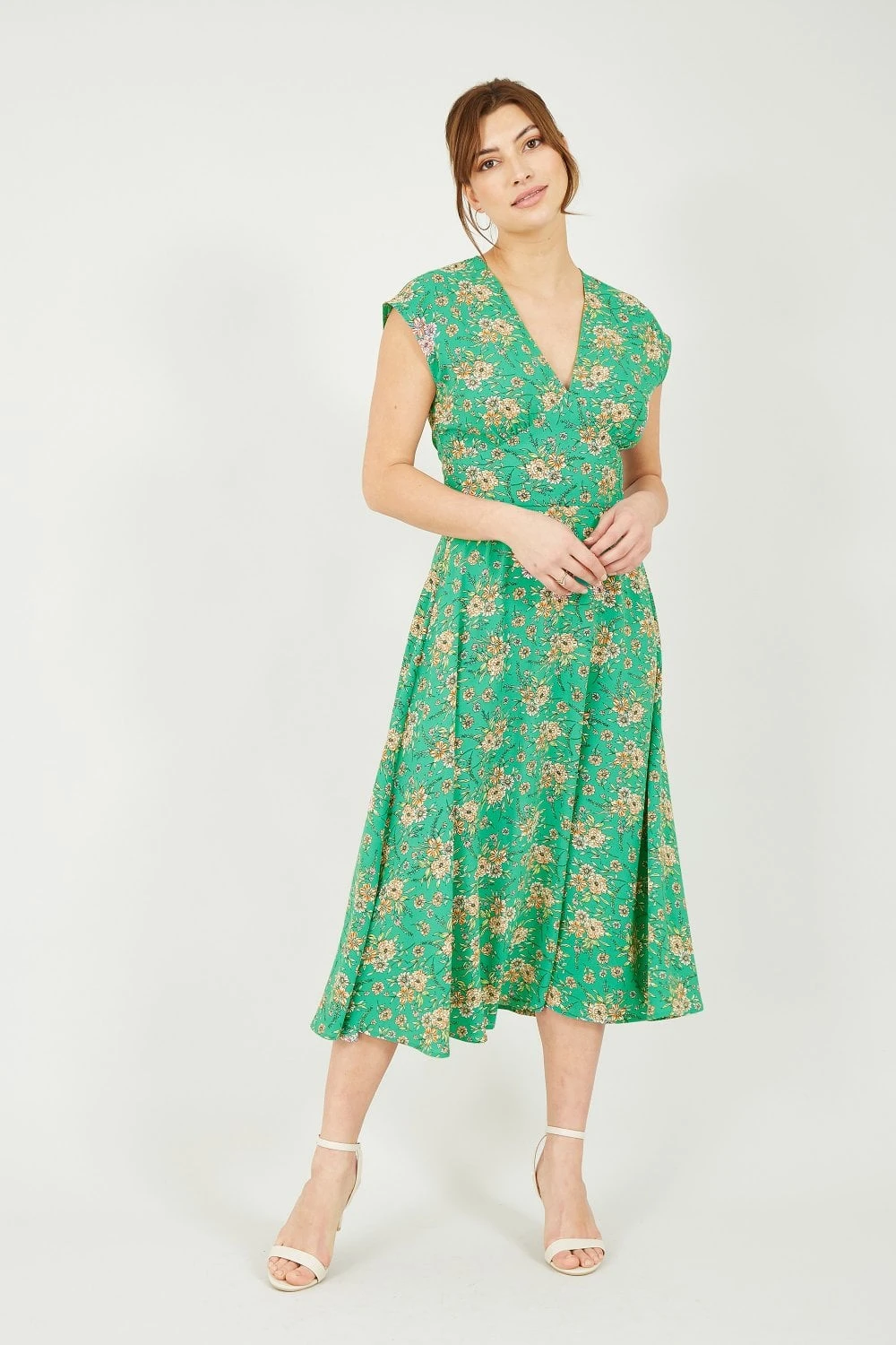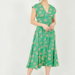 You will make everyone green with envy in this Yumi Floral Midi Dress. The lightweight fabric is tailored in a slim fit bodice and the A-line style skirt falls to a midi length. The pretty floral design features orange flowers, which contrast the green colour perfectly. The V-neckline needs just a delicate gold necklace, and add gold sandals to complete the look.