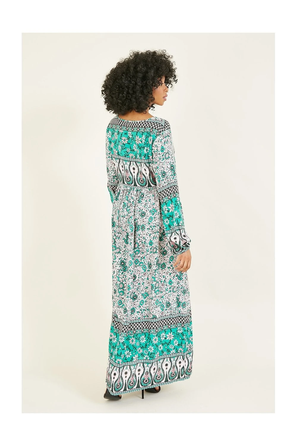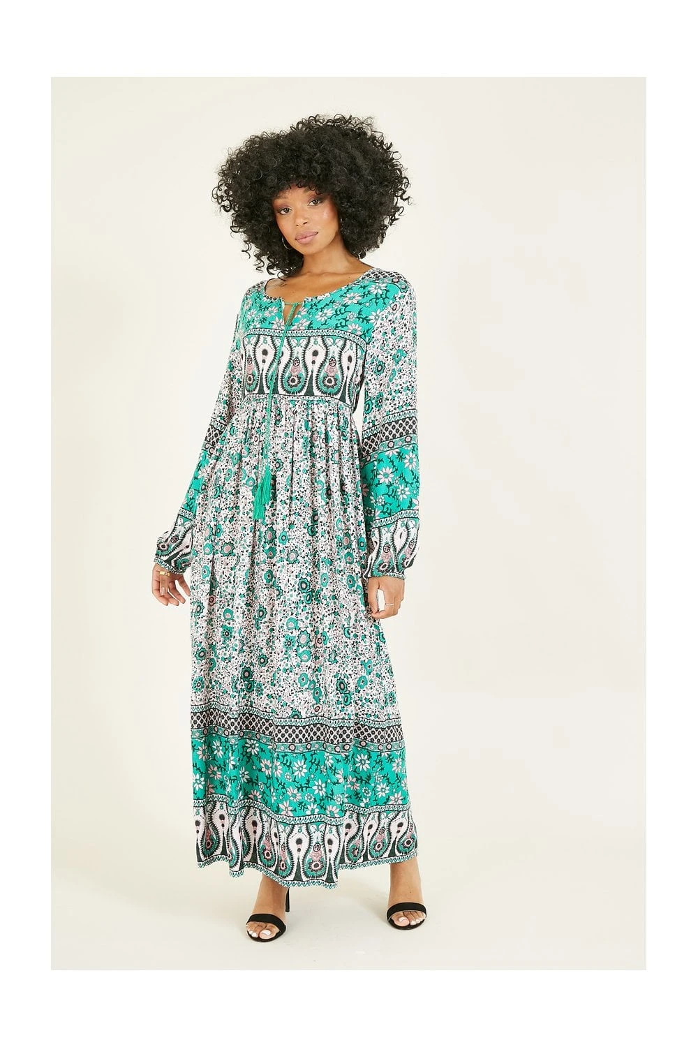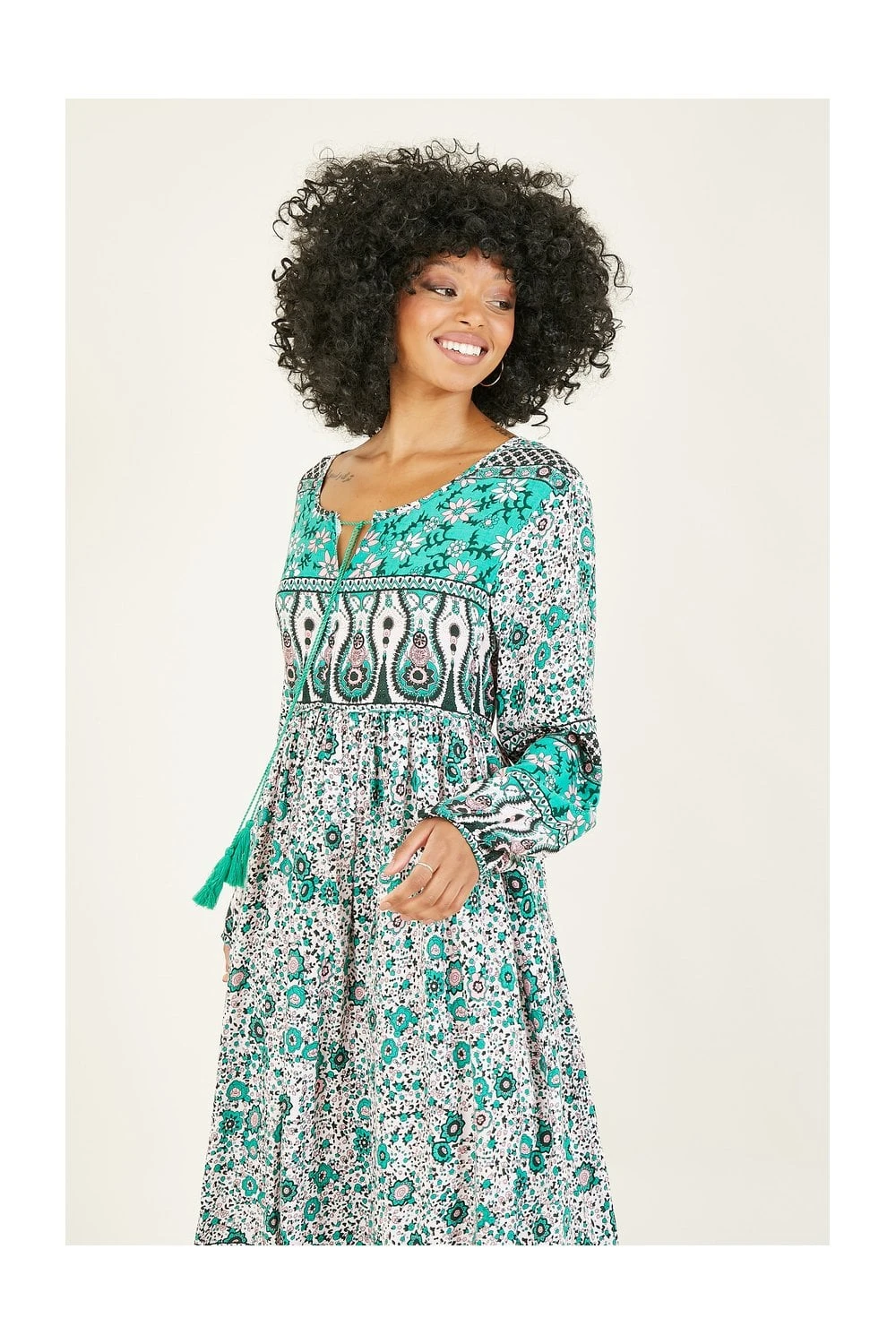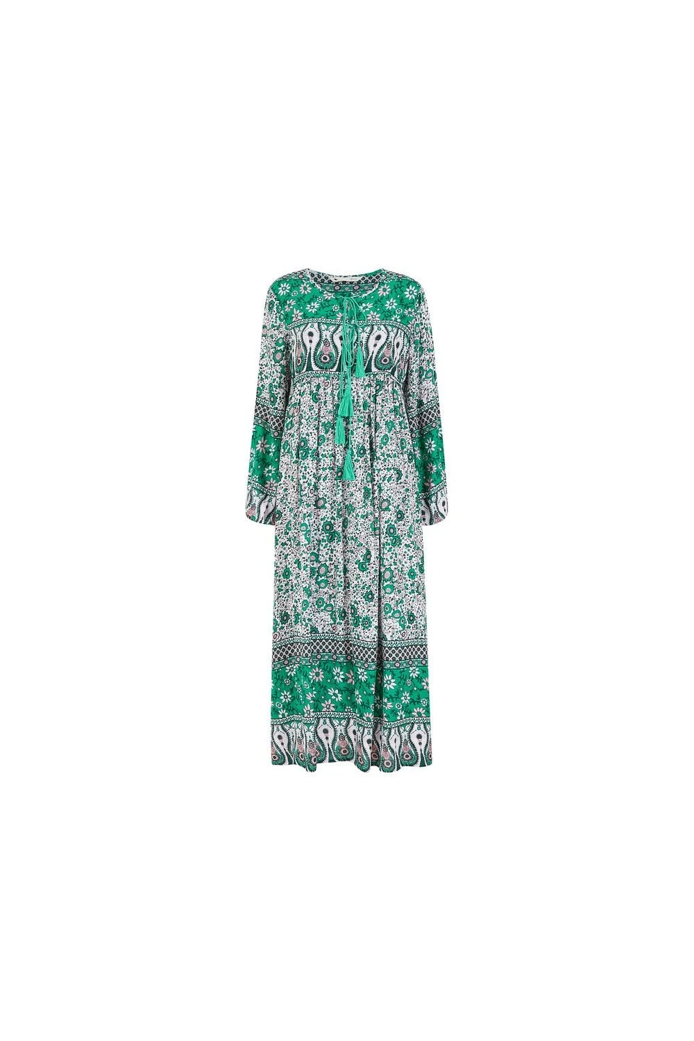Bohemian babes assemble. This Green Floral Print Maxi Dress by Yumi has character and style in buckets. From the tie up, round neck detailing, to the statement tassles, retro inspired pink and green pallette and cutesie floral pattern variations. Elevate your festival wardrobe or simply throw on with platform sandals for an unforgettable warm weather look.