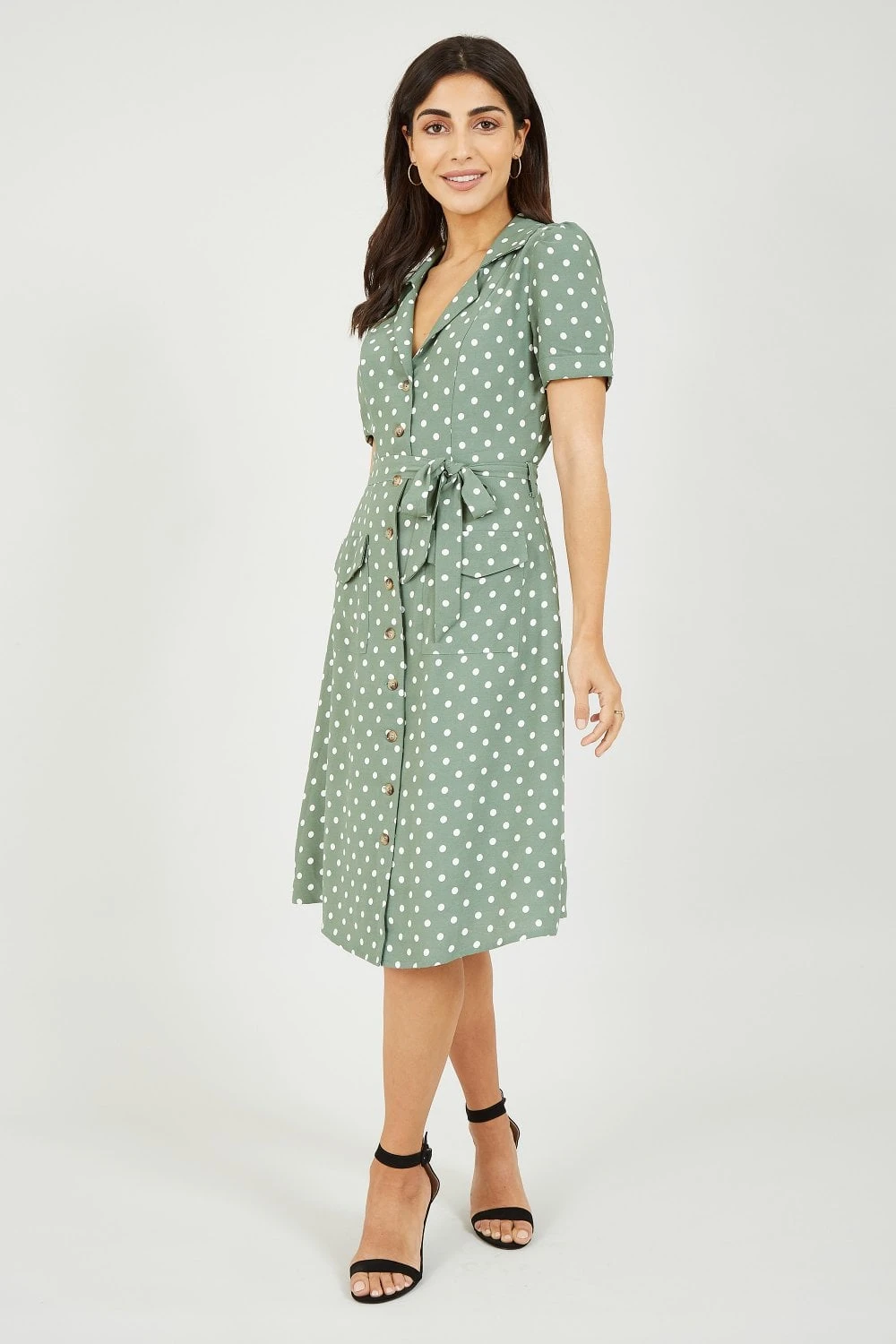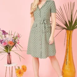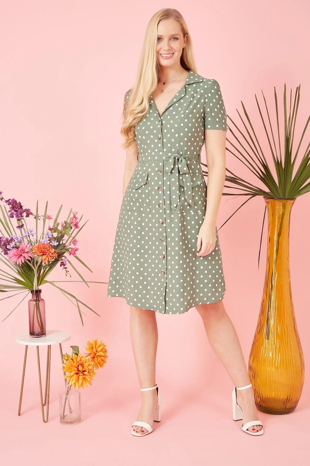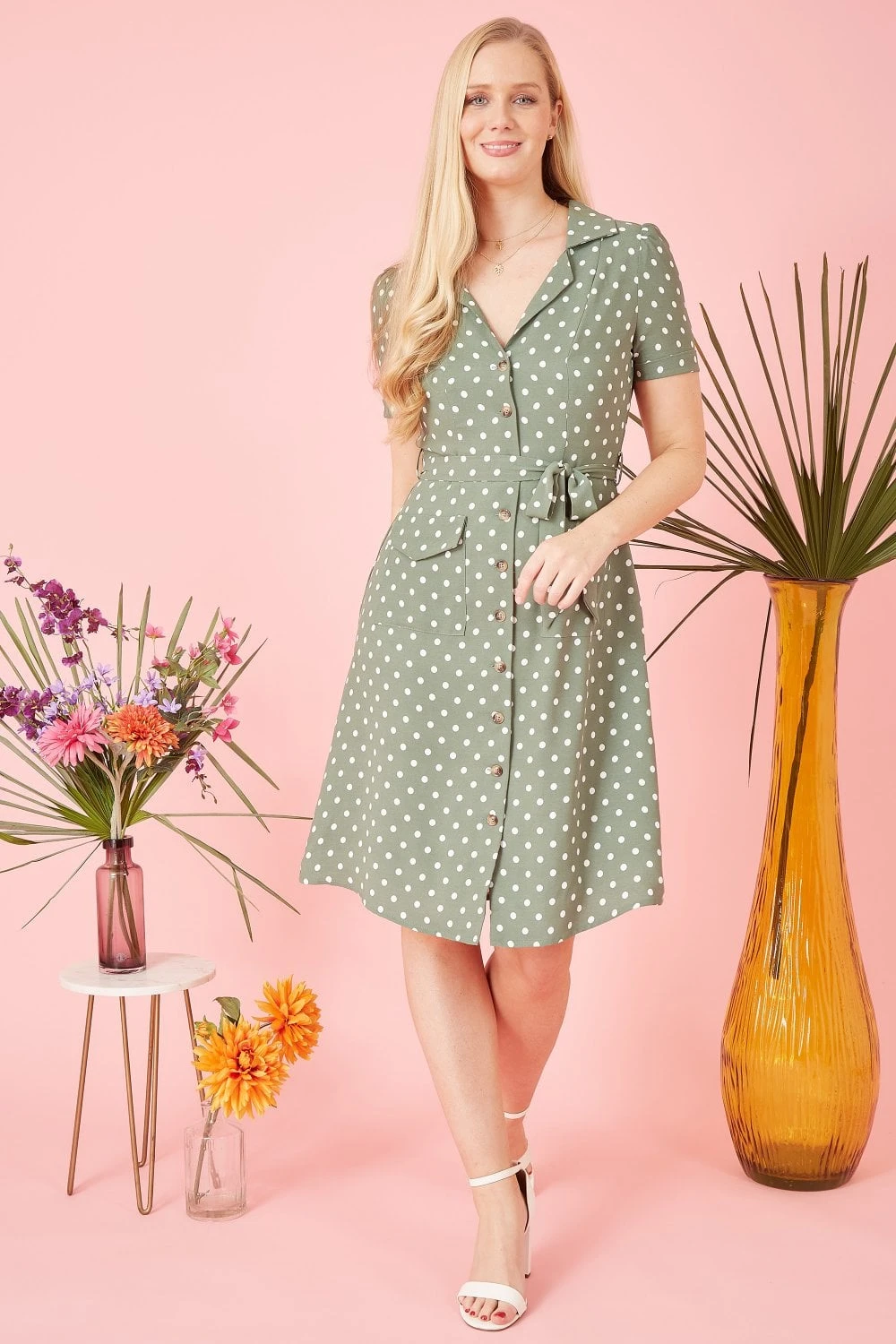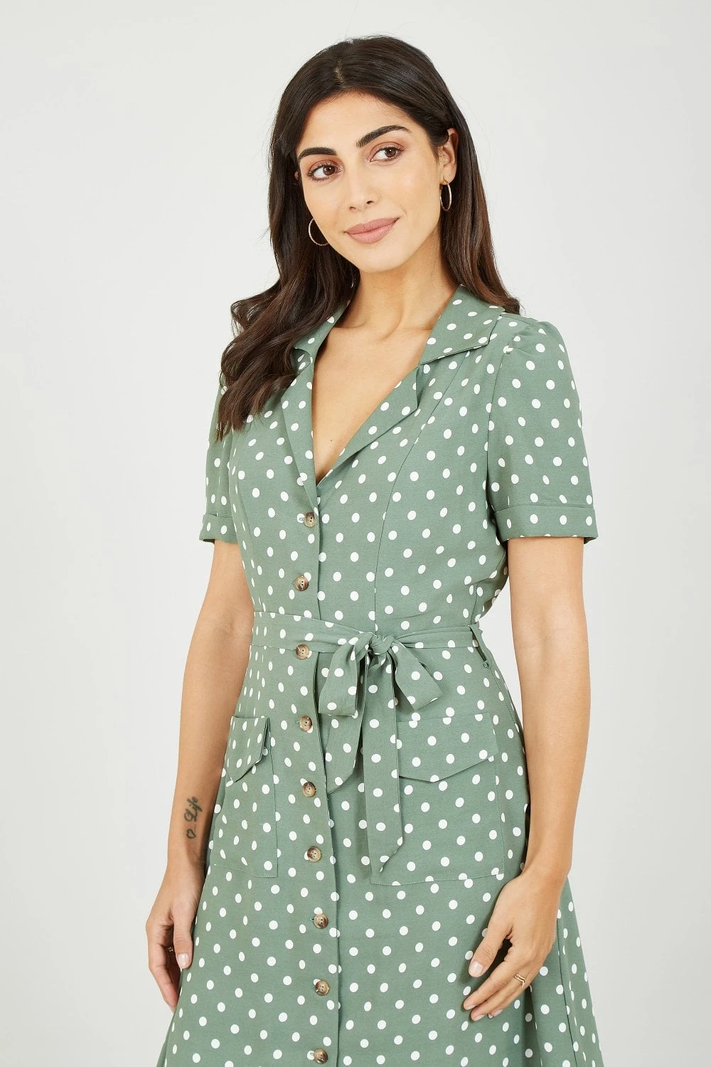 Spot the super cute retro dress. This stunning Yumi Green Spot Retro Shirt Dress is a totally timeless fit. Crafted in a vintage style with a shirt dress cut, this look benefits from a flattering waist tie belt, roomy pockets and a button through fastening. Match with tights and ankle boots to complete the look.