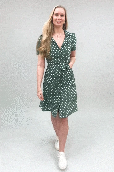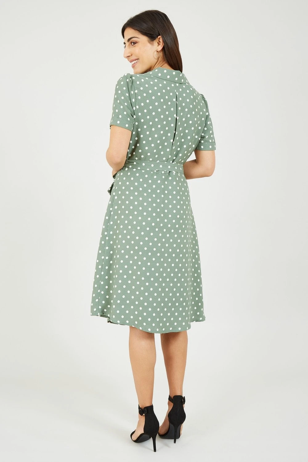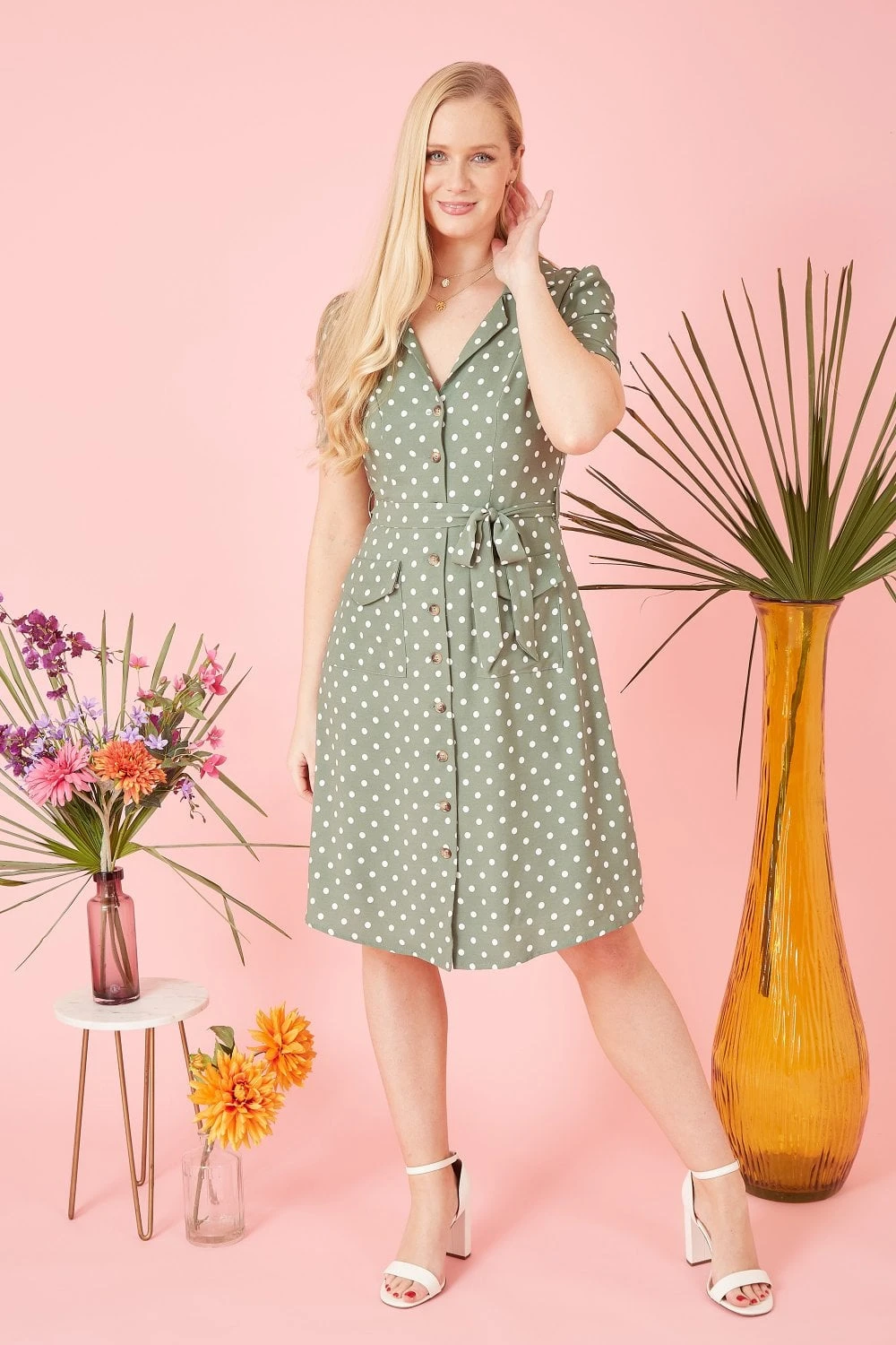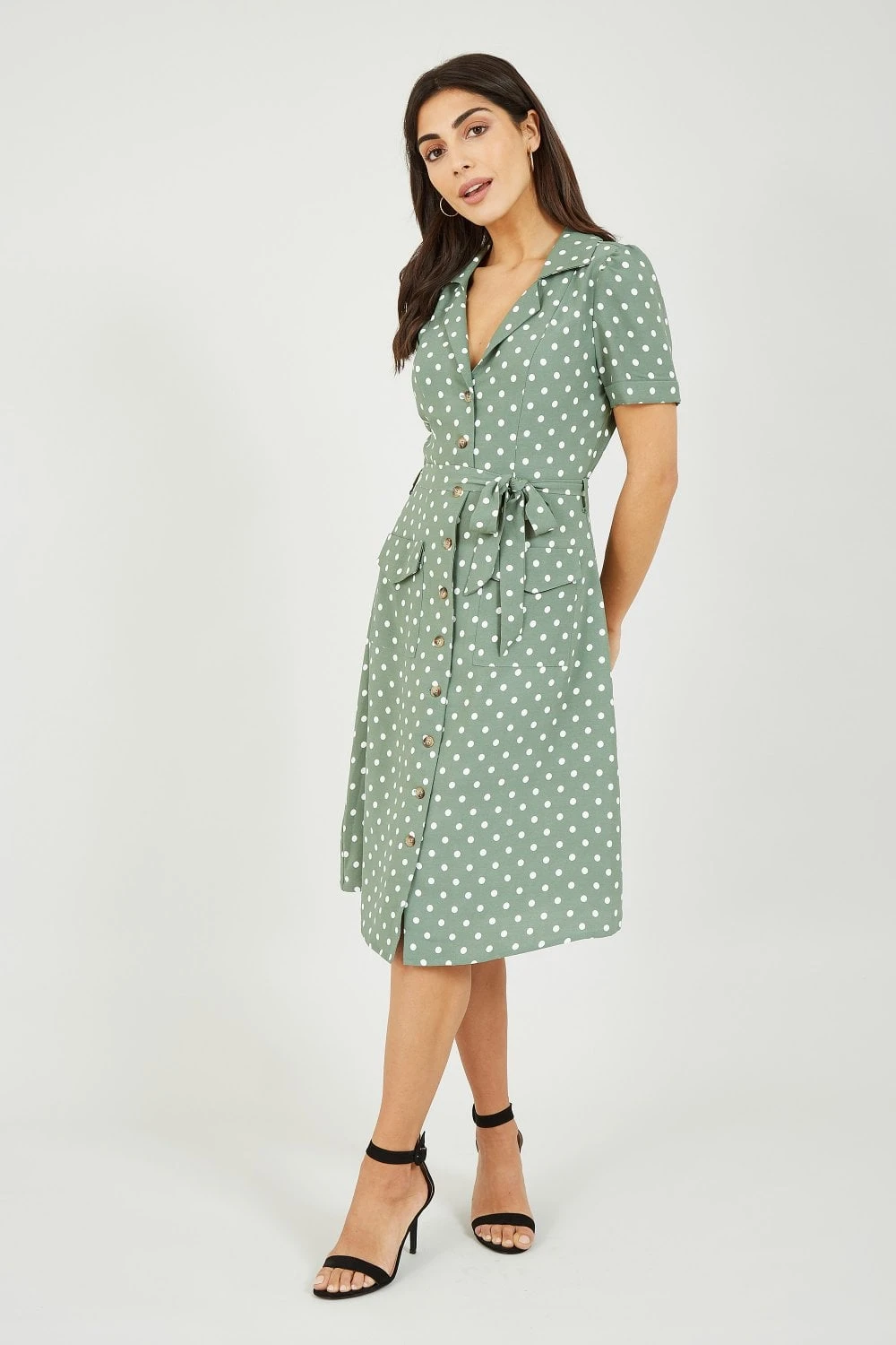 Spot the super cute retro dress. This stunning Yumi Green Spot Retro Shirt Dress is a totally timeless fit. Crafted in a vintage style with a shirt dress cut, this look benefits from a flattering waist tie belt, roomy pockets and a button through fastening. Match with tights and ankle boots to complete the look.
