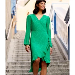 We’ve given the wardrobe staple wrap dress a refresh with lighter, more luxurious fabric. Floating below the knee, our Yumi Spotted Frill Long Sleeve Wrap Dress is framed by full-length sleeves and a flattering self-tie waist. Detailed with a subtle polka dot print, dainty frills run from the shoulder to the hemline for a high impact finish.