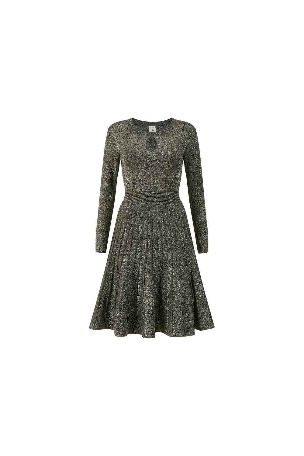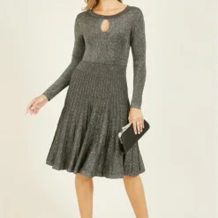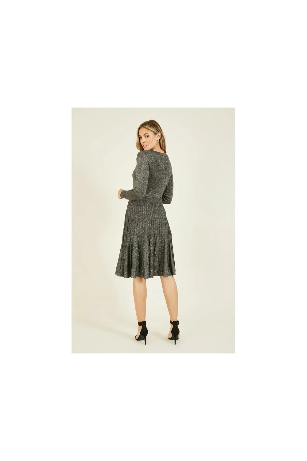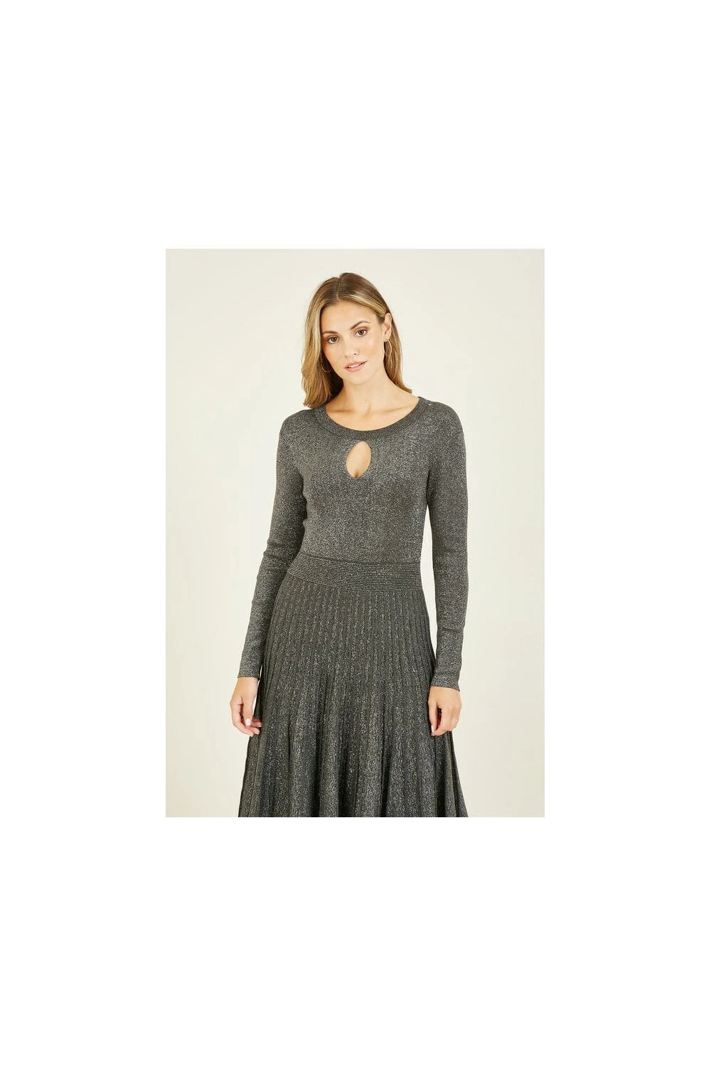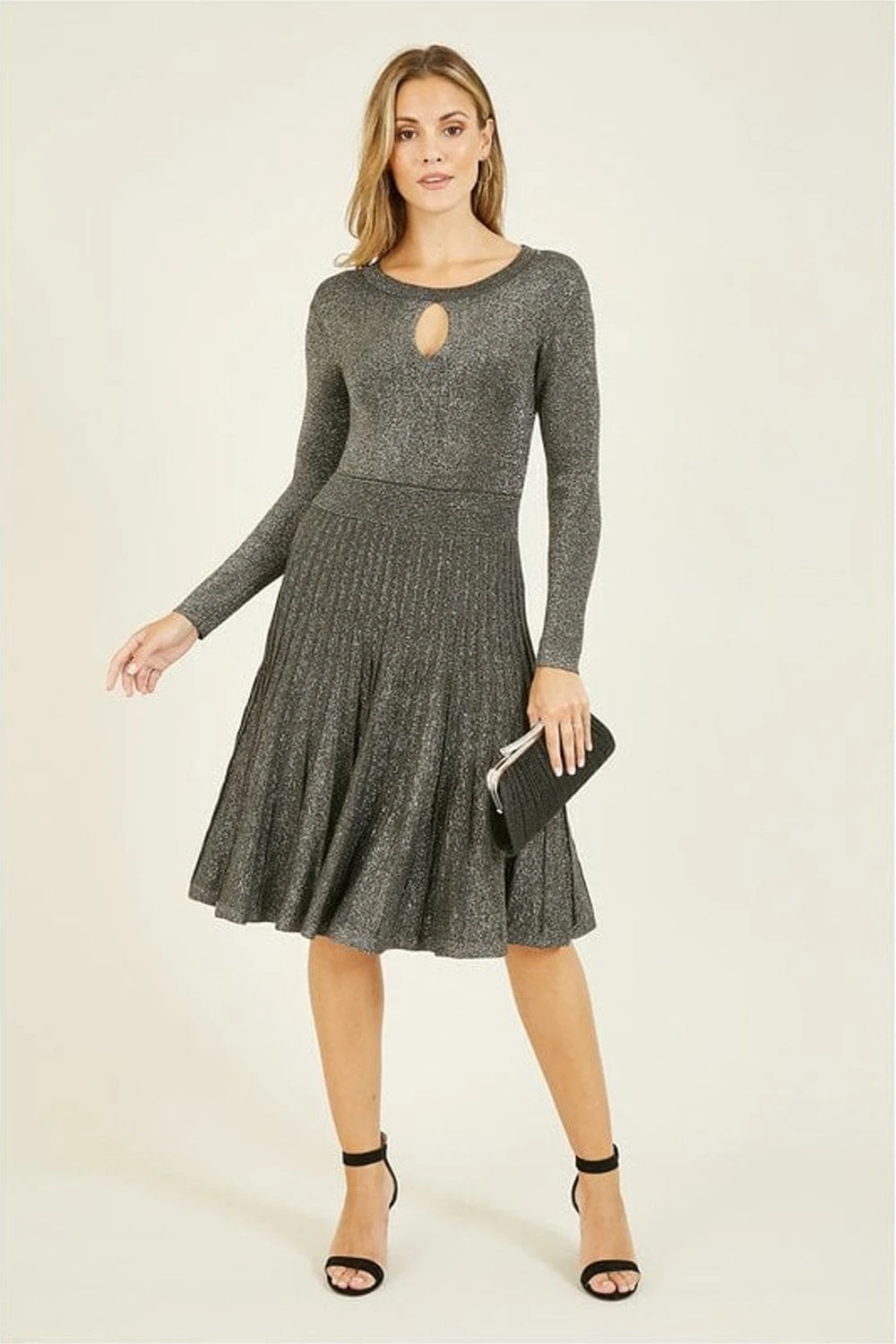 Sparkle this season in this stunning stretchy Yumi Grey Lurex Knitted Skater Dress. In a metallic sparkly silver, this dress features statement front key hole detailing, long sleeves, a waist band and pleated floaty skirt. Perfect, flattering occasionwear for the A/W party season. Match with strappy heels and an oversized clutch.
