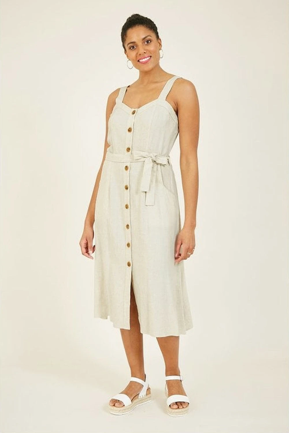 A timeless classic, this Yumi Ivory Button Up Midi Dress is a springtime must have. With a statement tie belt and thick straps for a flattering fit, this dress is perfect for relaxing in the sun or layering on cooler days. In a super versatile colour and cut, style entirely to your taste. Add a leather jacket and studded accessories to transform the look, or go cutesie and pair with florals and denim.
