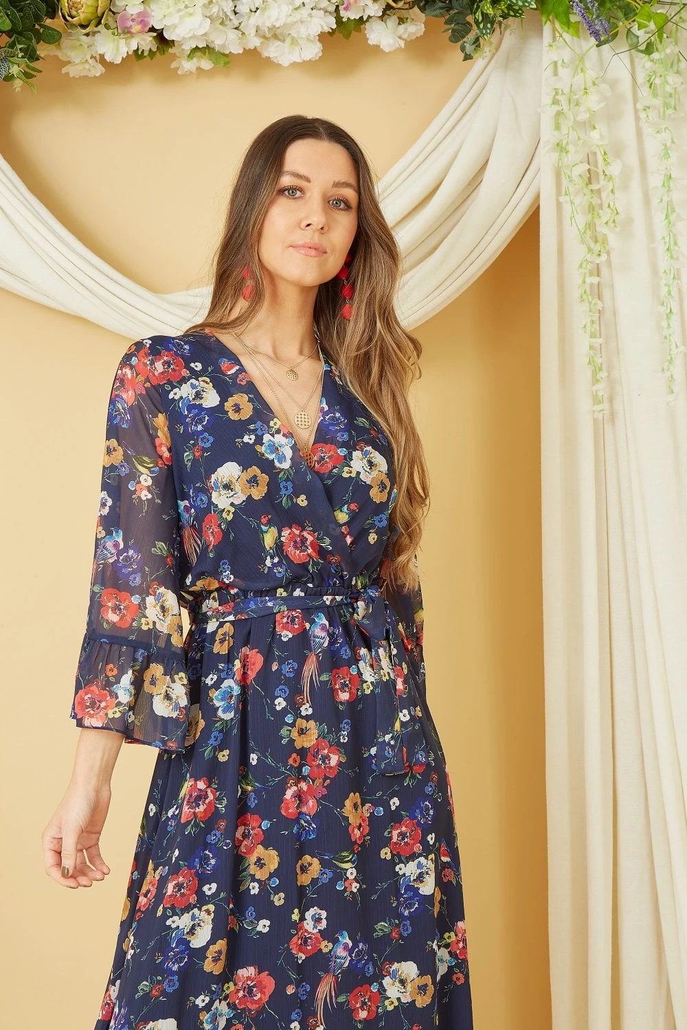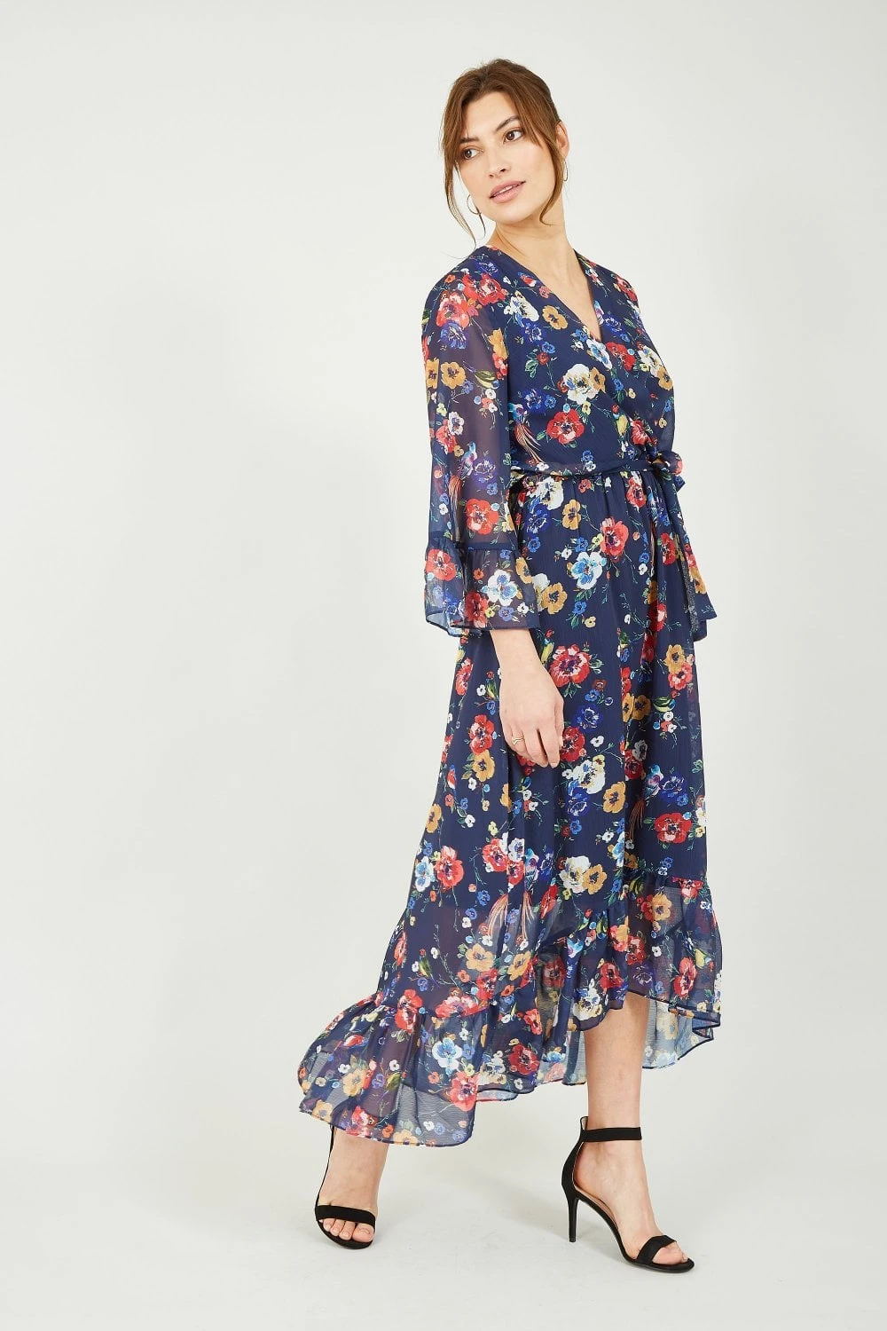 Flowing and flirty, the exclusive Yumi print adds to the romantic feel of this wrap dress. The sheer lightweight fabric is adorned with bird and florals, with a V-neck wrap top that ties at the waist to add shape. The midi length skirt is finished with a pretty frill detail, that can also be found at the wrist of the long flowy sleeves. Add metallic accessories and feel like your floating on air.