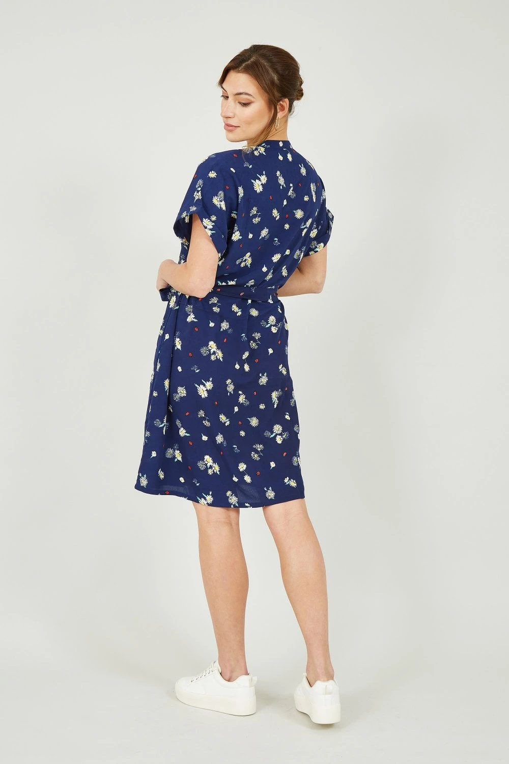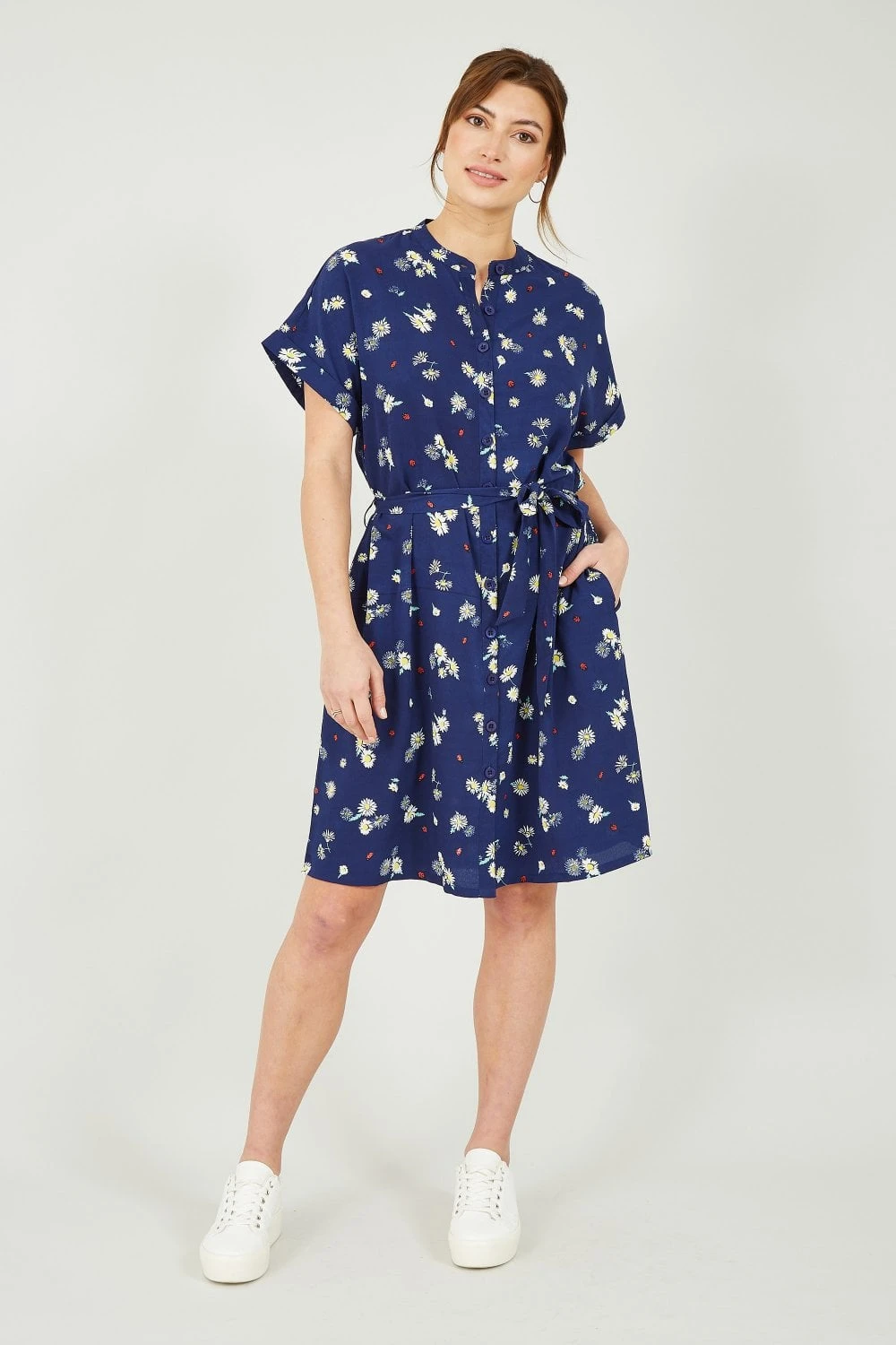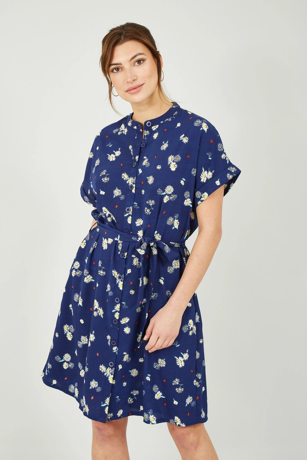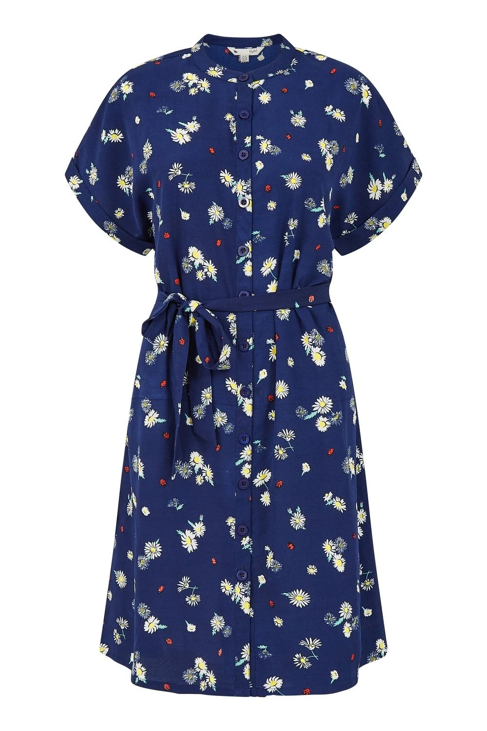 Hey little lady…bird. This classic Navy Daisy Ladybird Print Shirt Dres comes with a grandad collar, wide cut, turn up detail short sleeves, a waist accentuating tie belt, and button through fastening. Covered in a super cute ladybird and daisy print. A day-to-night fit to see you right through the seasons. Layer with leather and pair with ankle boots to complete the look.