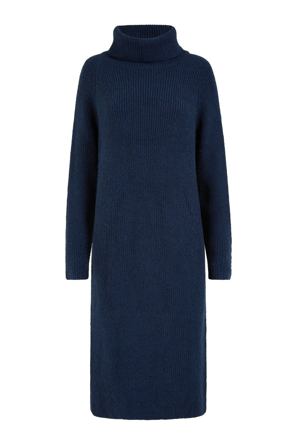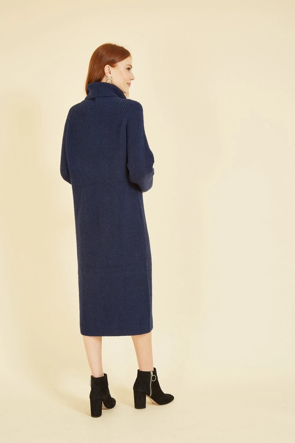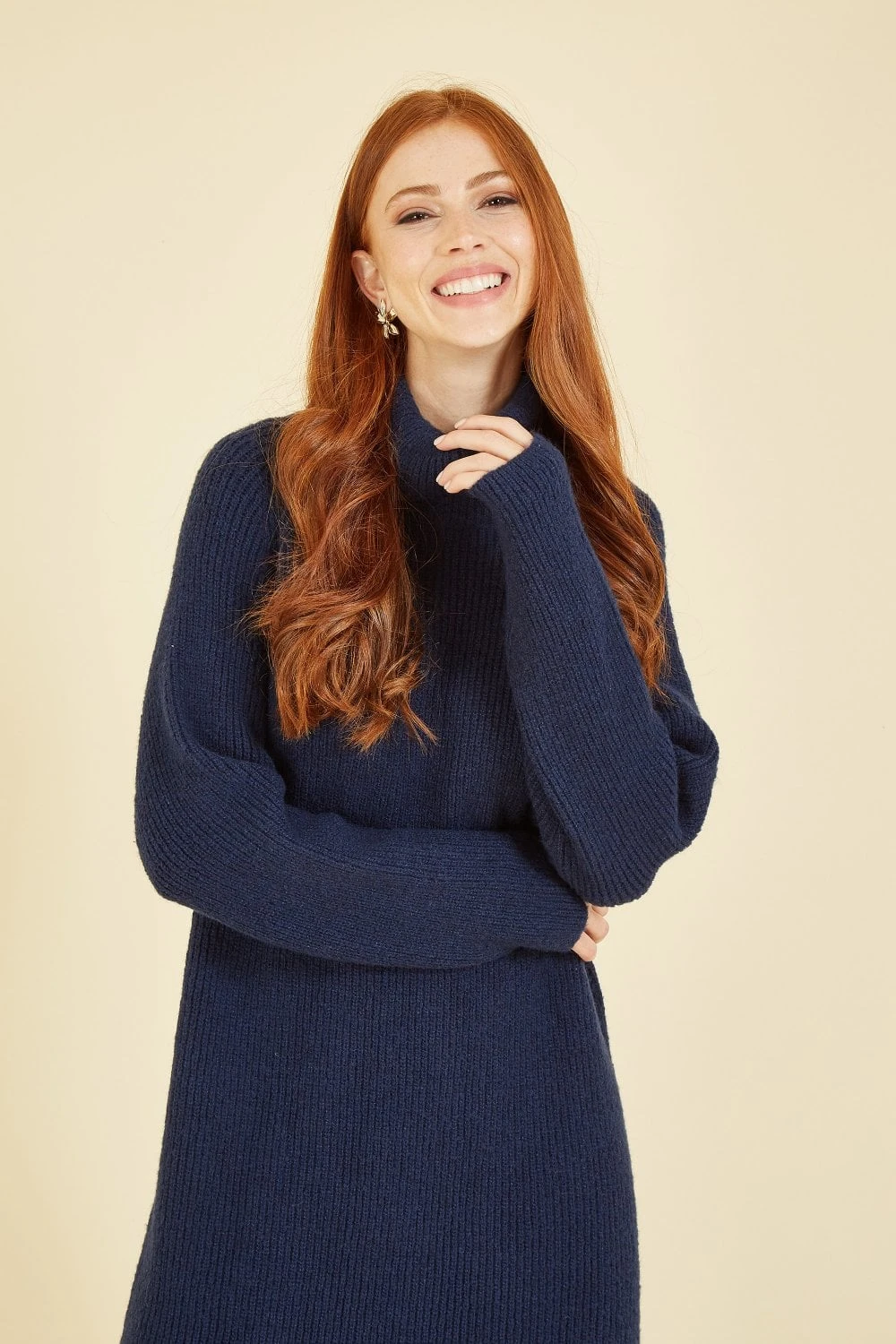 Keep it simple and cosy this season in the Yumi Navy Roll Neck Knitted Midi Jumper Dress. This easy to wear style is made from a close knit, that will keep you warm and makes winter dressing easy and chic. With a relaxed fit and long sleeve, style with ankle boots and a leather jacket for an everyday look.