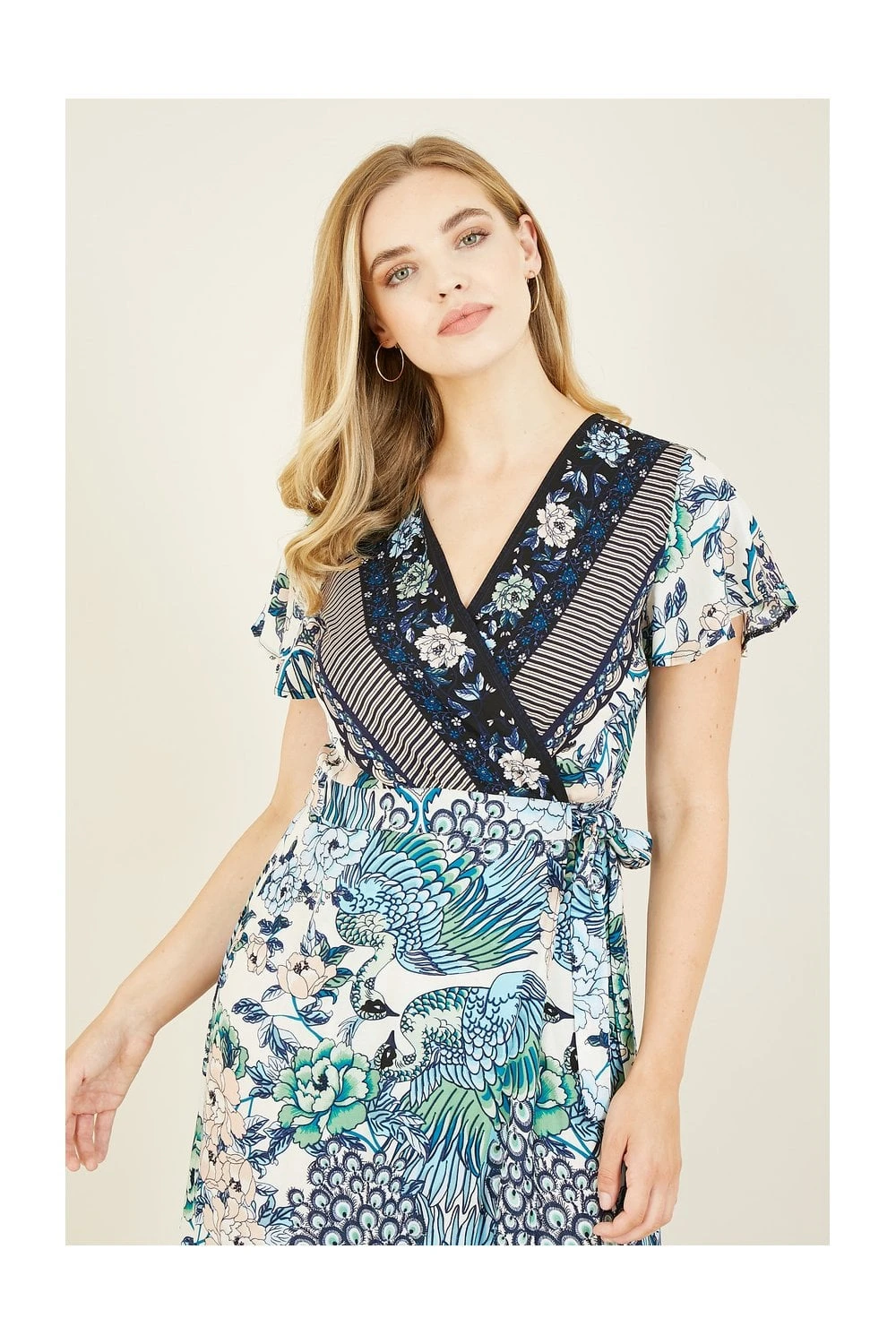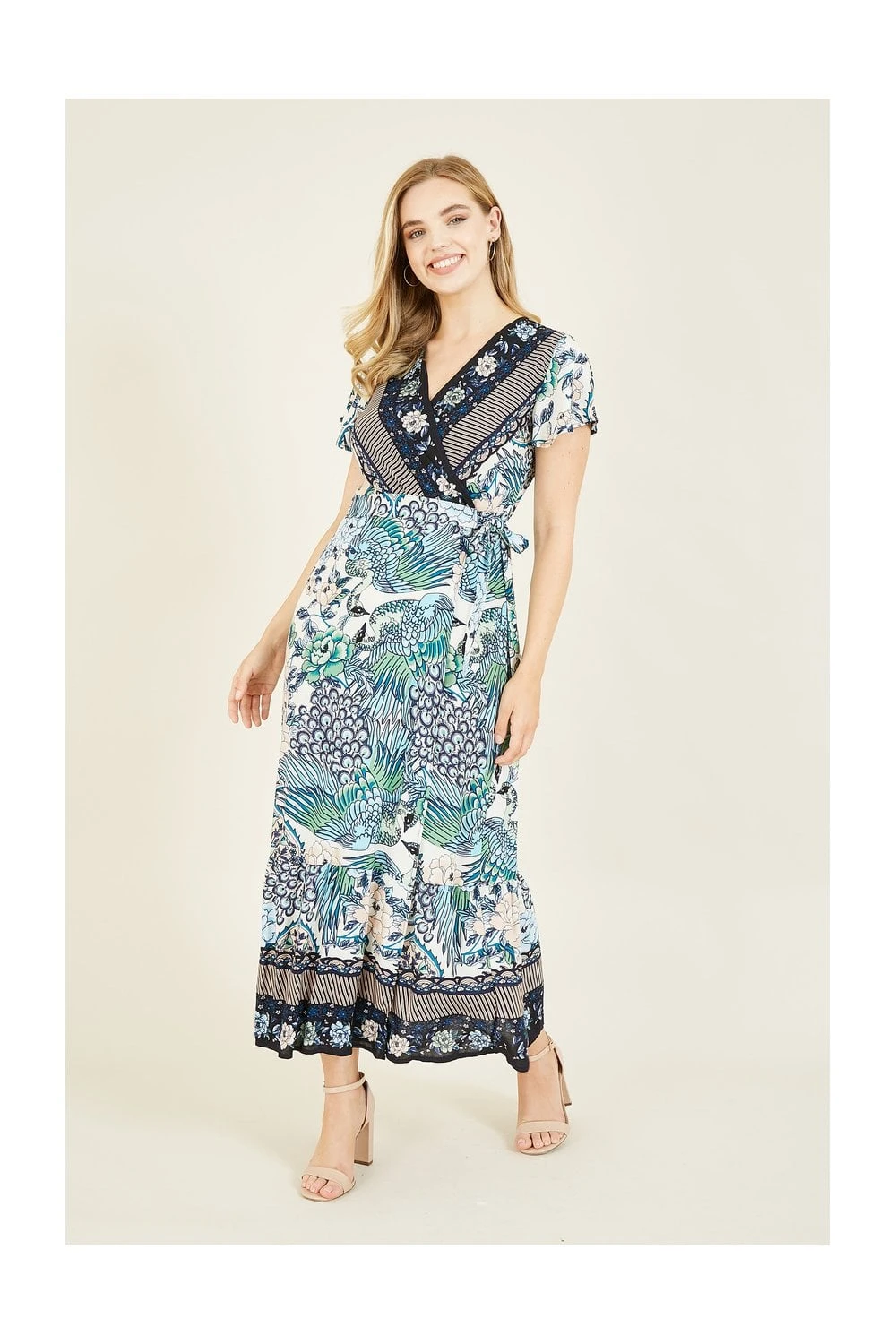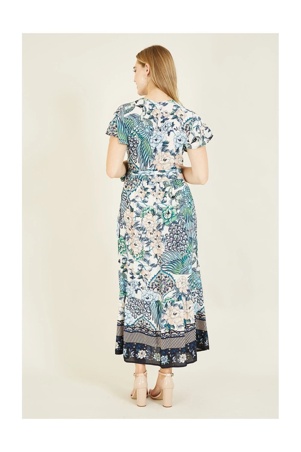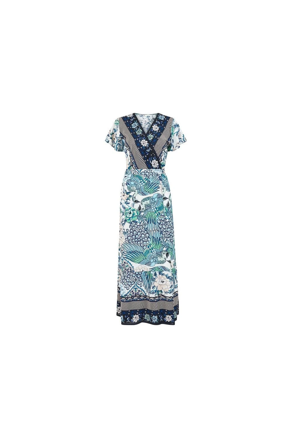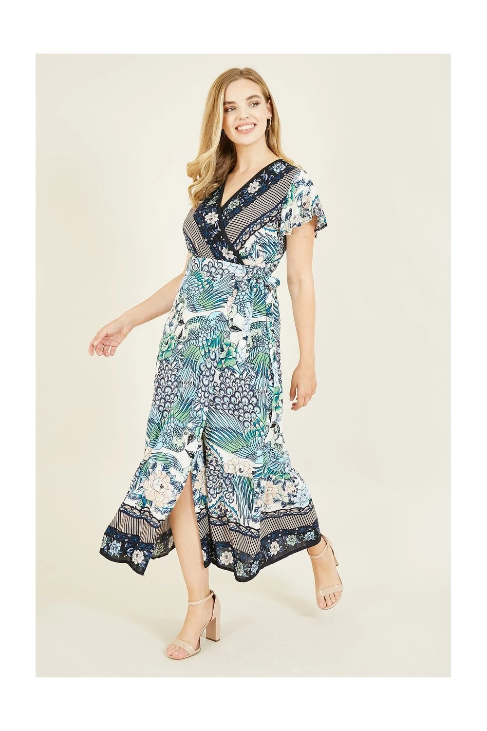 Strut your stuff in this kaleidoscopic Yumi Peacock Print dress. Unique prints are a must this season and this maxi sets the bar high. With a wrap style v neck fit, the cut accentuates your waist before draping elegantly to your ankles. Crafted for breathability on warm days. Match with your favourite jewellery and strappy sandals.