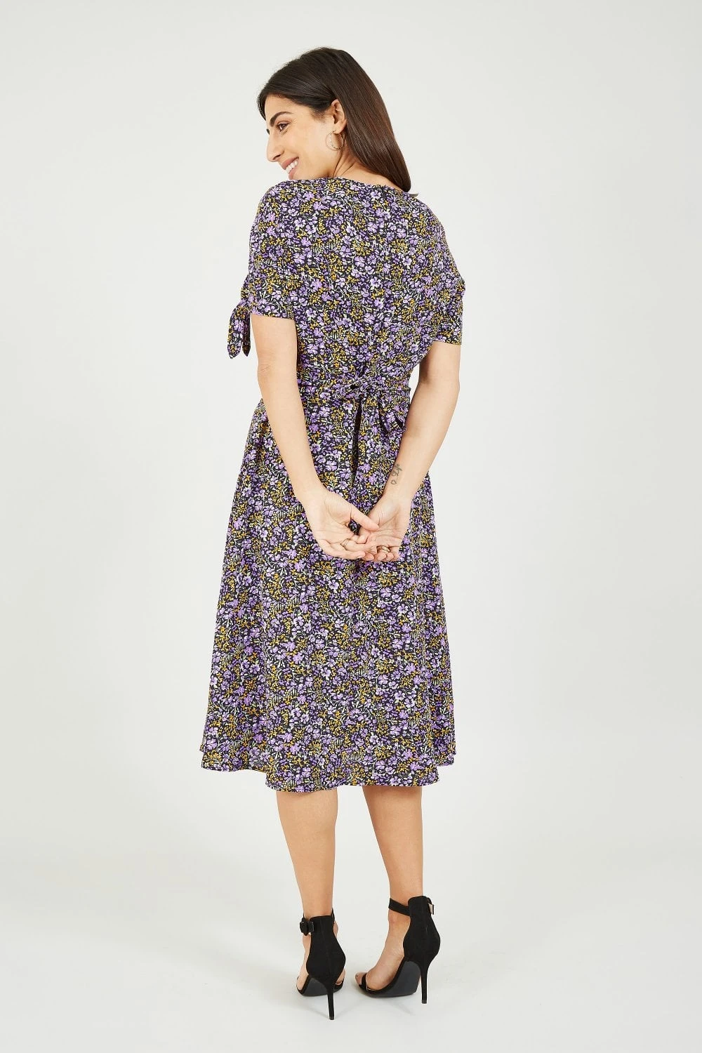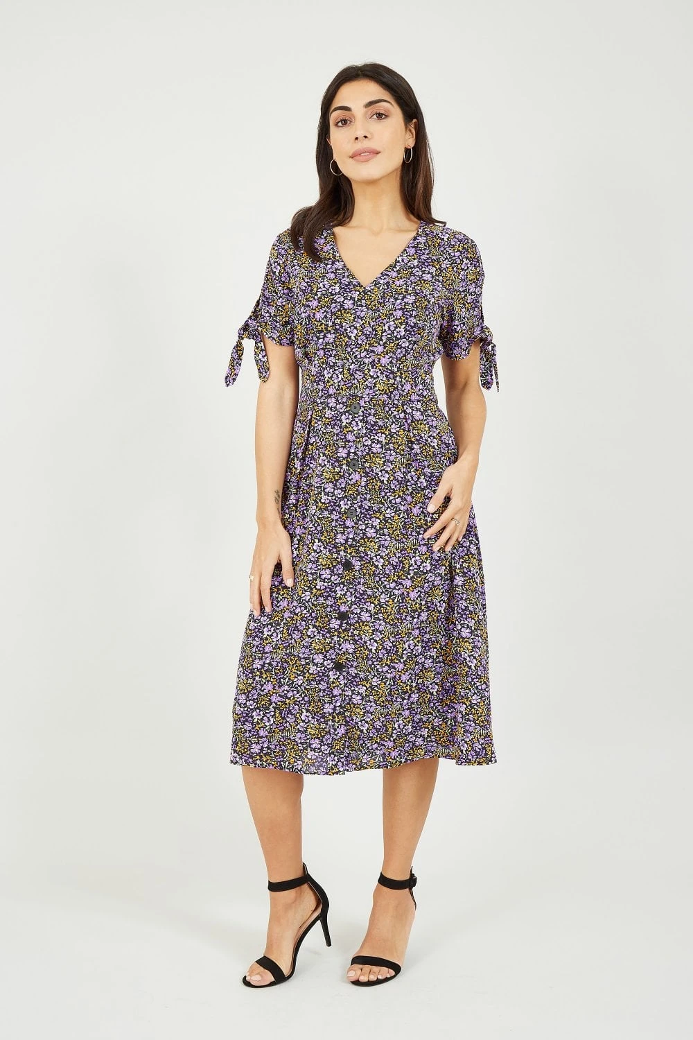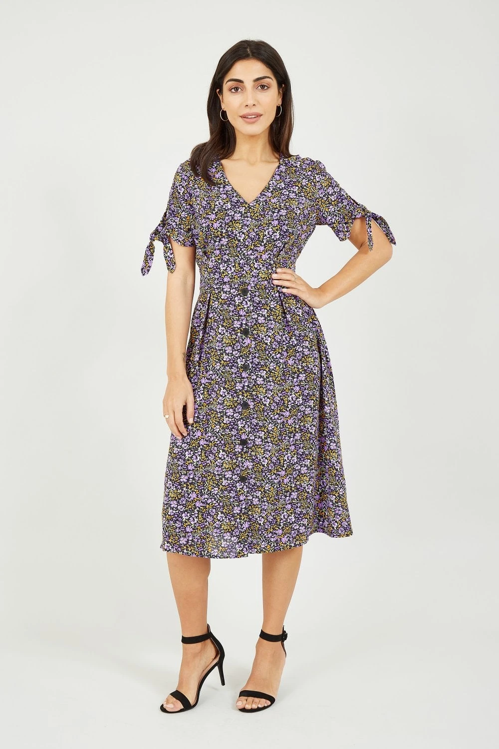 Nothing screams spring more than a stunning purple colourway and intricate ditsy floral print. We simply love this Yumi Purple Ditsy Floral Midi Dress: a classic design with a stunning print. With a v-neck and fitted top, relaxed midi skirt with statement contrast black buttons, zip through fastening to the back, and short sleeves with statement tie detailing, this fit is perfect teamed with black accessories.