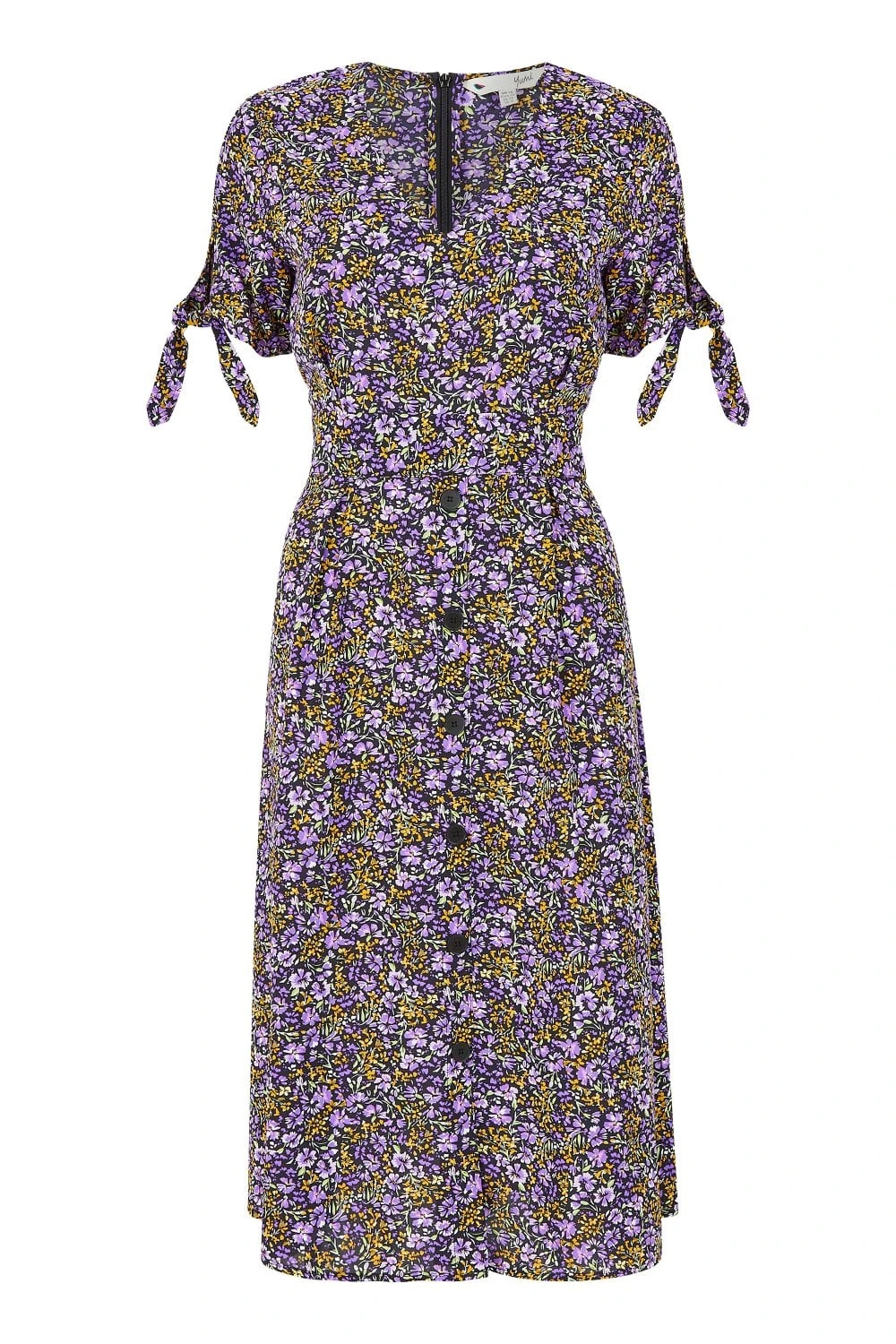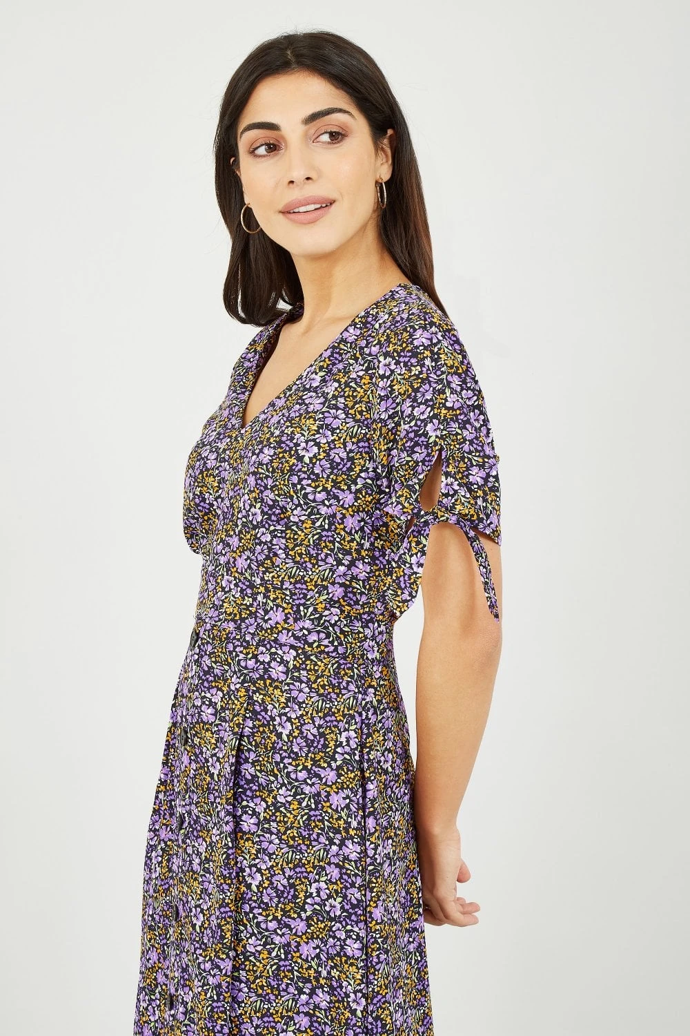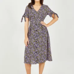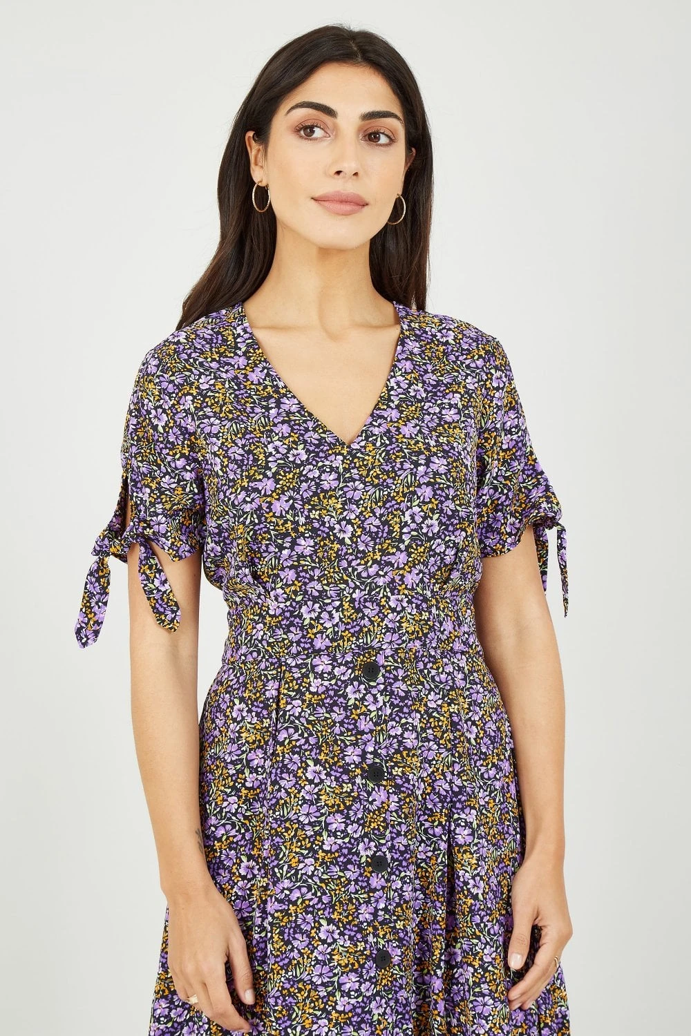 Nothing screams spring more than a stunning purple colourway and intricate ditsy floral print. We simply love this Yumi Purple Ditsy Floral Midi Dress: a classic design with a stunning print. With a v-neck and fitted top, relaxed midi skirt with statement contrast black buttons, zip through fastening to the back, and short sleeves with statement tie detailing, this fit is perfect teamed with black accessories.