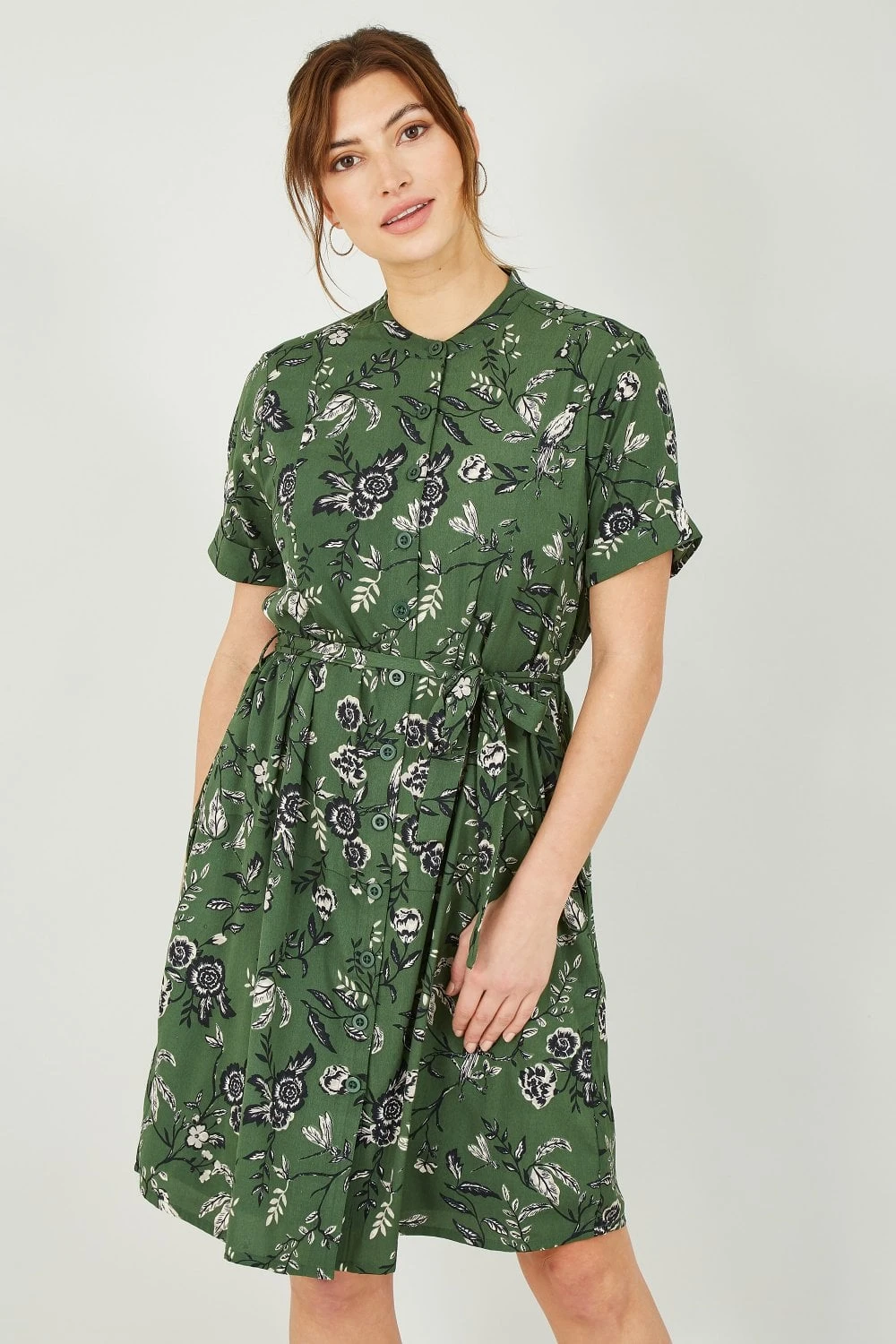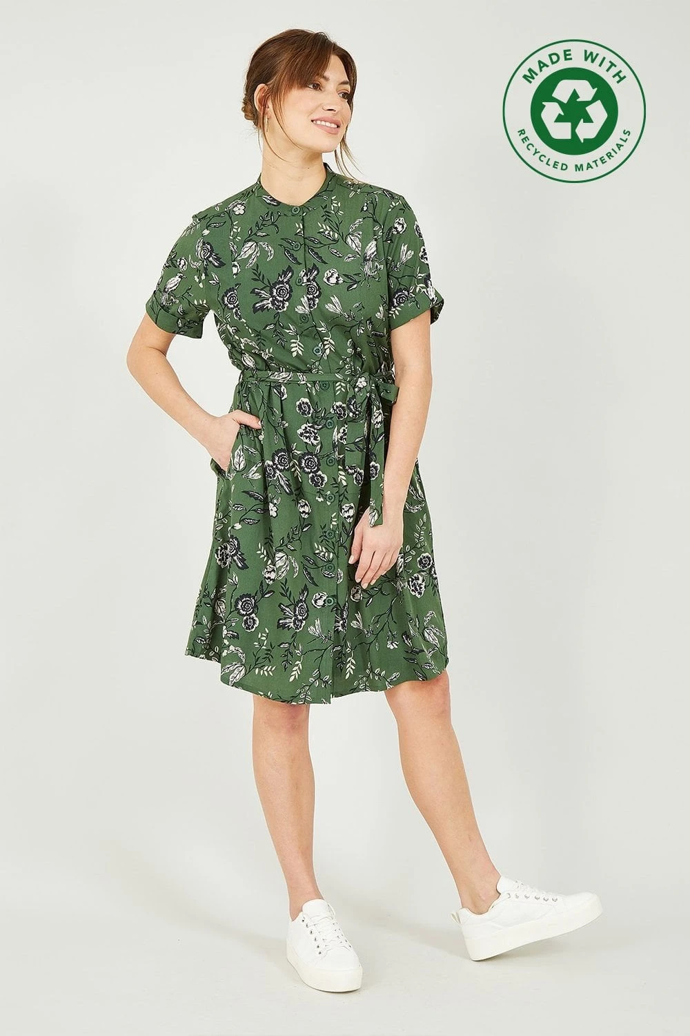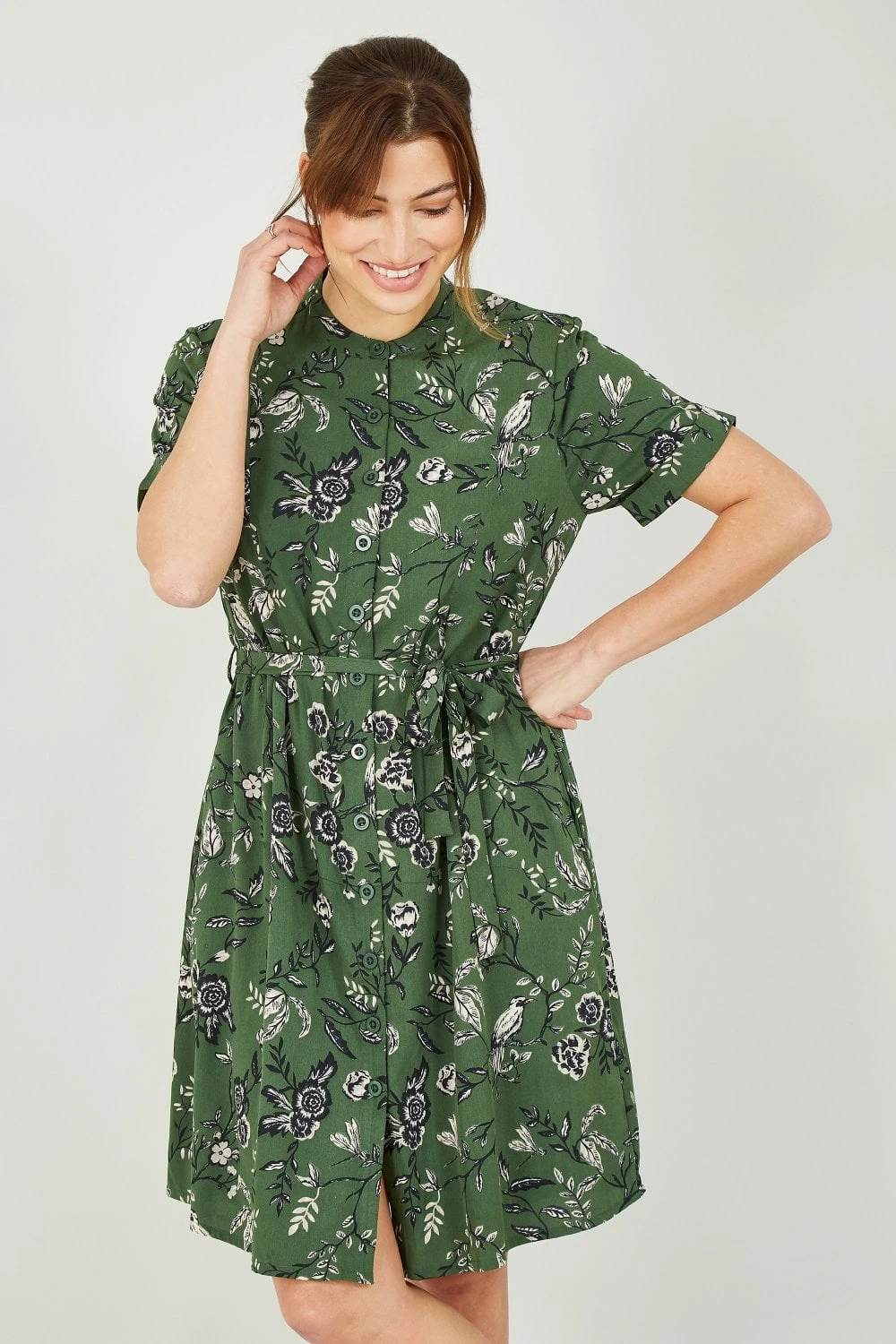 New season style, recycled material. Go green in this striking Recycled Bird Print Shirt Dress by Yumi. A versatile fit, this shirt dress is covered in an all-over super cute bird and floral print, and comes complete with grandad collar, short sleeves with turn-up detail and a waist accentuating tie belt. Perfect office or weekend wear, perfect matched with ankle boots or even dressed up with heels and a leather jacket.
