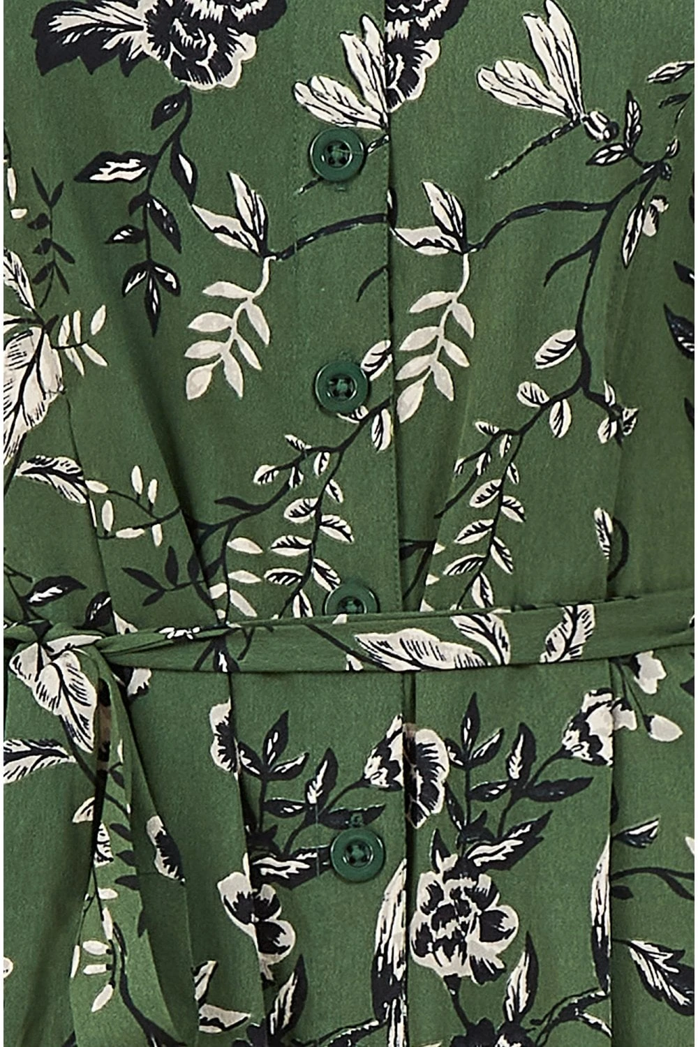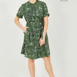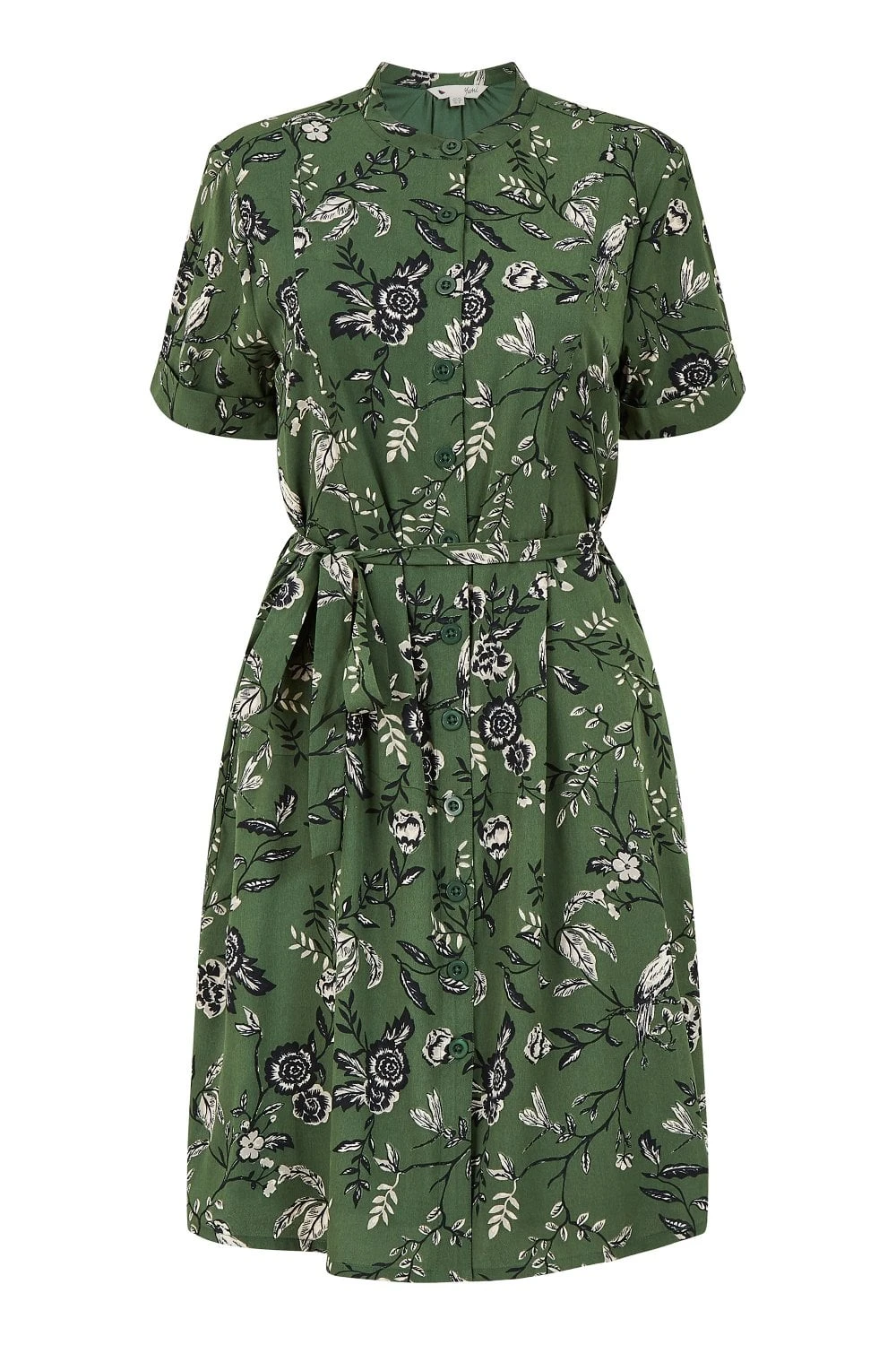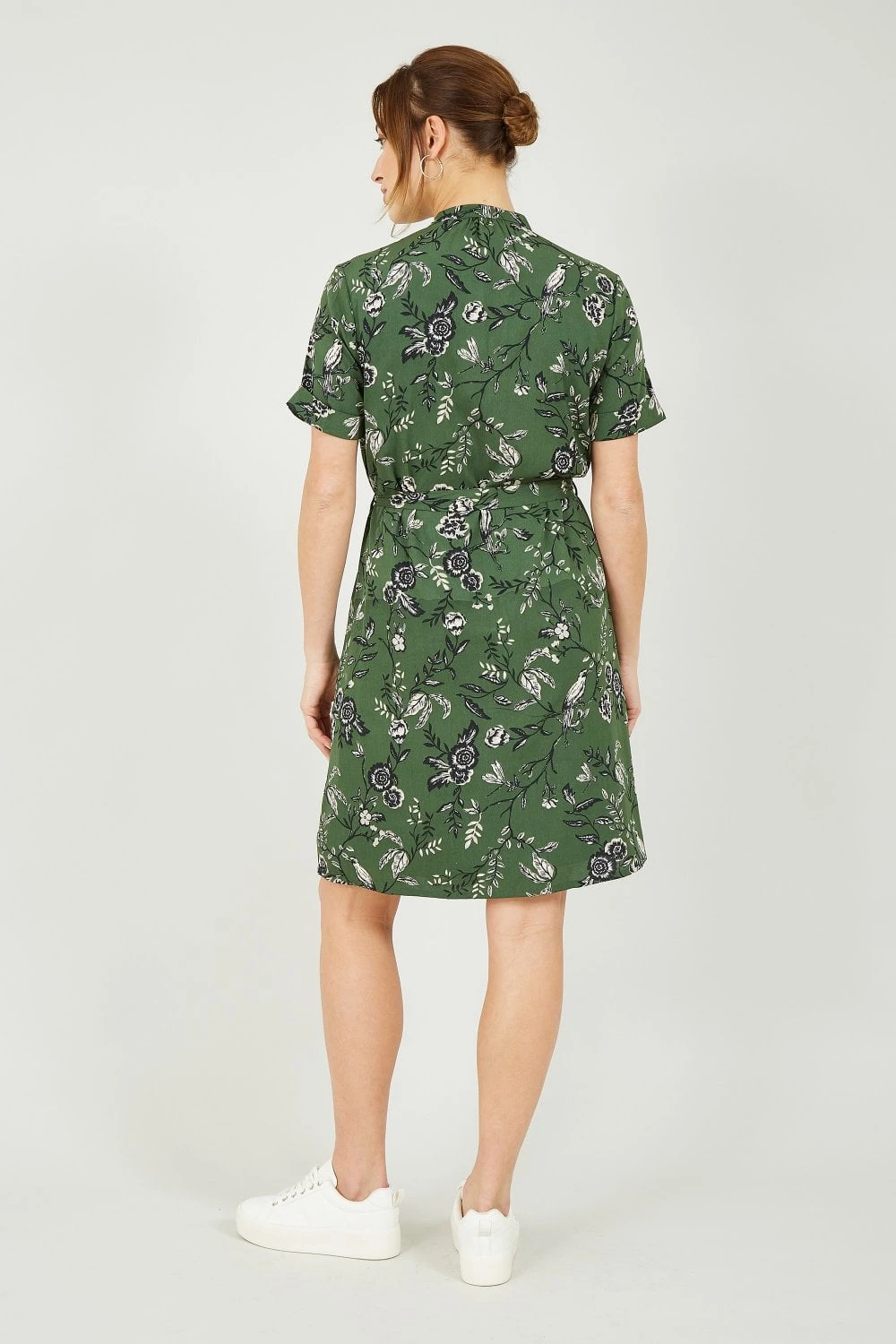 New season style, recycled material. Go green in this striking Recycled Bird Print Shirt Dress by Yumi. A versatile fit, this shirt dress is covered in an all-over super cute bird and floral print, and comes complete with grandad collar, short sleeves with turn-up detail and a waist accentuating tie belt. Perfect office or weekend wear, perfect matched with ankle boots or even dressed up with heels and a leather jacket.
