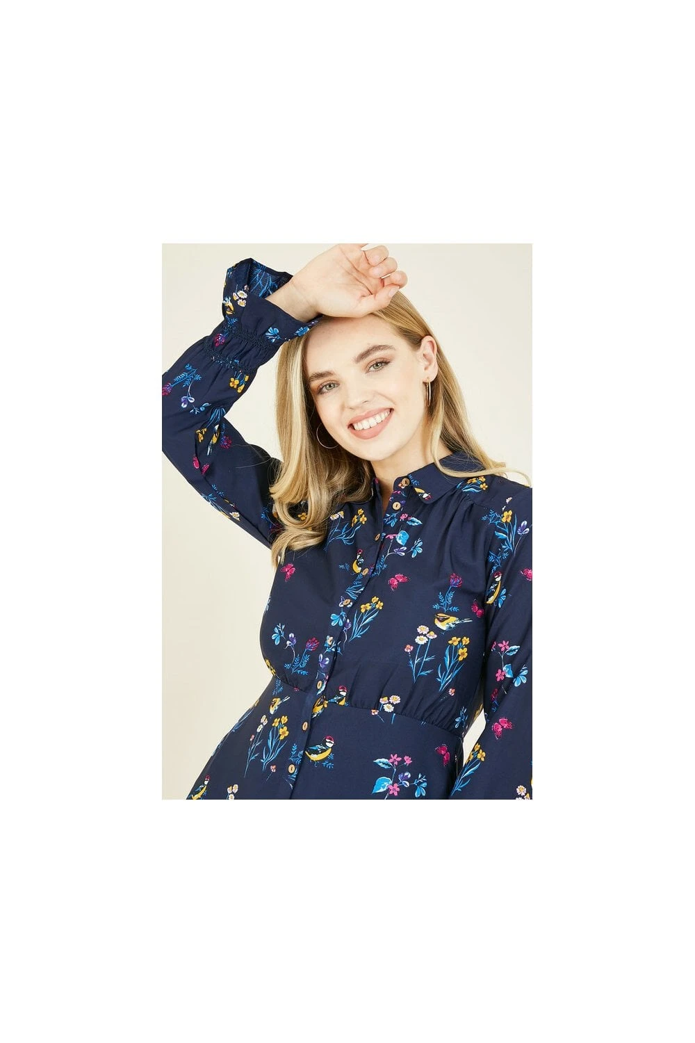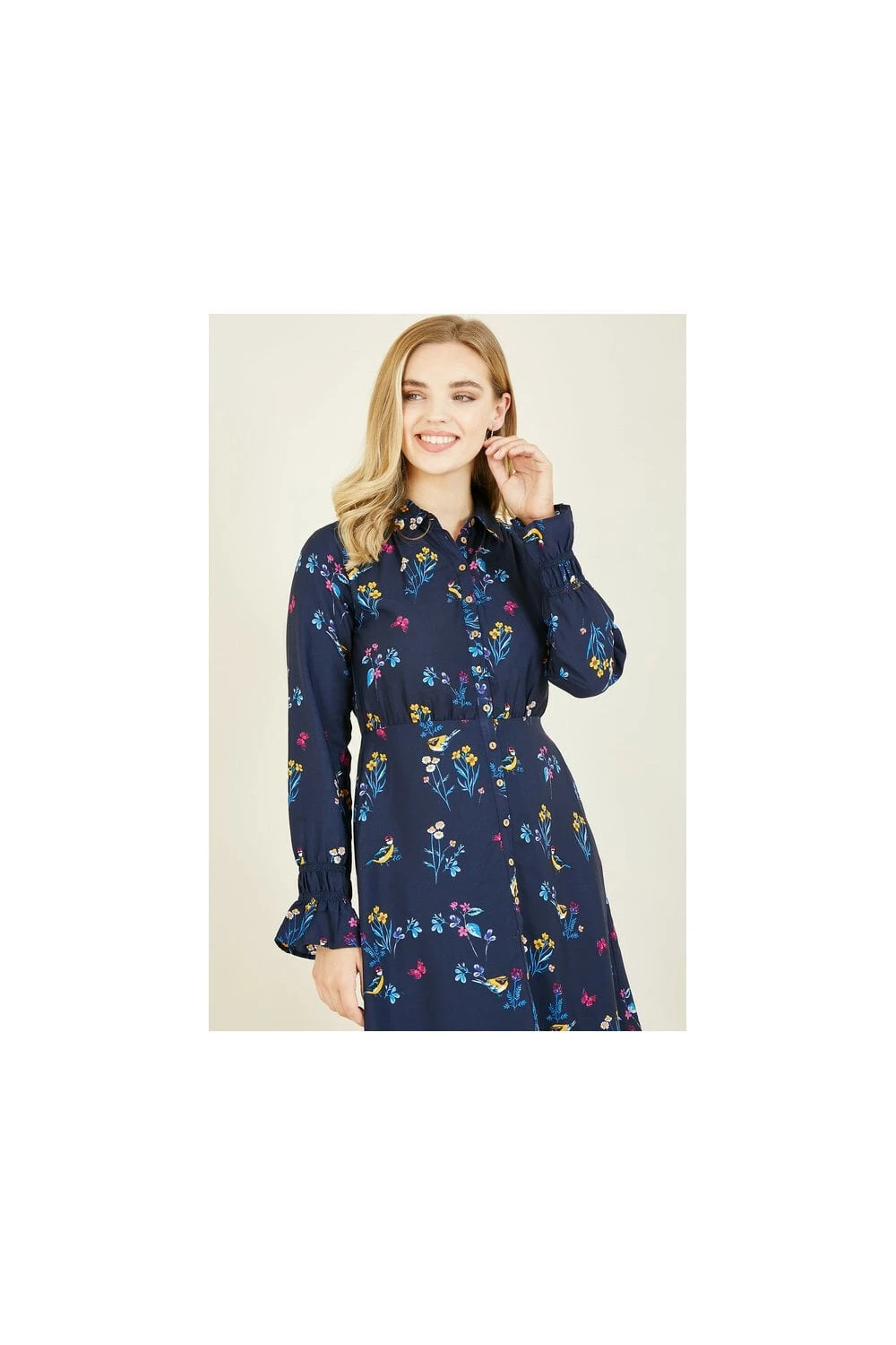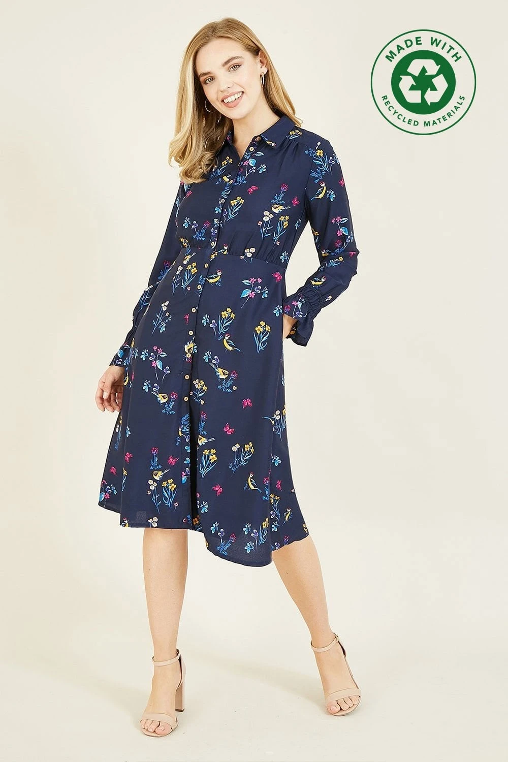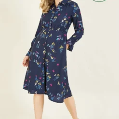 Think stylish but sustainable this season. This Yumi Recycled Navy Bird Print Shirt Dress comes in a classic shirt style shape and features a stunning, all-over bird and floral print, button through fastening, fitted waist and long sleeves with tulip cuffs. Works for the office or weekend wear.