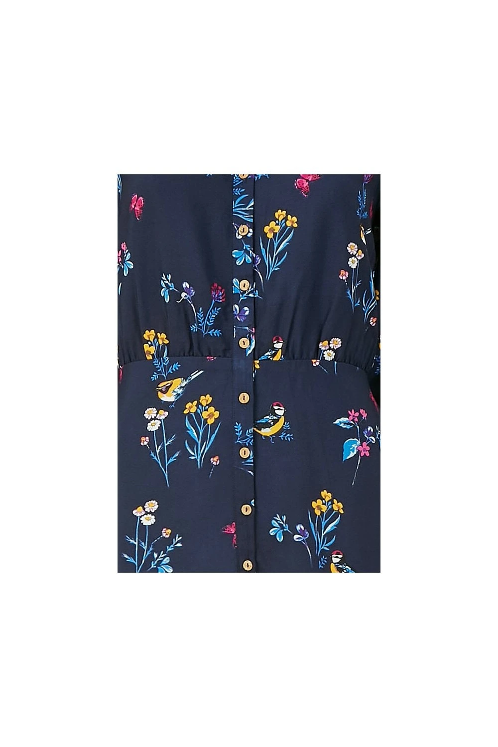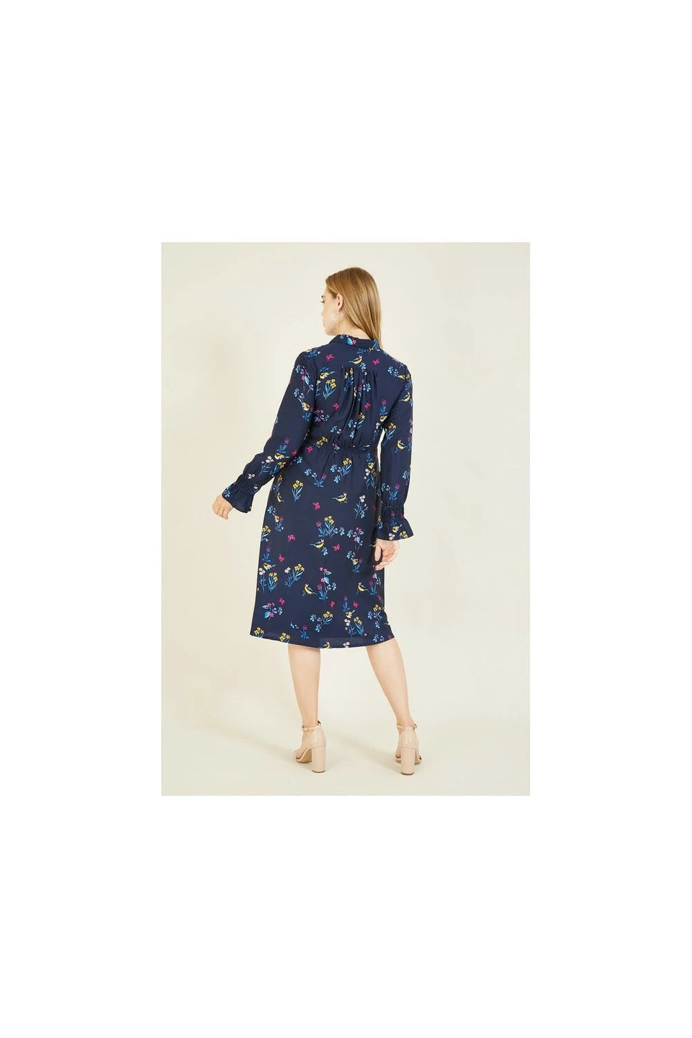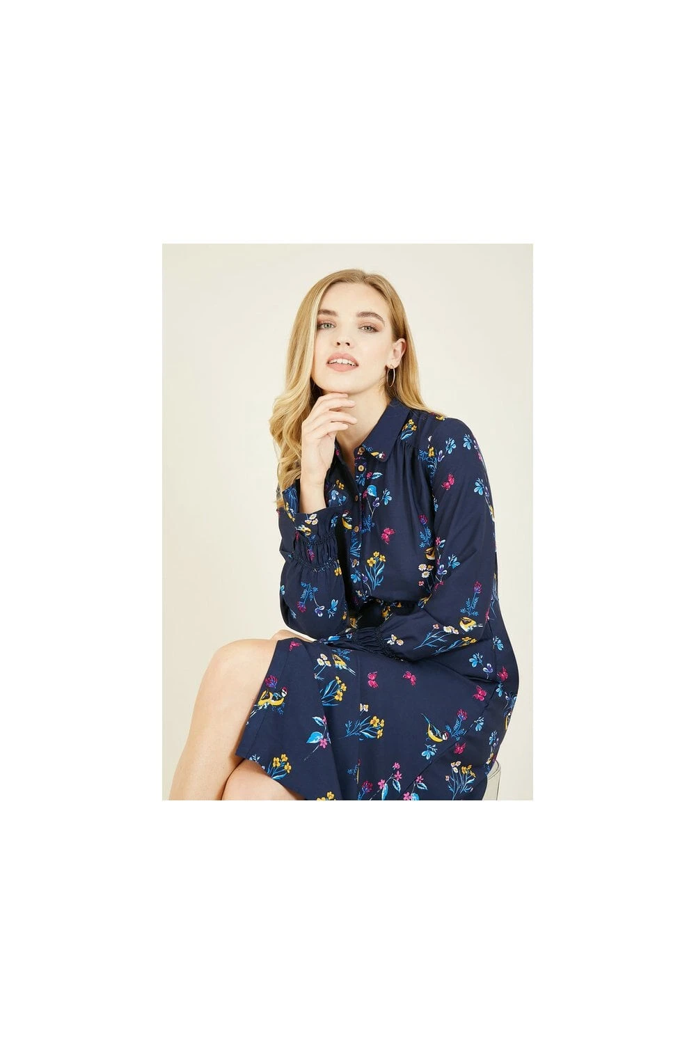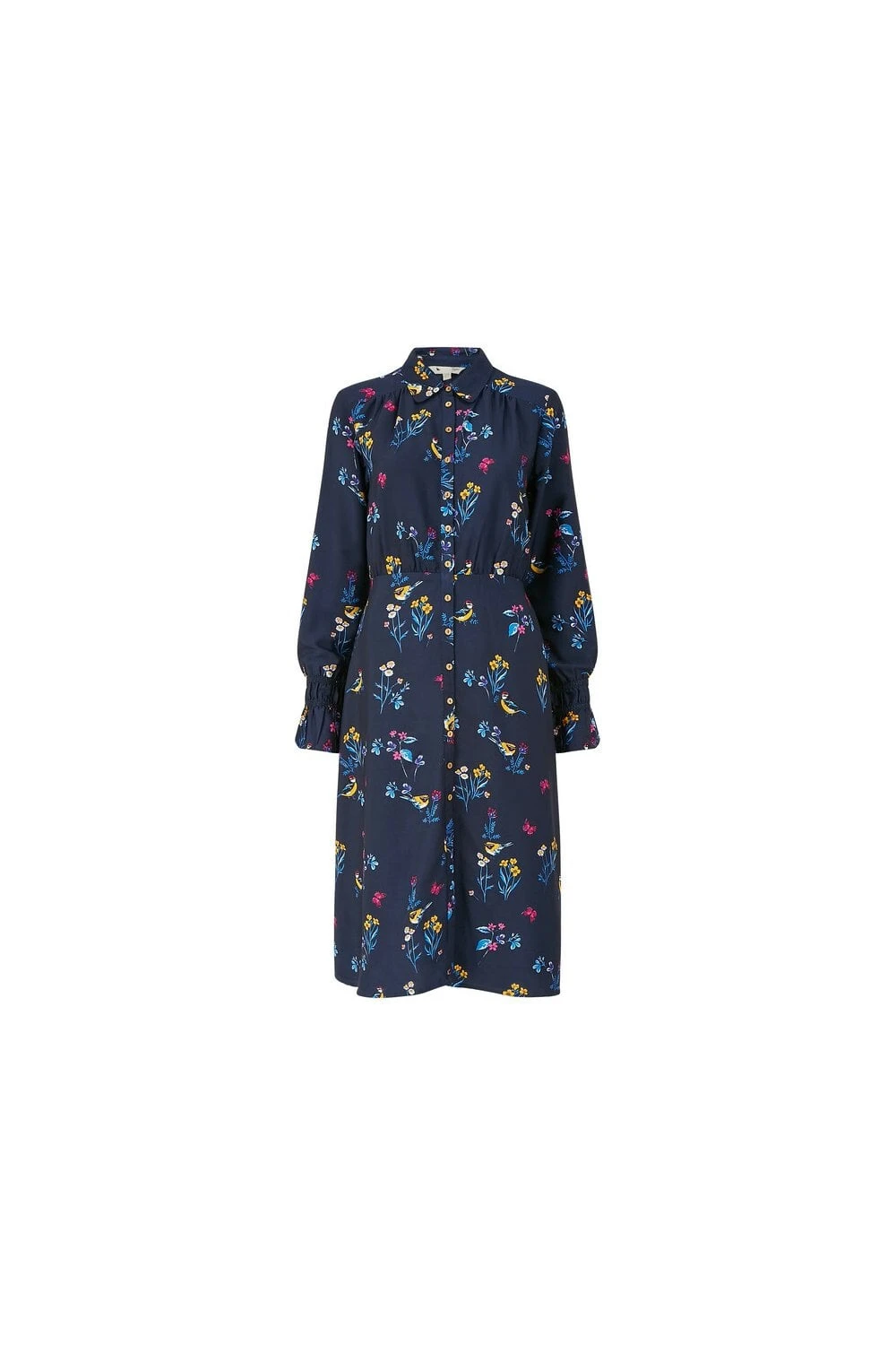 Think stylish but sustainable this season. This Yumi Recycled Navy Bird Print Shirt Dress comes in a classic shirt style shape and features a stunning, all-over bird and floral print, button through fastening, fitted waist and long sleeves with tulip cuffs. Works for the office or weekend wear.