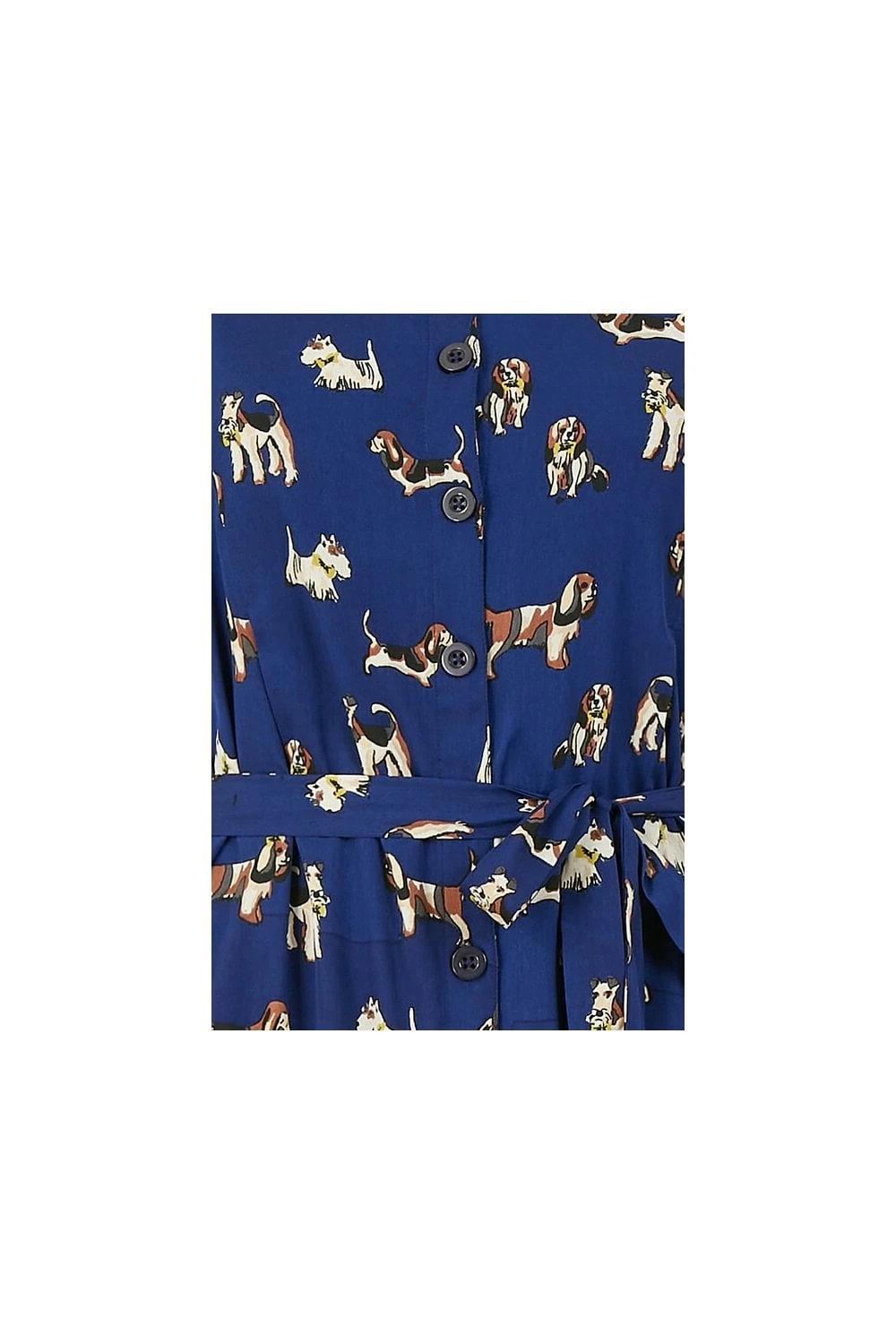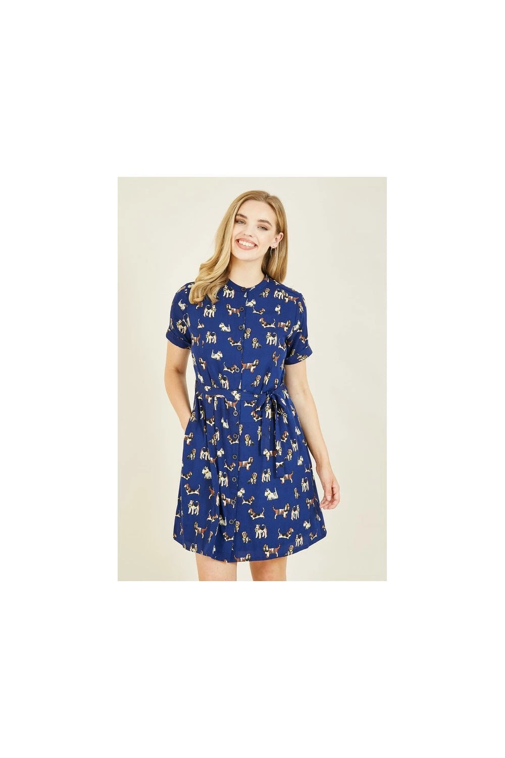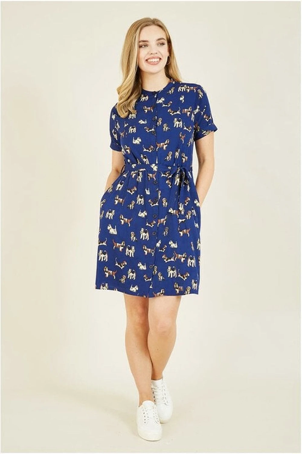 Featuring deep pockets, an on-trend grandad collar and a classic shirt cut, this Yumi Navy Dog Print Recycled Shirt Dress is covered in a super cute, Yumi designed dog print. Sustainable as well as stylish, this dress is crafted from recycled material. Perfect layered over tights.