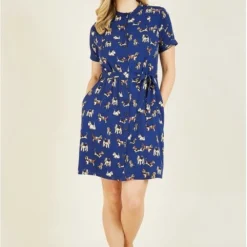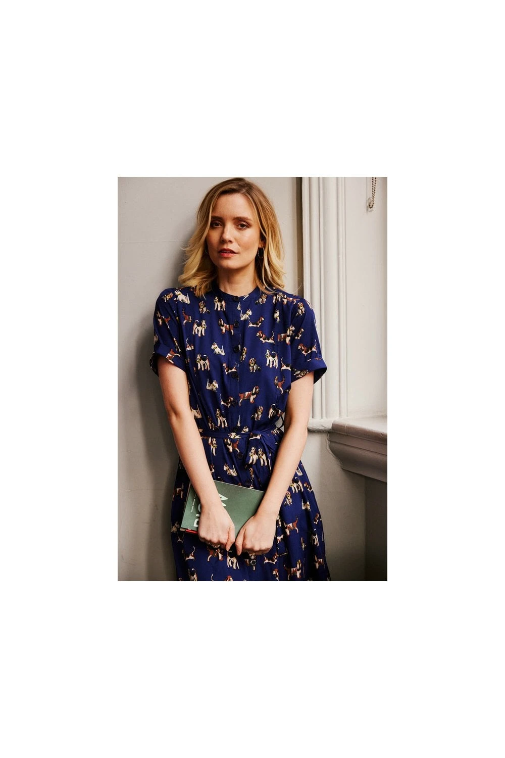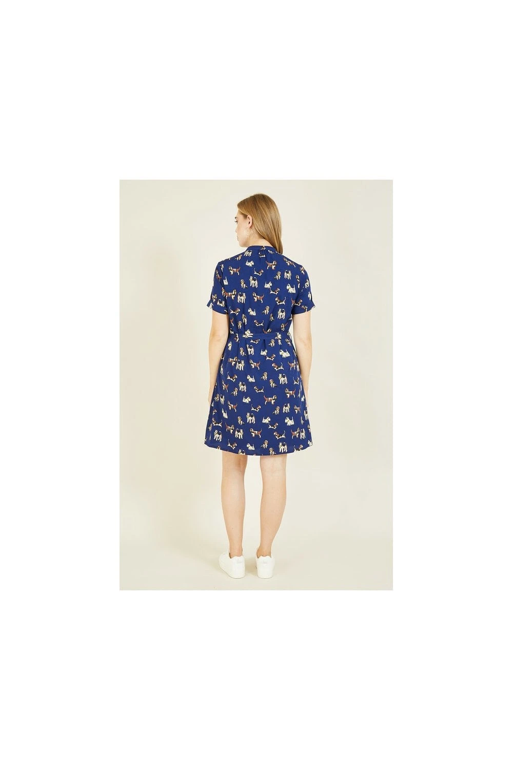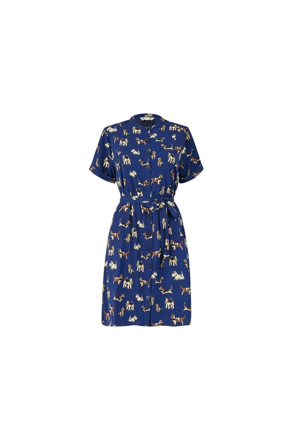 Featuring deep pockets, an on-trend grandad collar and a classic shirt cut, this Yumi Navy Dog Print Recycled Shirt Dress is covered in a super cute, Yumi designed dog print. Sustainable as well as stylish, this dress is crafted from recycled material. Perfect layered over tights.