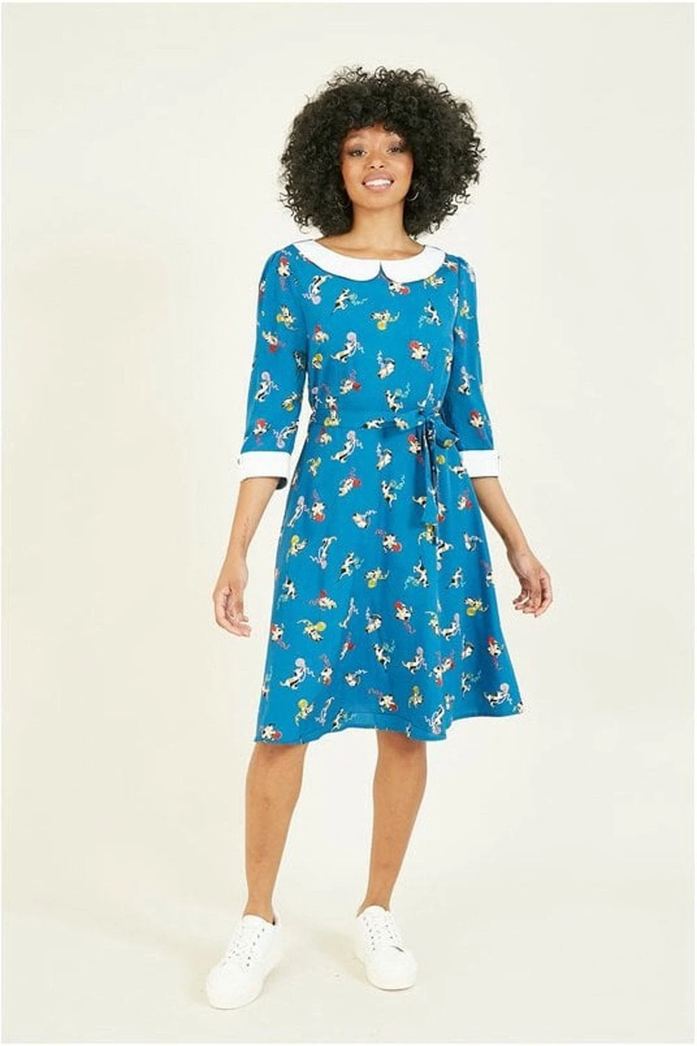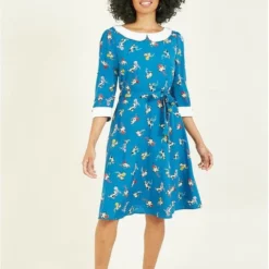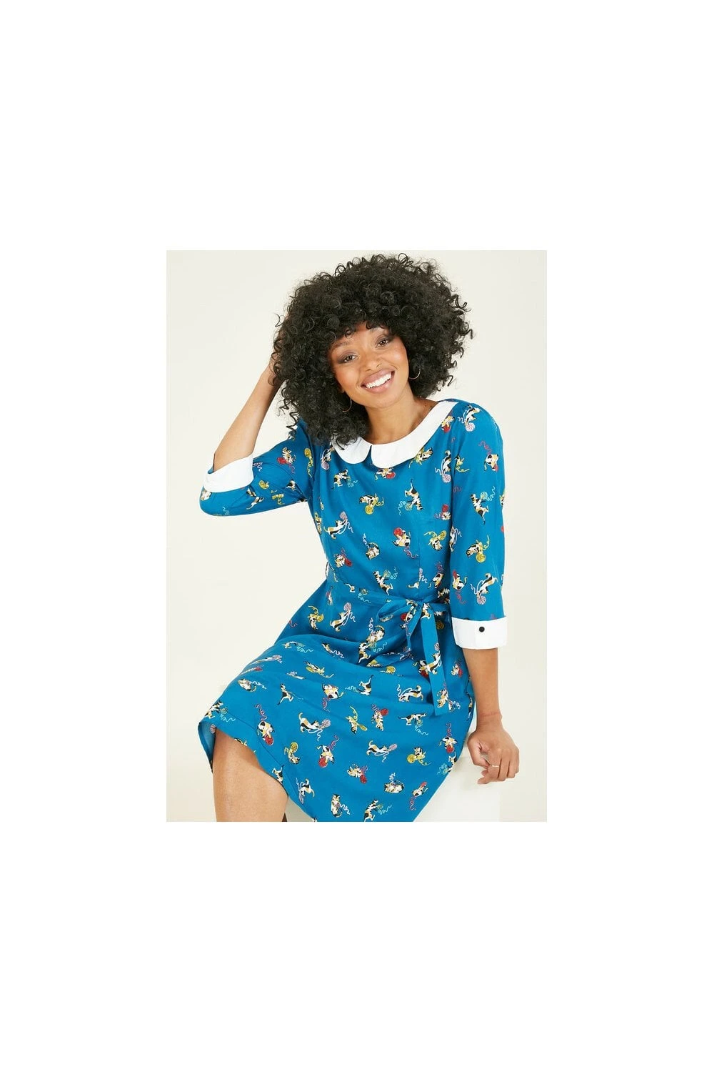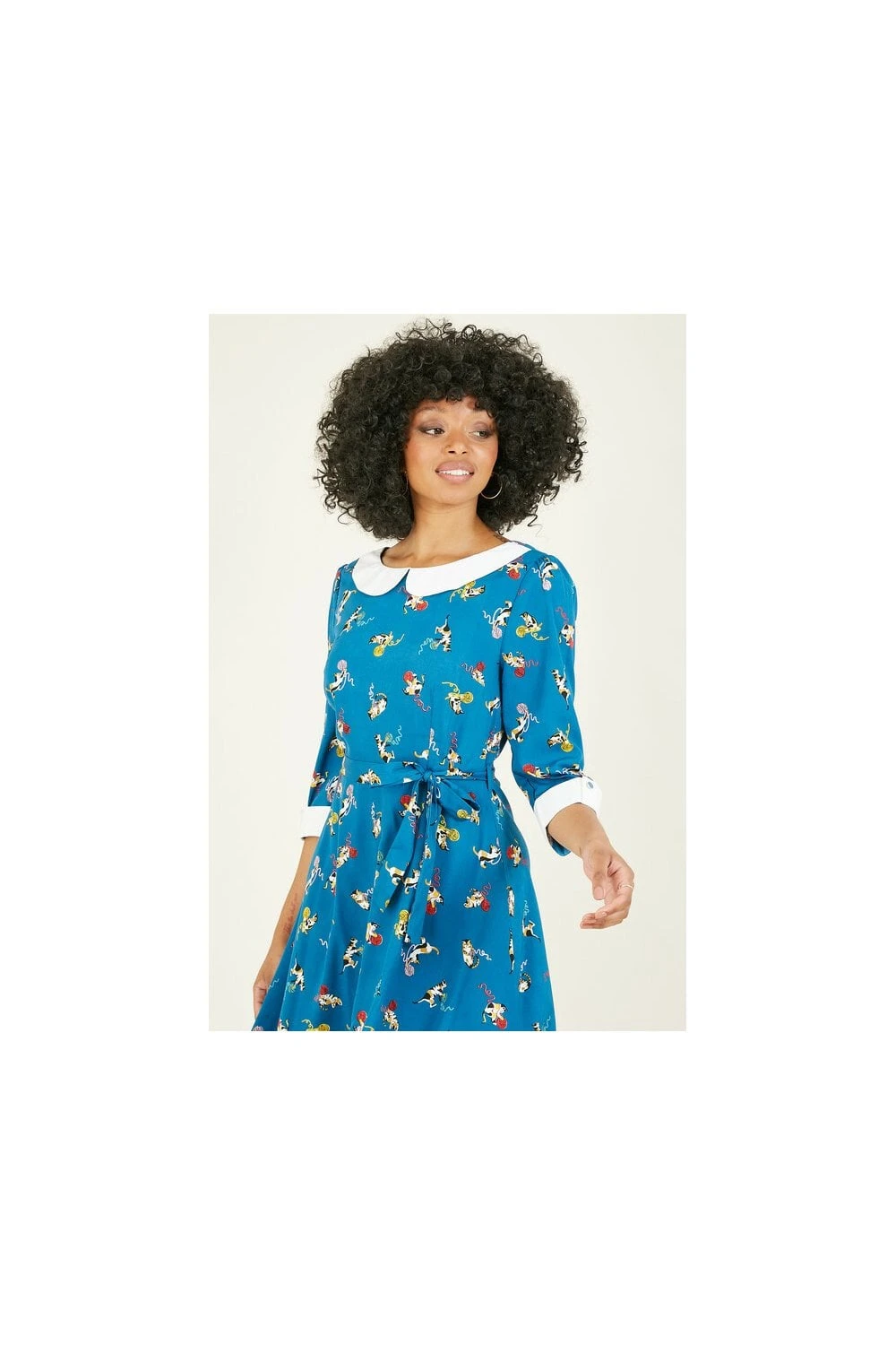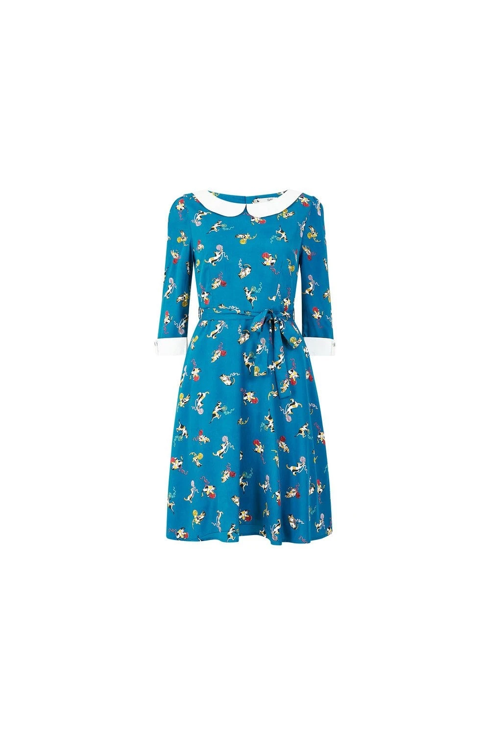 Keep it cute in this gorgeous Yumi Teal Cat And Wool Print Skater Dress. Comes with an adorable all-over cat and wool print, with a statement white peter pan collar and matching white cuffs. Shapes your figure with a waist tie belt. The perfect dress to see you through the seasons. Match with kitten heels, ankle boots or sneakers to complete the look.